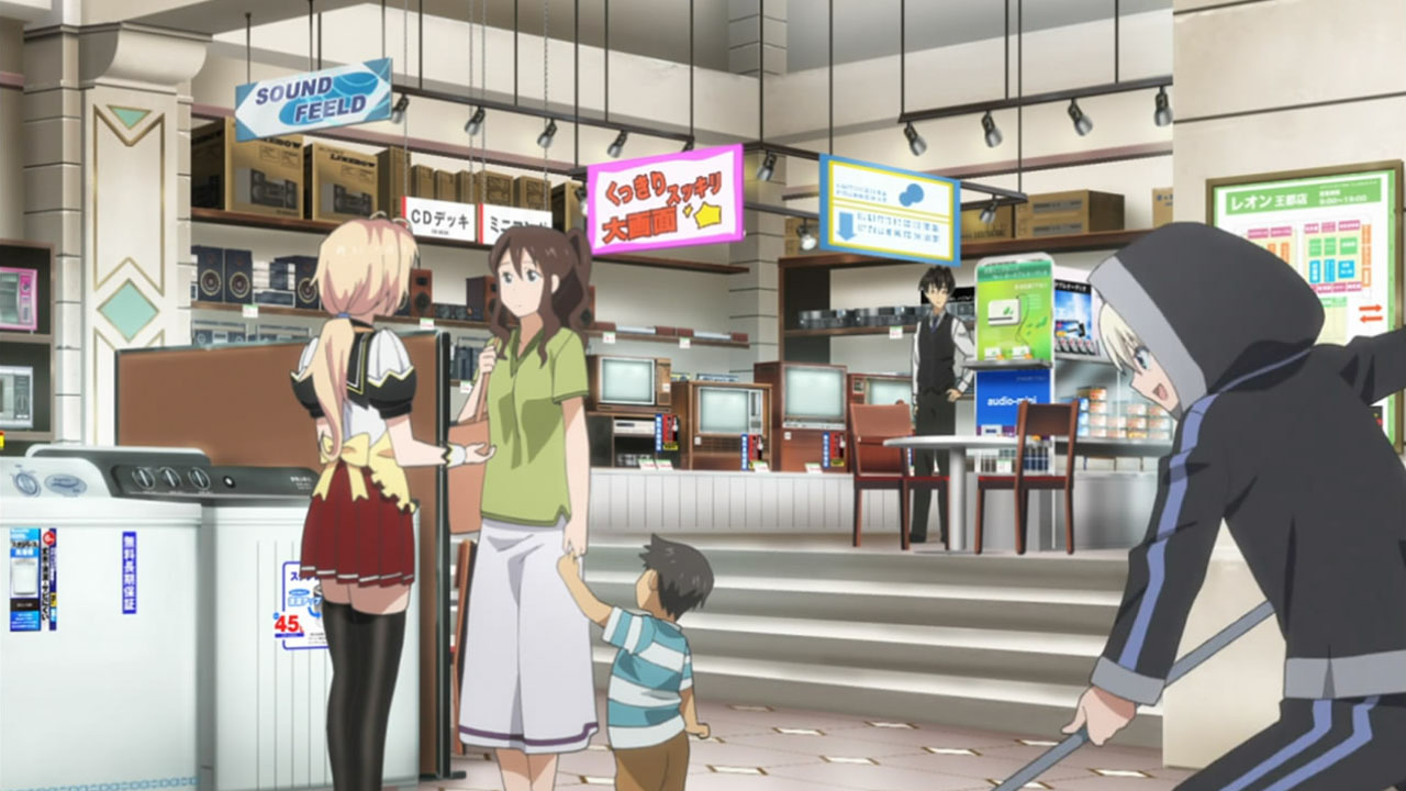 So far, I’m a little torn about this show. But in this show, something just smacks of lazy non-caring. I try to swallow how the world is full of modern looking devices all powered by magic, but then it runs counter to how the weapons and armor in the beginning were purely medieval fantasy-ish. The difficulty of manufacturing a television or hairdryer, especially a mass-produced one, (even when powered by magic), is SO far above that of making a staff or sword it’s not even funny. It seems absolutely ridiculous that in this world, they didn’t invent some sort of magic gun, or magic 120 mm cannon for their heroes to use. Also, it’s hard to feel sympathy for the hero in this story for being out of the job he was training for. By definition, as soon as he succeeds in defeating the maou, he’s no longer needed. His having to find a new job was going to happen sooner or later.