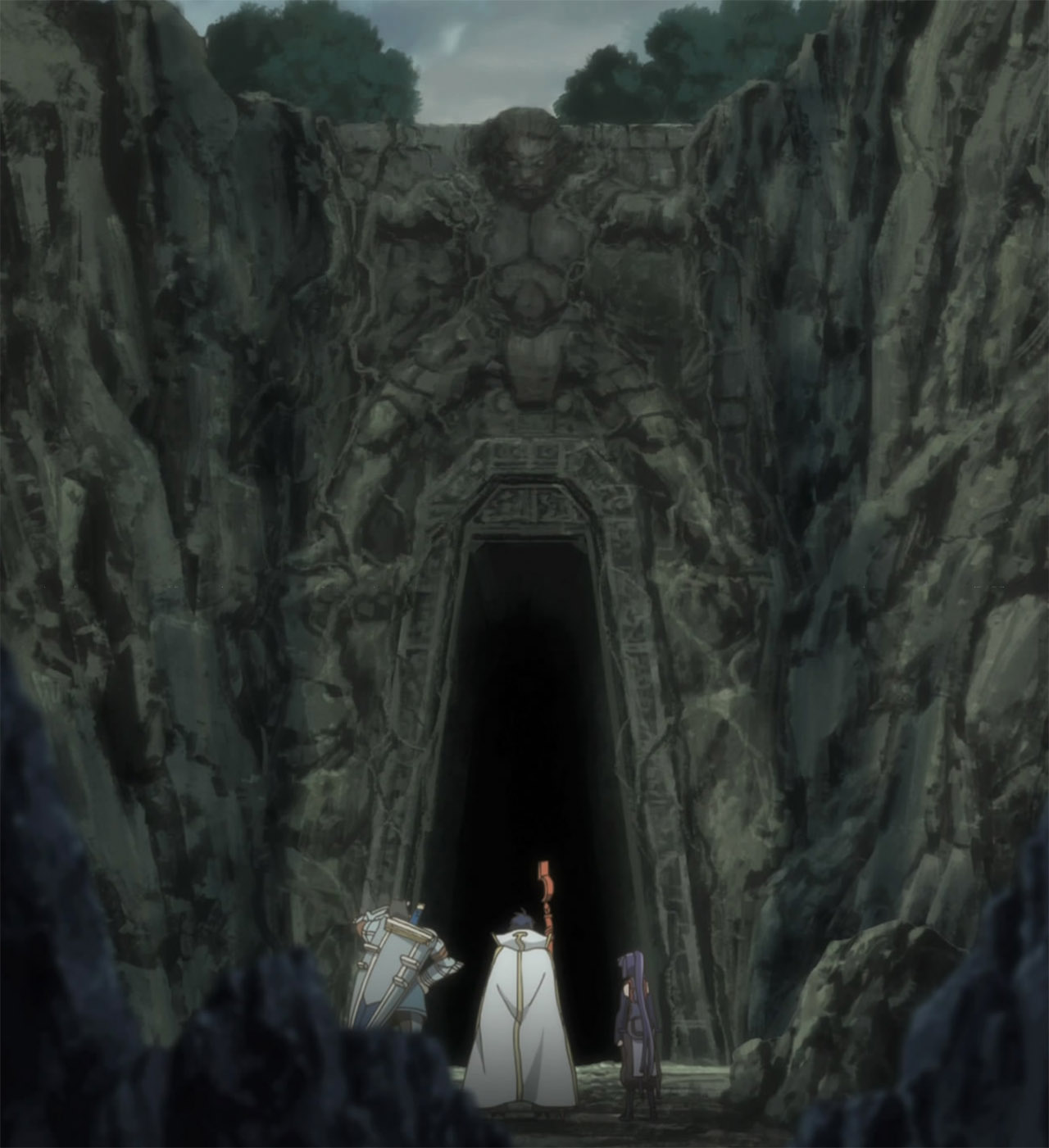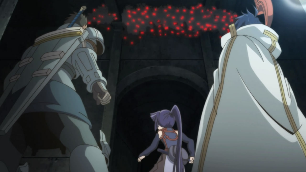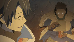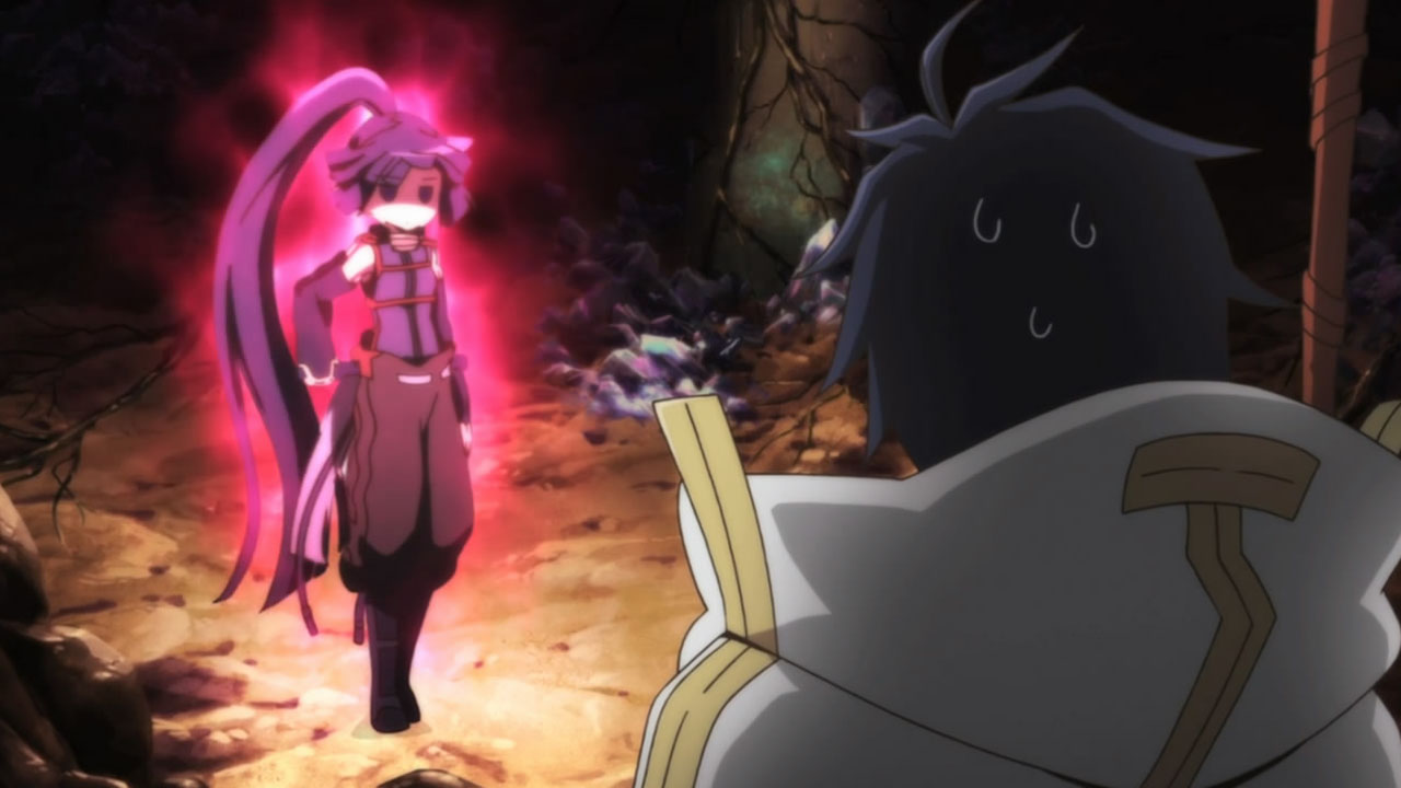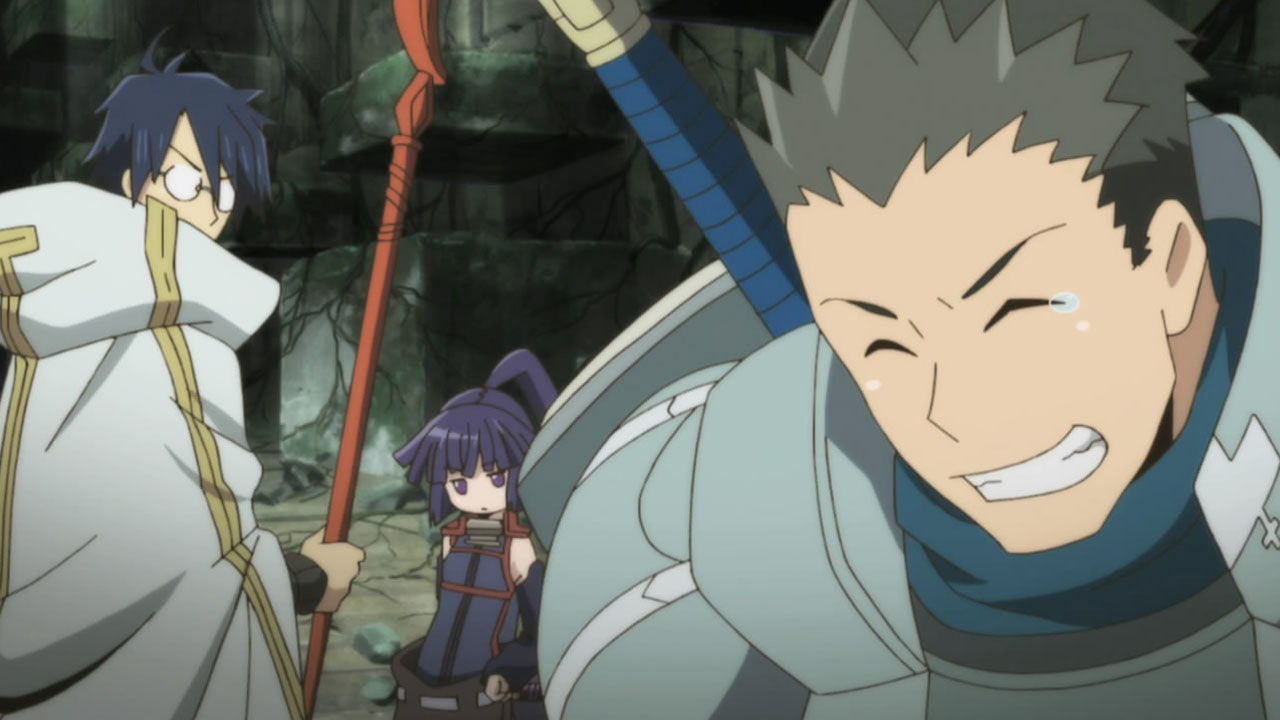 Was I the only one who was extremely thrown off by the shift from Shiroe falling off the bridge alone and musing on his potential death and resurrection in town -TO- Shiroe’s flashback -TO- the three walking reunited further along in the cave with no explanation at all for how he got back up? I spent the entire second half of the episode trying to figure out if we had ever returned to present time or were still in a flashback, before finally deciding they just skipped explaining it and put them all back together.Also, nice catch on Mr. Neko-san in the flashback. I suspected he would be an old Debauchery Tea Party comrade of Shiroe’s, but didn’t actually notice him myself on the side there.