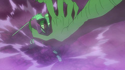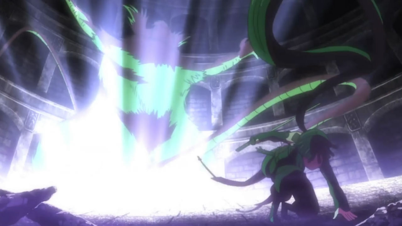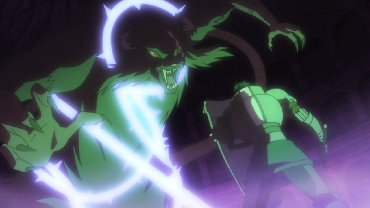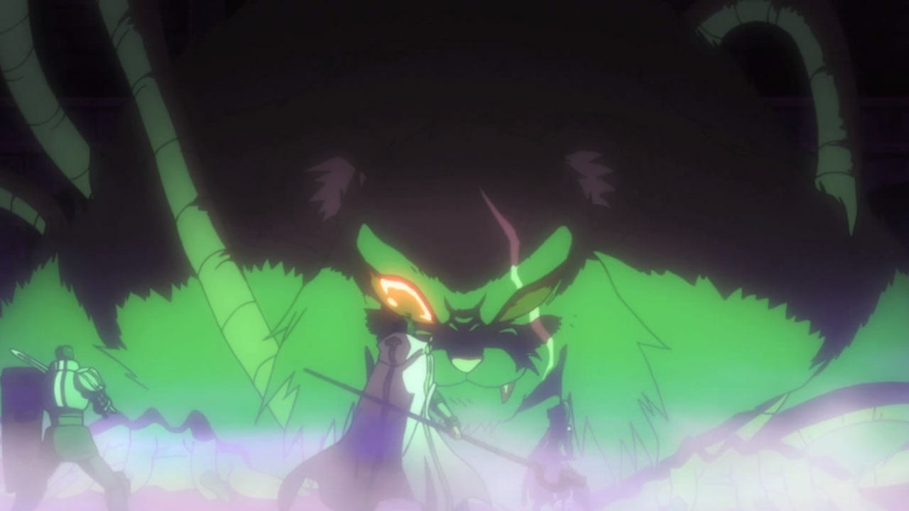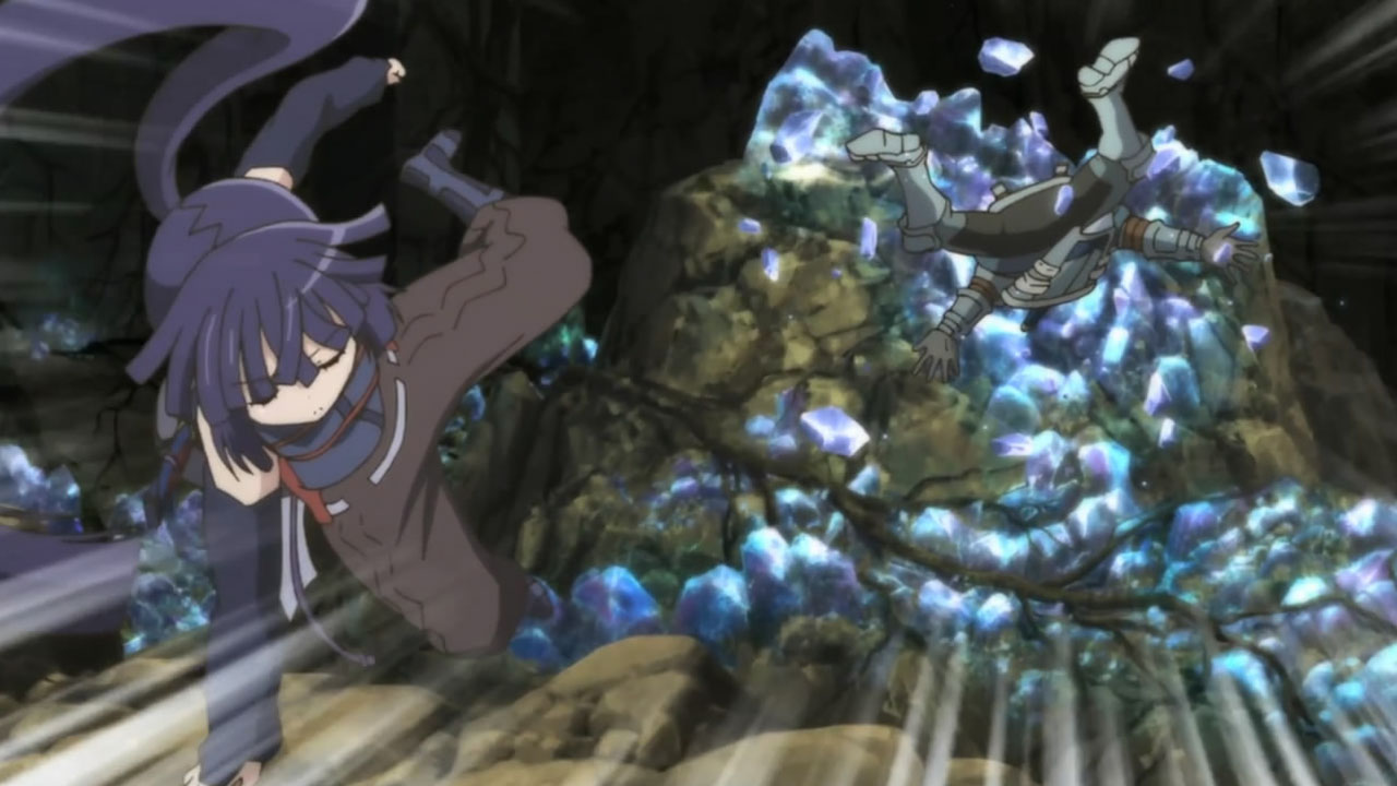 I liked the fight with the big raid boss rat thing, though the actual combat was fairly textbook MMORPG boss battle fare, save no one was howling for a healer because, well, they dodn’t have one (and it was only Lv 68, so it was a bit of a chump). What I liked was the insinuation that once again, this world isn’t as “game-y” as they thought, and that the purple mist coming off the new raid boss was what was making the dungeon fall apart. It could be a feature or it could be a bug, or this all could be more real than many characters expect. Either way, Shiroe was a badass as usual. A scary, scary badass.
