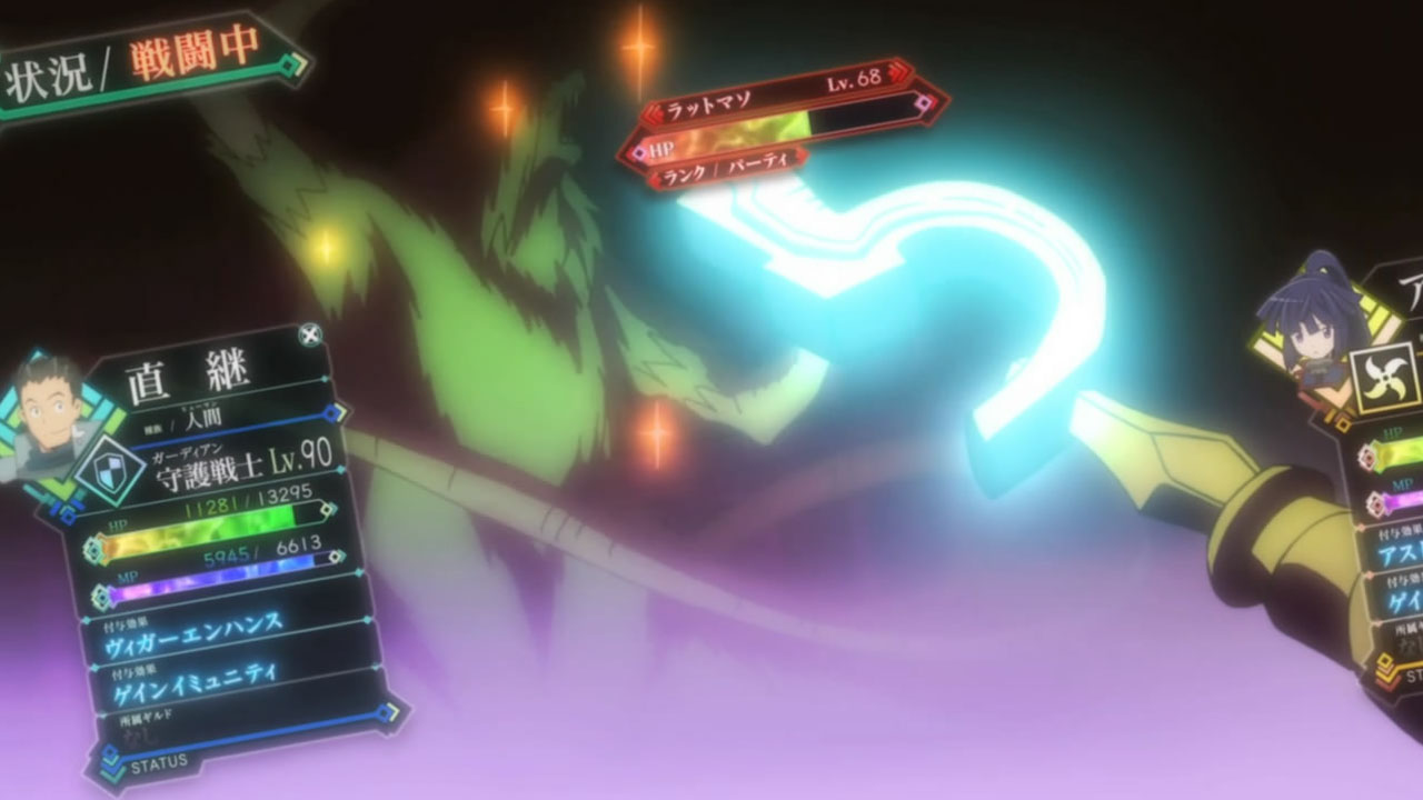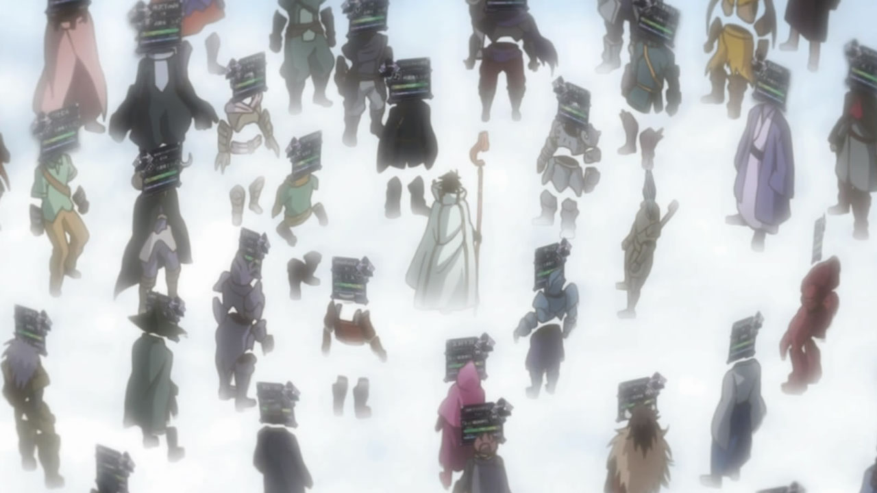 It’s one of the quirks I am enjoying about this. I can relate through my Runescape days where the only real purpose for food was either to use as HP or sell (cooking was the first skill I maxed just so I could bake cakes :P).As an aside I also put some thought into the mechanics of what’s been presented so far. Standard HP and MP, where 0 HP is death; resurrection upon death at standard location. No indication of how MP is used, but the game screen clearly shows it; I expect it can also run out and similarly recovers through walking (unless Shiroe hasn’t been showing us his best spells yet). Characters are divided into a known class and sub-class which appears to bestow all the expected things: strength, HP/MP pool, abilities/magic, equipment options differences to encourage specific play styles. Levelling up of the respected classes is done through repetition rather than division of points from one XP pool (Serara’s levelling up during this episode through housekeeping confirms this).Except for the guild mechanics there’s not much else needing to be figured out. Loot appears to be the standard money and potions, equipment and weapons can be purchased from shops in towns. Not clear yet if there is treasure in dungeons, but then we have really only seen one.Hopefully next week we will see some more on how the mechanics of guilds and the towns work.