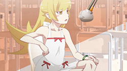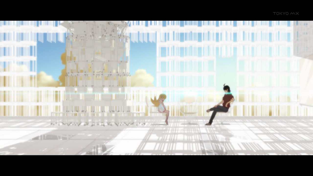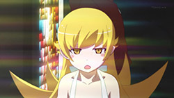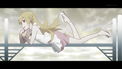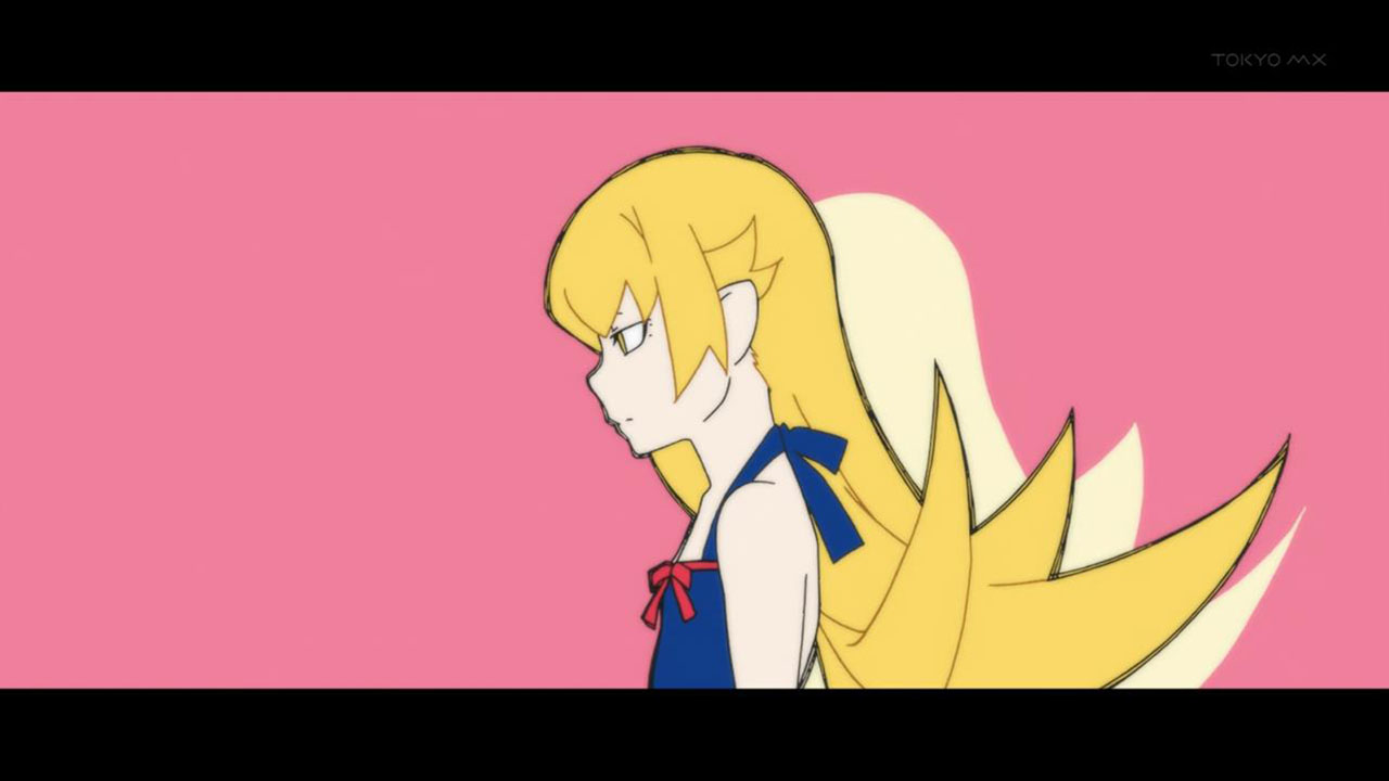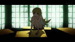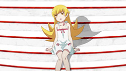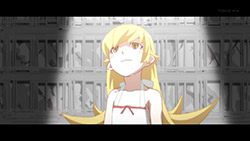 Cybersteel, that’s not what I meant regarding Shinobu’s flashback. I’m not asking for full animated scenes. Yes, Shinobu doesn’t remember much, but there’s got to be something better than the use of a long rolling still image.You know, the use of all sorts of moving geometric shapes and silhouettes would do just fine and would make Shinobu’s narrative less static.Once again, please refer to the scene in Episode 5 where Hanekawa narrates her letter to Black Hanekawa to understand what I mean.