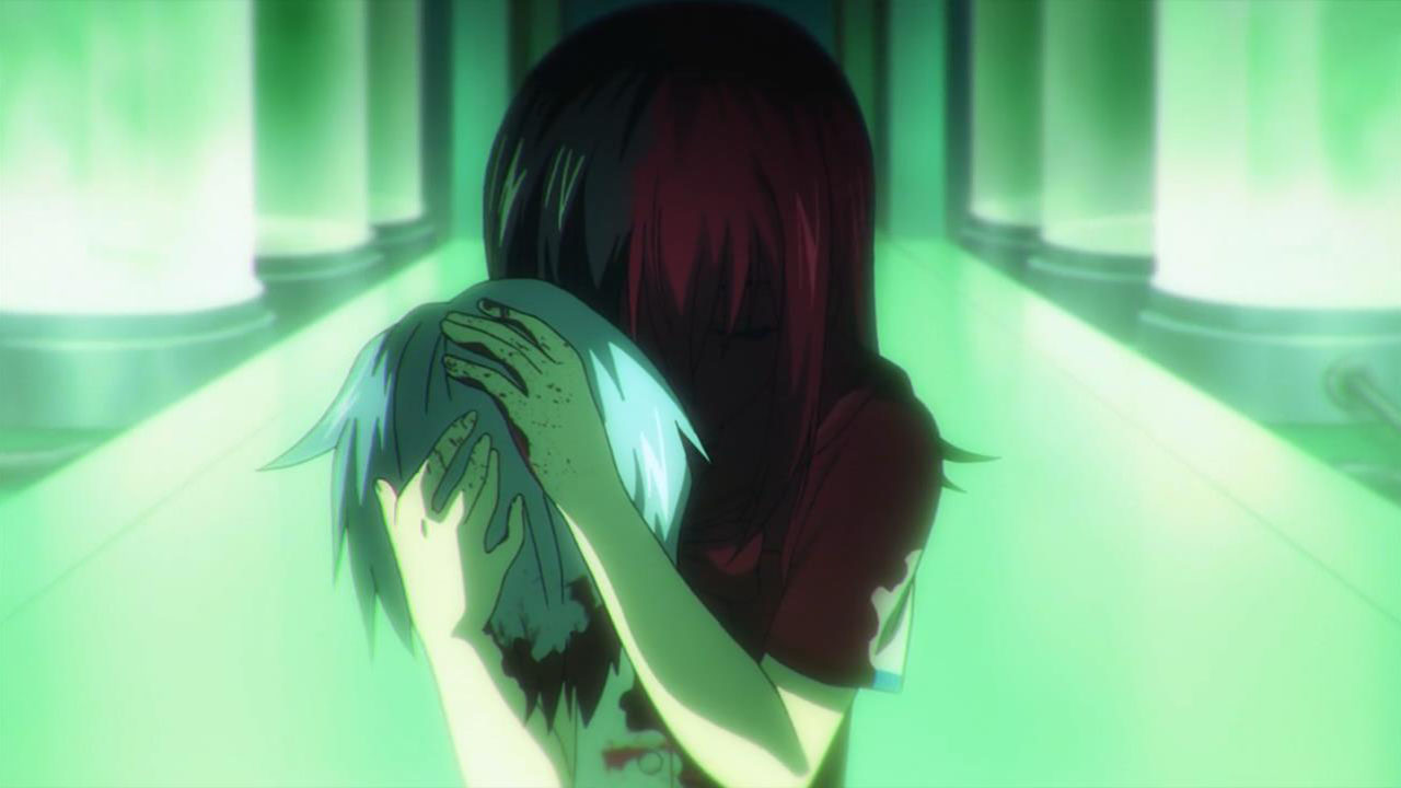 Kojou is an immortal vampire, and the main character to boot, so while I was surprised the first time he lost his head this one lacked punch. They’re going to have to do some pretty hefty convincing to make me believe he’s done for this time, though Kanon’s ridiculous power – and how she’s apparently not on this plane of existence anymore, which is totally hax – go a long way. I can’t help but think he’s going to get up and suck another girl’s blood this time too, not the least because Kanon appears to have gone catatonic over (maybe) killing someone who was kind to her.