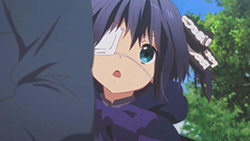 One thing about Rikka this season is that she seems to have gone backwards from the end of the last season. Her chuunibyou is as bad as ever, but she also seems to be aware of it and understands that it is something that she needs to change. For example her lying about her age showed that she knew other people would react if she had said that she was in high school and was afraid of embarrassing herself. Her interaction with Yuuta as she sat on the bench was another indication, since she was interacting with him outside of her chuunibyou personality and trying to figure out how to be in a relationship in the real world. The other thing is the entrance of the new girl. To have her repeat the arrival of Rikka in the first episode was a masterstroke (and damn cute too).