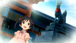 The story revolves around Fushimi Inari (Ohzora Naomi), a fairly stereotypically clumsy and shy girl who holds a secret crush for her classmate, Tanbabashi Kouji (Okamoto Hiroshi). Unfortunately, Inari accidentally pants Tanbabashi in public one day (c’mon, you’re in middle school; I’m sure she’s seen plenty of “junk” drawn all over the school property, and she only even saw his butt in underwear anyway… everybody has a butt, Tanbabashi), angering him and leading to Inari accidentally witnessing his confession to Sumizome Akemi (Minase Inori), the prettiest and most popular girl in school. In return for saving her familiar, however, the goddess Ukanomitama-no-kami (Kuwashima Houko) grants Inari one wish, through which Inari eventually gains a little of the goddess’s power for shapeshifting.