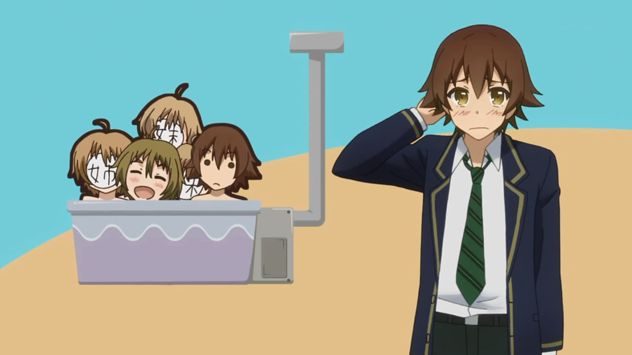 Besides those points, there’s not much to summarize about this episode except that it was refreshing to watch. Nourin is playing all the fanservice gags, discriminating against no specific type for the sake of completeness. The teacher will be naked. The childhood friend will be naked. Kousaku will be naked. Class E could very well be naked with that getup of his. Fujoshis are mocked, lonely men are portrayed as desperate, and even the caricature otaku makes an appearance to be made fun of. No one is safe from the butt of a fanservice shot,a ridiculous transformation, or a ridiculously stereotyped caricature–even Wakadanna has had the limelight as the goddess Gaia. Though the execution might be a bit stale in terms of how predictable the jokes can get, the comedy gets points for staying energetic and including everyone in its antics. It’s not a laugh-out-loud type of show, but Nourin definitely is a show that’s easy to watch casually and smile the whole way through.
