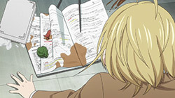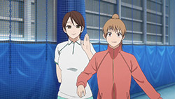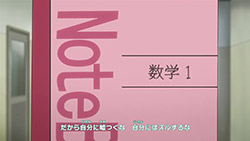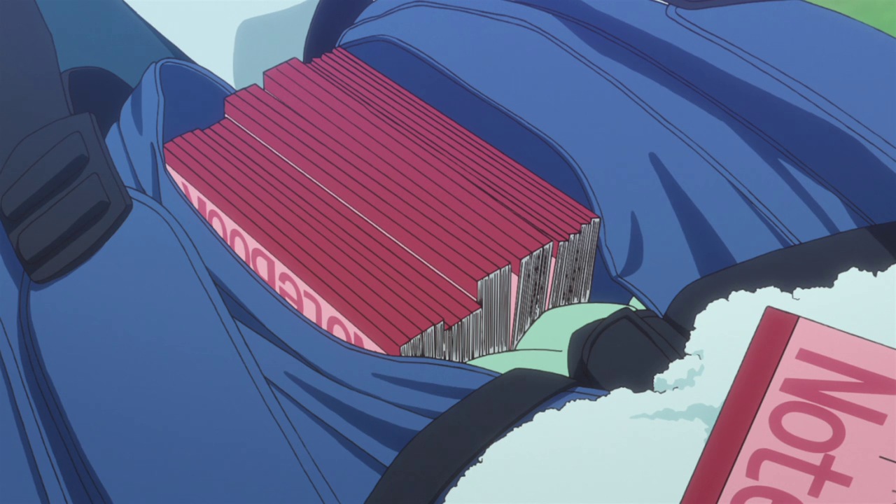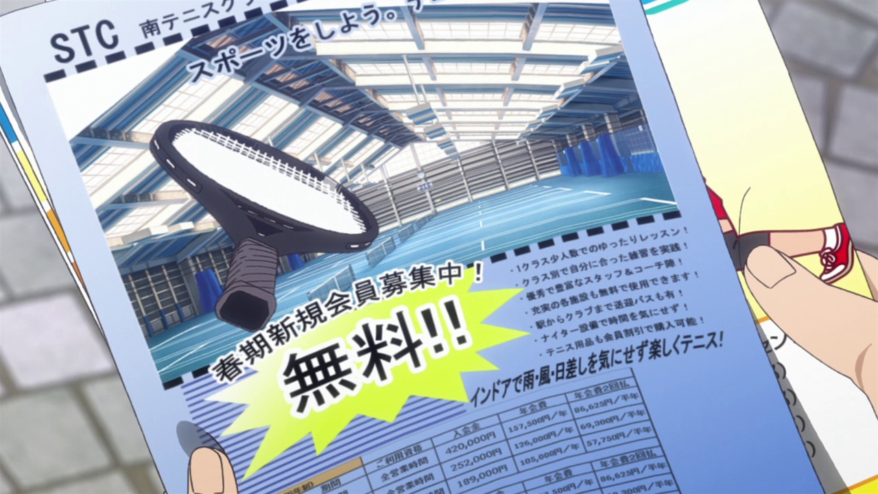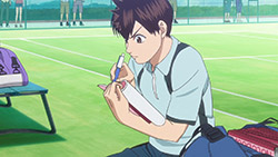 We’re also seeing how those elements tie in with Na-chan, the adorable and blunt classmate of Ei-chan who happens to play at the same STC (Southern Tennis Club) that Eichirou follows a coupon for a free trial to visit. While Na-chan does represent a sort of feminine ideal and it’s obvious that Ei-chan will develop feelings for her, she’s no plot device – she’s a fully developed character with a story of her own to tell. It’s also refreshing to see Ei-chan’s reactions to her in the premiere, because this is clearly not a stereotypical anime crush. He’s not comically shy around her, but he clearly notices how attractive she is. It’s just that thinking about girls that way hasn’t entered his equation yet – he doesn’t have notes on it.