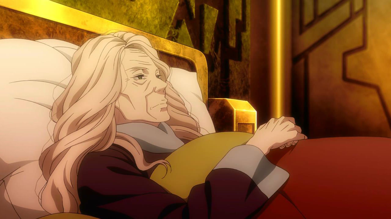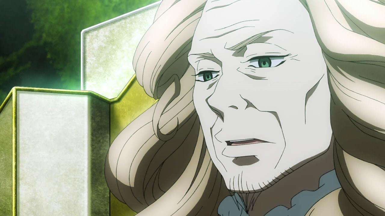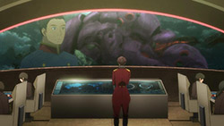 The upshot of that is that Saazbaum has realized that something is up with Slaine. This proves crucial given the dynamic with the Emperor (Ogawa Shinji), who’s declared a temporary armistice based on his doubts about why the Terrans would have perpetrated or even been complicit in his granddaughter’s death, knowing the consequences. All of the Knights including Cruhteo are outraged, and Vlad goes so far as to immediately disobey by going on a mission of revenge against Inaho. Slaine eventually sneaks into the “audience chamber” – which is actually a form of holographic projection – to tell the Emperor the truth and try and stop the war. But Saazbaum has gotten to the Emperor first, telling him that Slaine was a Terran spy who would be trying to poison him with lies. For now, the Emperor seems to be a fairly moderate but easily duped figure, and frail to be point of being bedridden. That implies that his public “appearances” are no more than holographic projections – and prompts some interesting questions about what’s really going on with Asseylum.