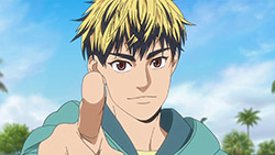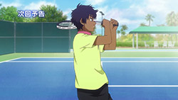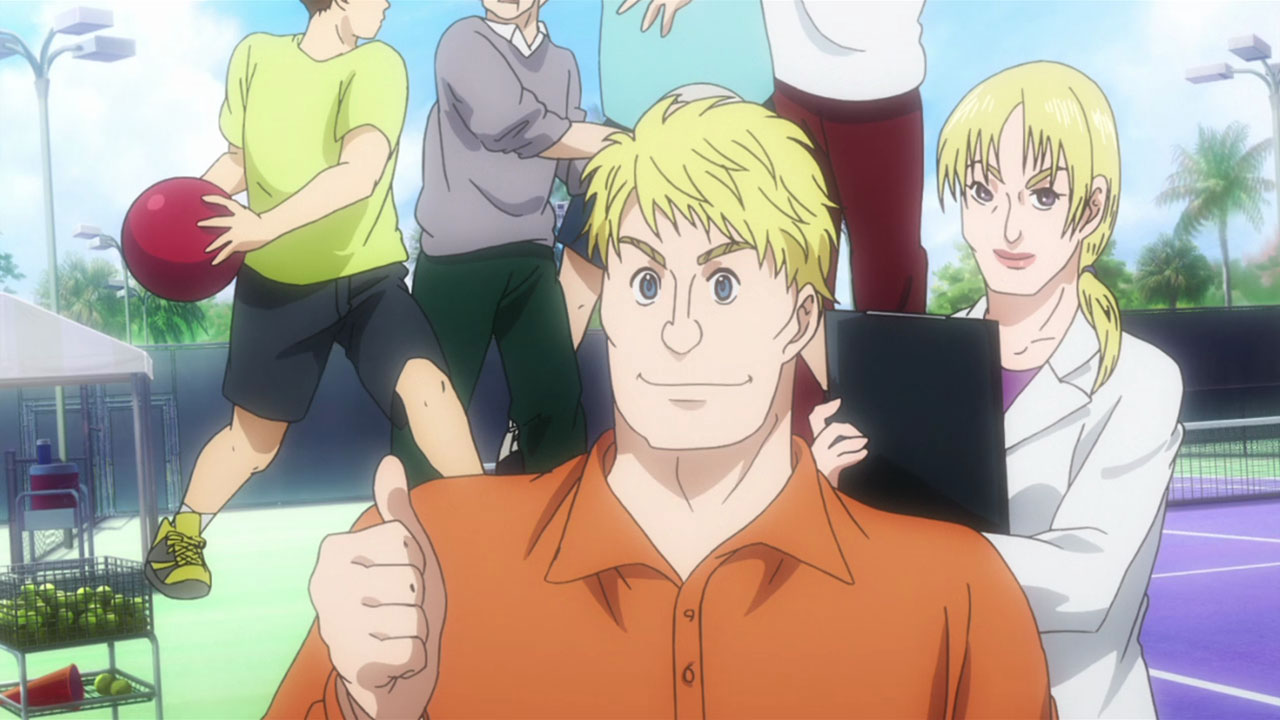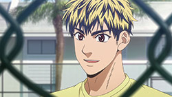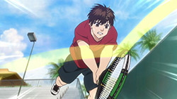 That context sets up the story perfectly, because among the many things that make Ei-chan a great protagonist are his self-awareness and his determination. And Florida is a big challenge for him, that’s for sure. His just-off-the-plane tennis baptism is a gentle one, a few rallies with junior player Marcia O’Brien (Han Megumi). But after Mike shows him around and introduces him to dorm-mates Taira Atsushi (Eguchi Takuya) and Ramesh Krishna (Hanae Natsuki) who give him the lay of the land and the daily routine, Day 1 brings a harsh reminder of just how big the hill is in the form of Marcia’s brother Alex (Kamiya Hiroshi). While most of the players at FTA are fellow juniors, Alex is a pro – albeit a newly-hatched one (ranked #819 in the world) – and as Atsushi laments, the pros are in a “different world” than the rest of the campers.