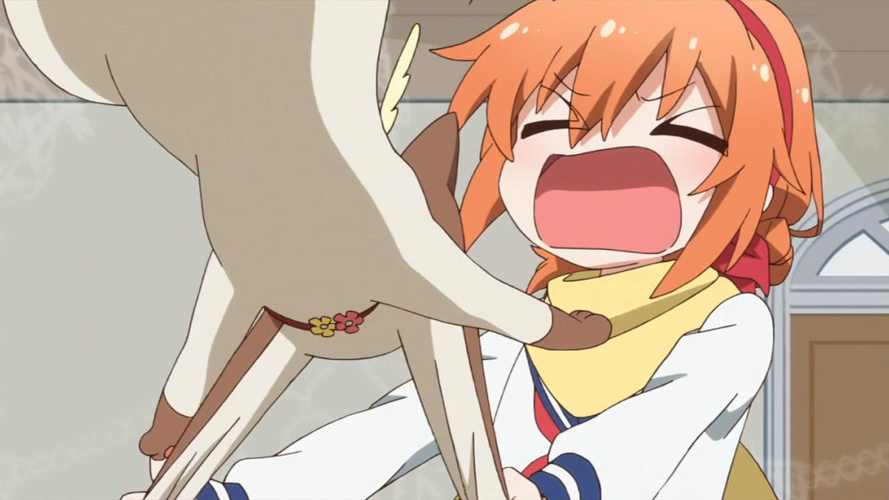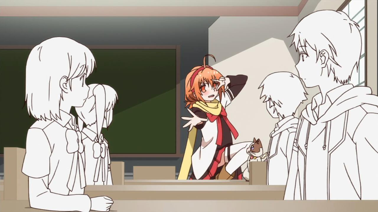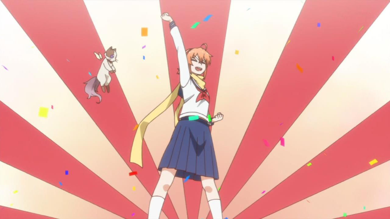 Ichinomiya Eruna (Kimura Juri) is certainly quite the character. Seemingly not being able to decide whether she wants to be a goofy shounen lead, a dating sim protagonist, or a magical girl, she has opted to play all of them at once. Not that there’s necessarily much of a difference between any of those these days; just look over at Mahou Shoujo Lyrical Nanoha playing in the very same season. Frankly, if you’re the designated hero in an anime chances are you’re going to be a teen with some kind of hidden potential with which you LETS FIGHTING with, no matter your slight genre variation. And we know Eruna’s the hero because she wears the scarf. Scarves are the symbols of heroes! Yeah!