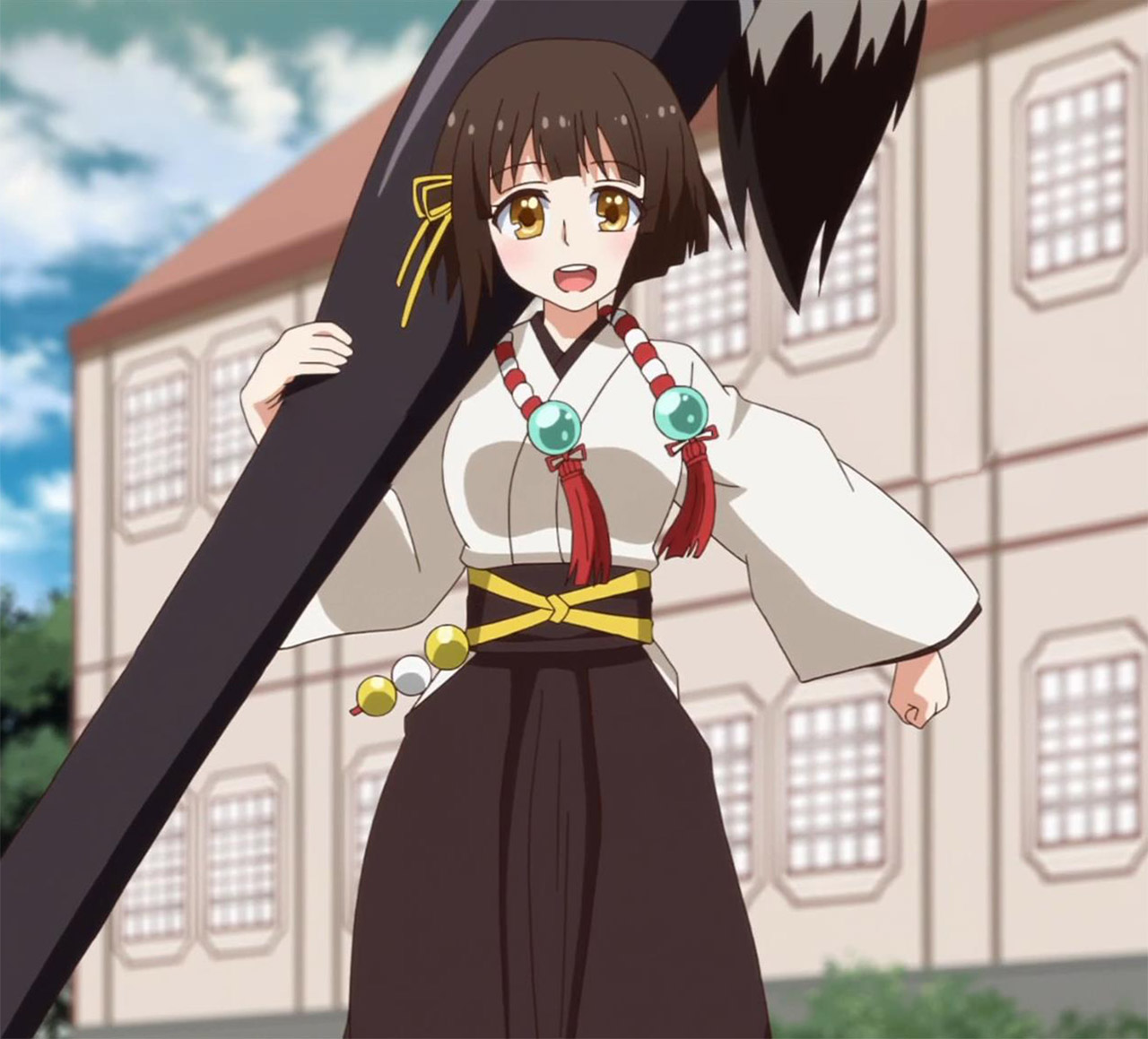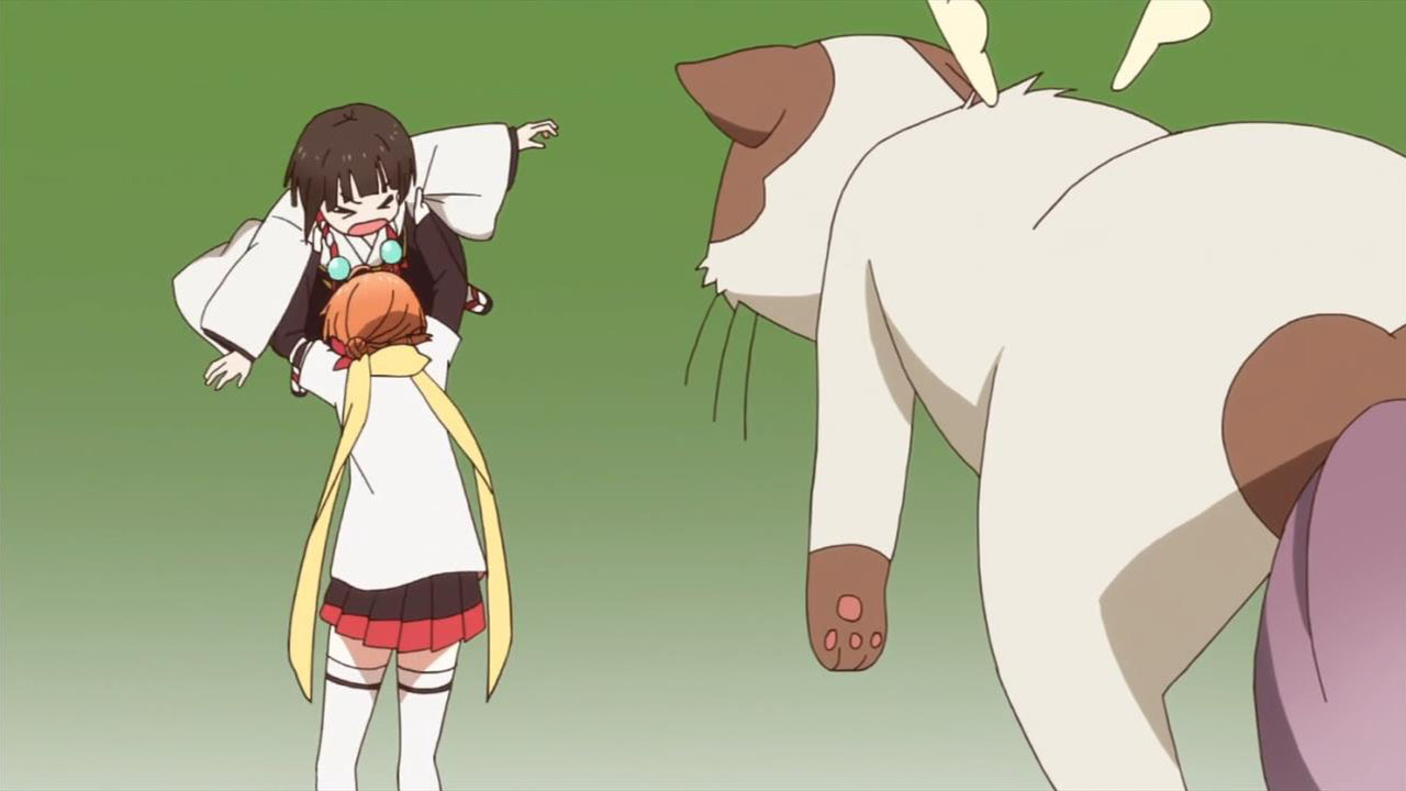 The setting, Mikagura Gakuen, is harder to pin down than our protagonist. For one thing, I’m not actually sure about the level of fantasy this show is operating on, because we never really get a sense of how fantastical Mikagura Private Academy is compared to the rest of the world. Eruna’s overactive imagination and unique perspective blurs reality and make-believe to desensitise viewers to the oddities of the academy, but you’d think someone else would have spoken up about their whacky education unless this was par for the course. The uniform is not uniform, chemical weapons are deployed on campus, and one of their teachers is a flying-cat-mascot-thing (Matsuoka Yoshitsugu). At least, you’d think one student would have complained about the school’s criminal mistreatment of their fiduciary charges. Nope. It starts to make me look like the strange one. Apparently, everyone had the cool curriculum except for me.