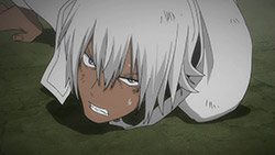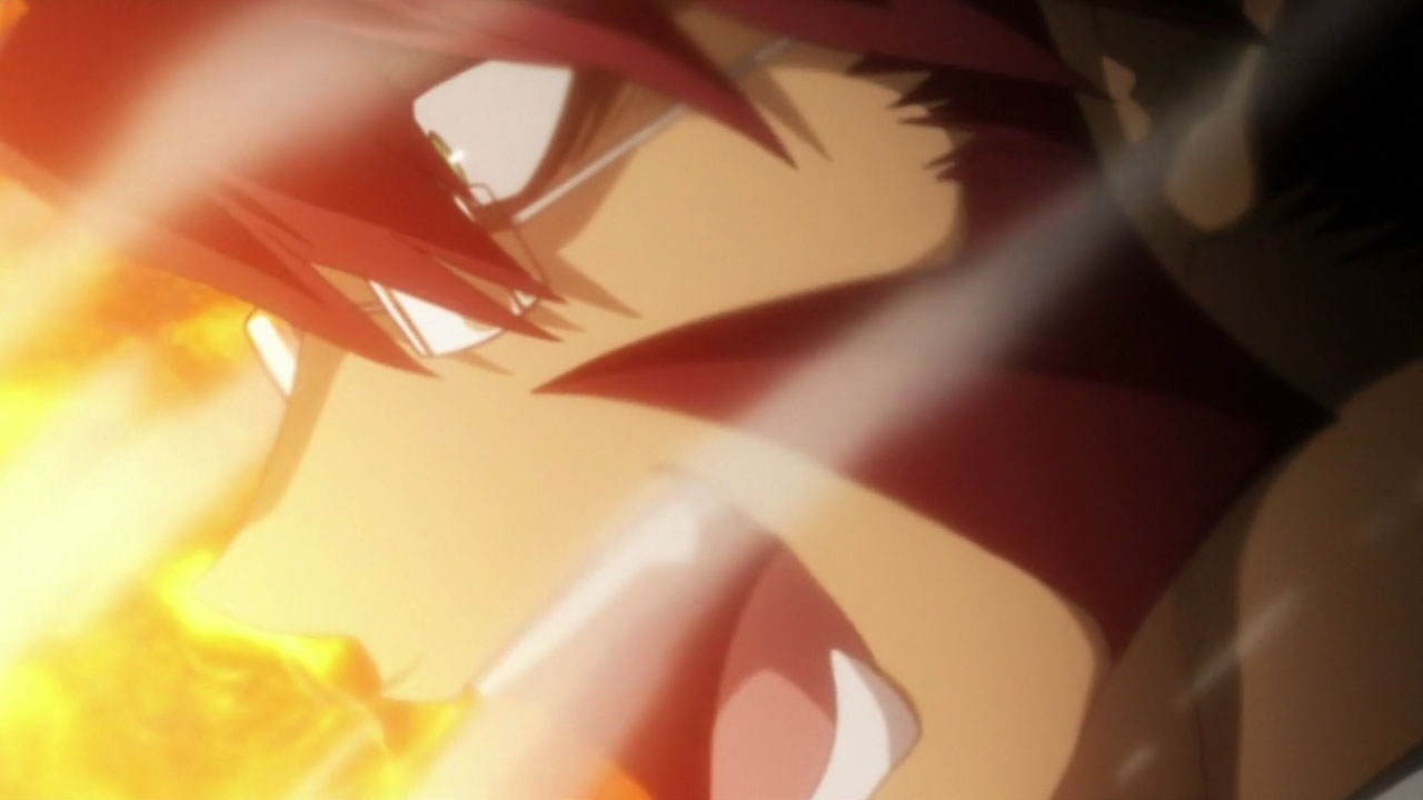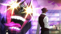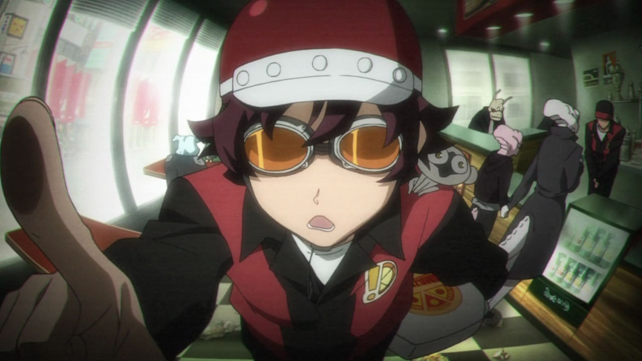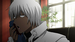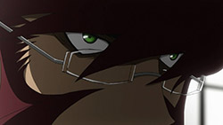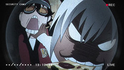 The star of this episode is Zapp, really, at least in terms of dramatic and comedic impact. He’s a foul-mouthed SOB who’s always trying to kill his boss (fans of the old Pink Panther movies will get a chuckle here). He steals Leo’s pizza in the nude (talk about style), and then, after Leo gets himself captured by a couple of baddies storing humans in ziploc bags for later consumption, sets up his rescue with a GAR tactic of using his own blood as a tracking device (sort of Celty-esque). There’s a reason why Zapp always seems to be hanging around Leo – he’s been asked by Franz to look after him, but he’s too surly to actually say yes and admit he’s doing it. And Leo definitely needs looking after – his All-Seeing-Gods-Eyes are of substantial interest to everyone on either side of justice here, and it’s clear that it’s an ability that doesn’t show up often – at least to the degree that Leo has it.