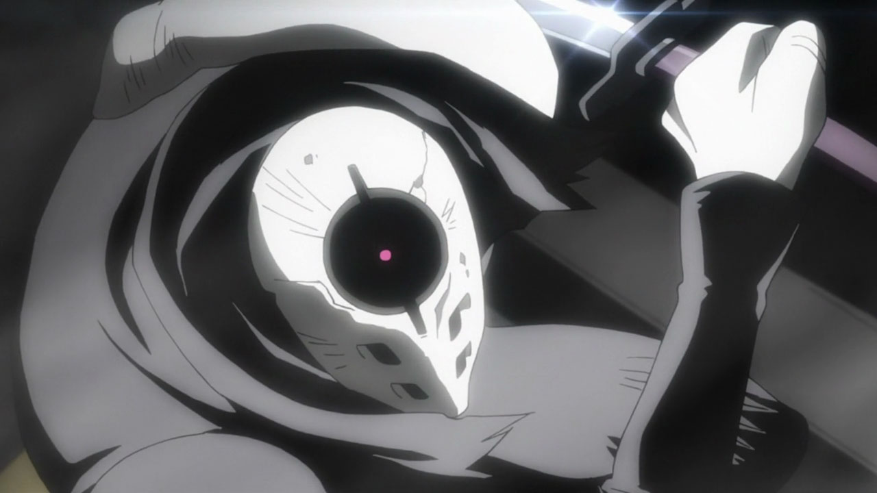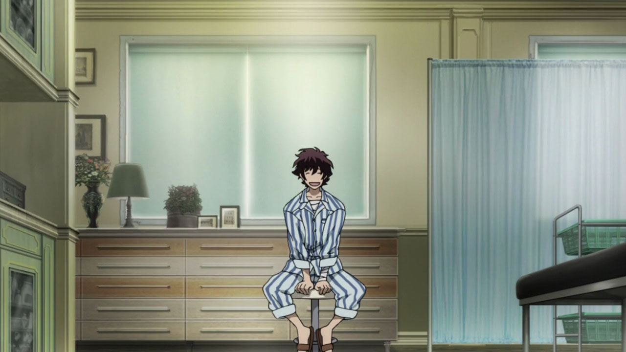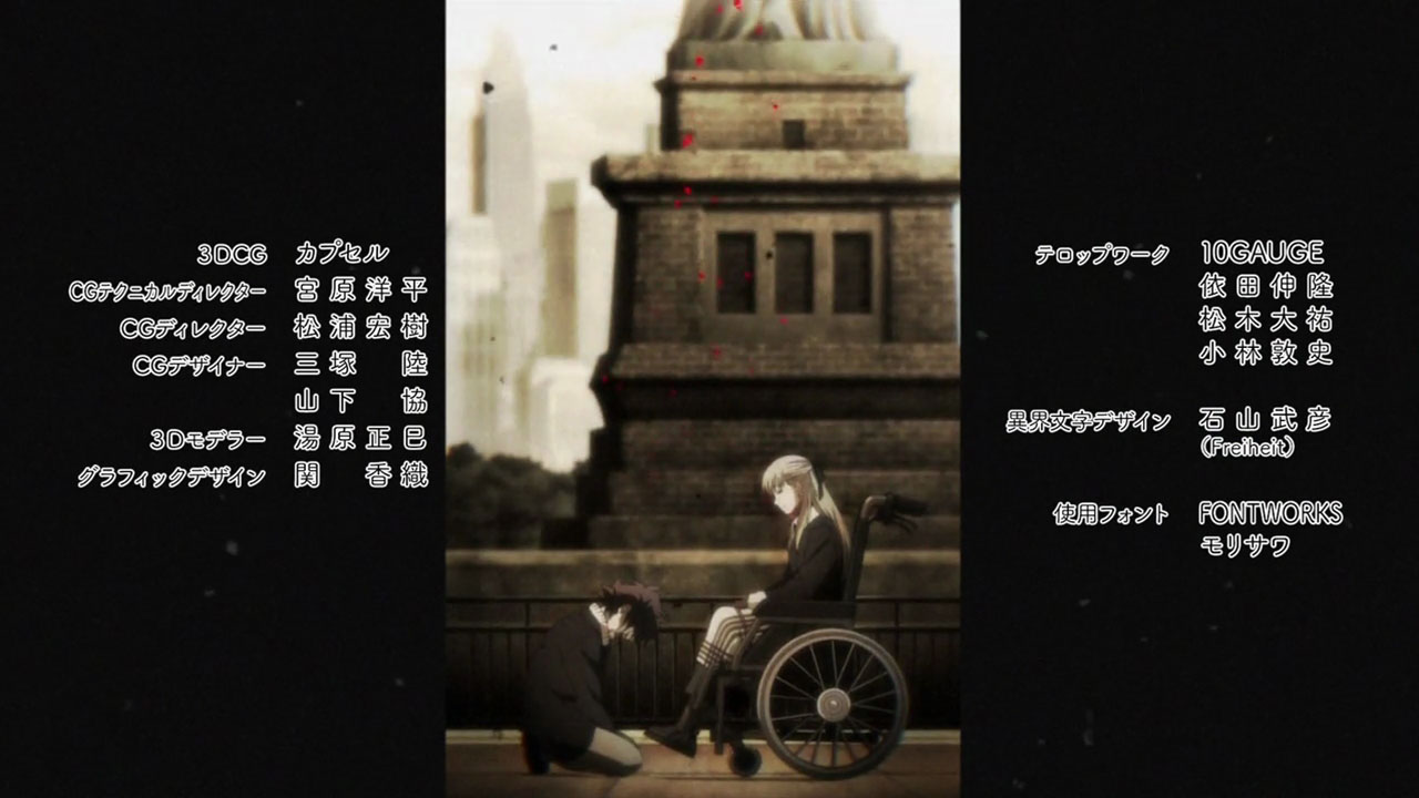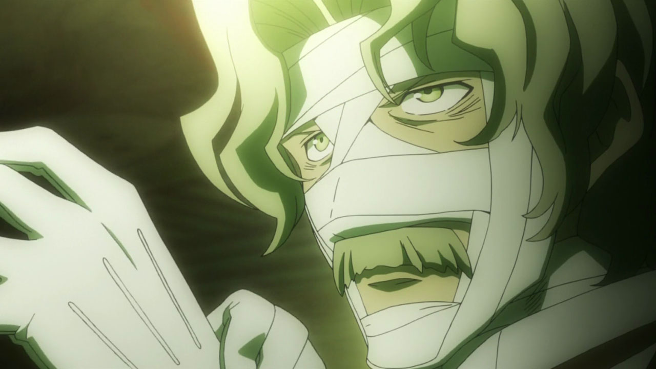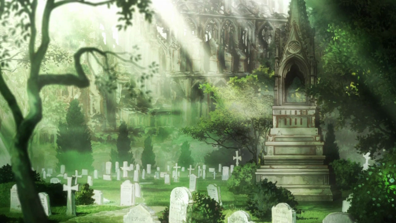 While everything isn’t fitting together just yet, the pieces sure are cool. The OP and ED are great both musically and visually (the ED by Unison Square Garden especially). There’s a silent butler at LIBRA with a GAR moustache and facial bandages named Gilbert F. Alstein (Ginga Banjou). Fellow seiyuu legend (and Baccano! veteran) Miyamoto Mitsuru shows up as Steven A. Starphase, a honcho in the organization. When they go into action, the trio uses what looks like a cross between a silver Bugatti Veyron and the Batmobile. And there’s a cemetery at the hospital where Leo ends up mummified after his less-than-elegant rescue, in which lives a strange girl named White (Kugimiya Rie) who calls herself a ghost.