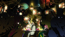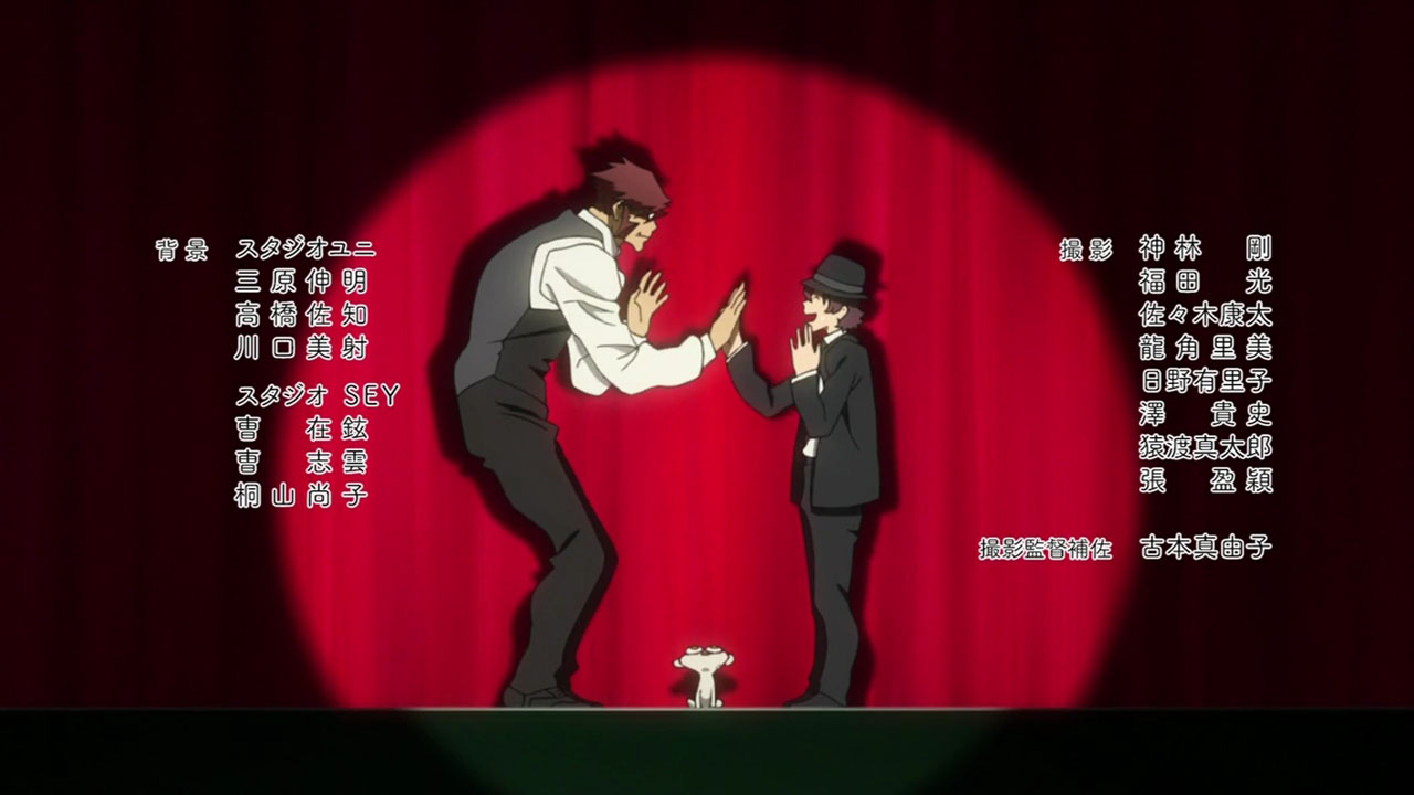 If all Kekkai Sensen turns out to be is a wild ride, I’m fine with that because this ride is a spectacular one. If it can establish the characters as really interesting and distinctive and tell a coherent and engaging story, so much the better – the track record with Nightow is a bit mixed on that, but there are a lot of positive signs in this episode. There are strong rumors the series is going to be a split cour, which would give Matsumoto plenty of time to get there – let’s hope those rumors are true. As to what kind of reception it’ll receive, I find myself wondering for the same reason I did with Punchline – this isn’t the kind of anime today’s audiences are used to seeing, and I wonder if they’ll get what Matsumoto and Nightow are doing here. Kyousougiga, brilliant as it was, flopped commercially – as most ambitious series do – and Kekkai Sensen certainly isn’t checking off the right boxes to appeal to the usual suspects. We’ll see.