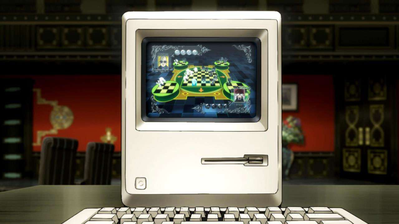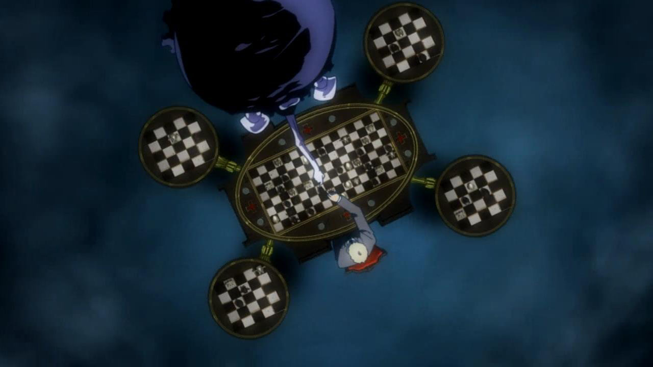 The other thing that must be said is that it’s not as though the substance of Kekkai Sensen is terrible, or even uninteresting – it’s definitely neither – just a bit unformed. There’s some intriguing stuff out there but so far, it’s all pretty abstract. We were introduced to a bunch of new characters and concepts this week – K.K. (Orikasa Ai), an ally of Klaus’ with connections to the underworld. The boss of that underworld, the alien insectoid Don Arlelelle Eruca Fulgrouche (81 year-old Iizuka Shouzo). And the game of Prosfair, something like a futuristic version of chess and a favorite of both Klaus and Arlelelle (Klaus is also quite find of chess, which he likes to play online on what looks like an original Apple Mac).
