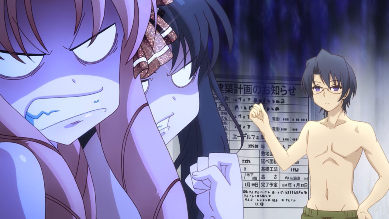 Besides, with comedy this good, how could you complain!? First of all, points to Kazuo—Suzuka was absolutely shipping Shirou x Issei. And you know what? I take it back. It’s much better this way! It adds to his (un)lucky bastard/butt monkey status, to have a friend who maaaay be gay (gar?) for him, but regardless, is saying things that are pretty easily taken that way. It also provided yet another opening for when the comedy combo really started climbing.