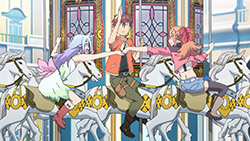 First, pay more attention to the characters. Too many of them are passive and malleable, Sougo in particular. Three episodes in and we still know next to nothing about him, which engenders apathy as a viewer. But all the characters need work, even the simplistic Felia and Moura. About the only one I kind of like is Kaon, if only because I’m surprised she hasn’t been utterly sidelined yet, and because she is nicely motherly to Felia. But they all need work. If we knew why Sougo and the antagonists were doing what they were doing—not with exposition, but through character-defining moments—it would help a lot.