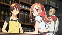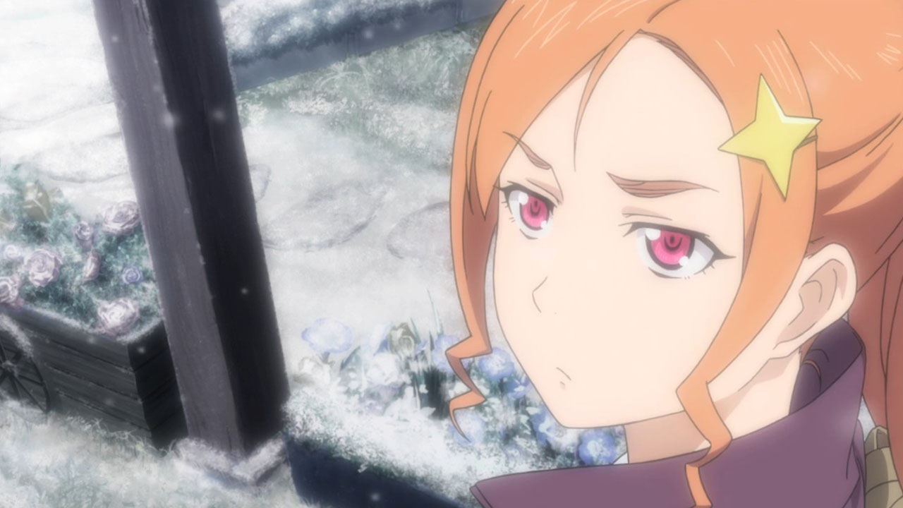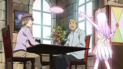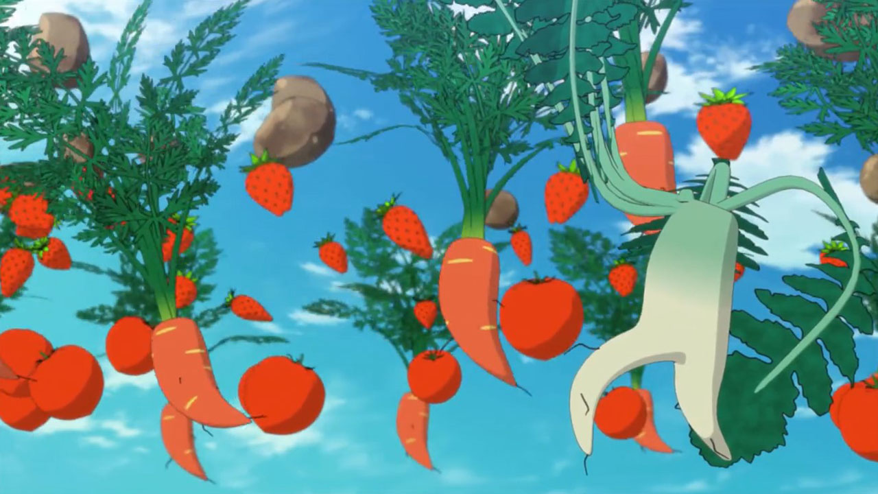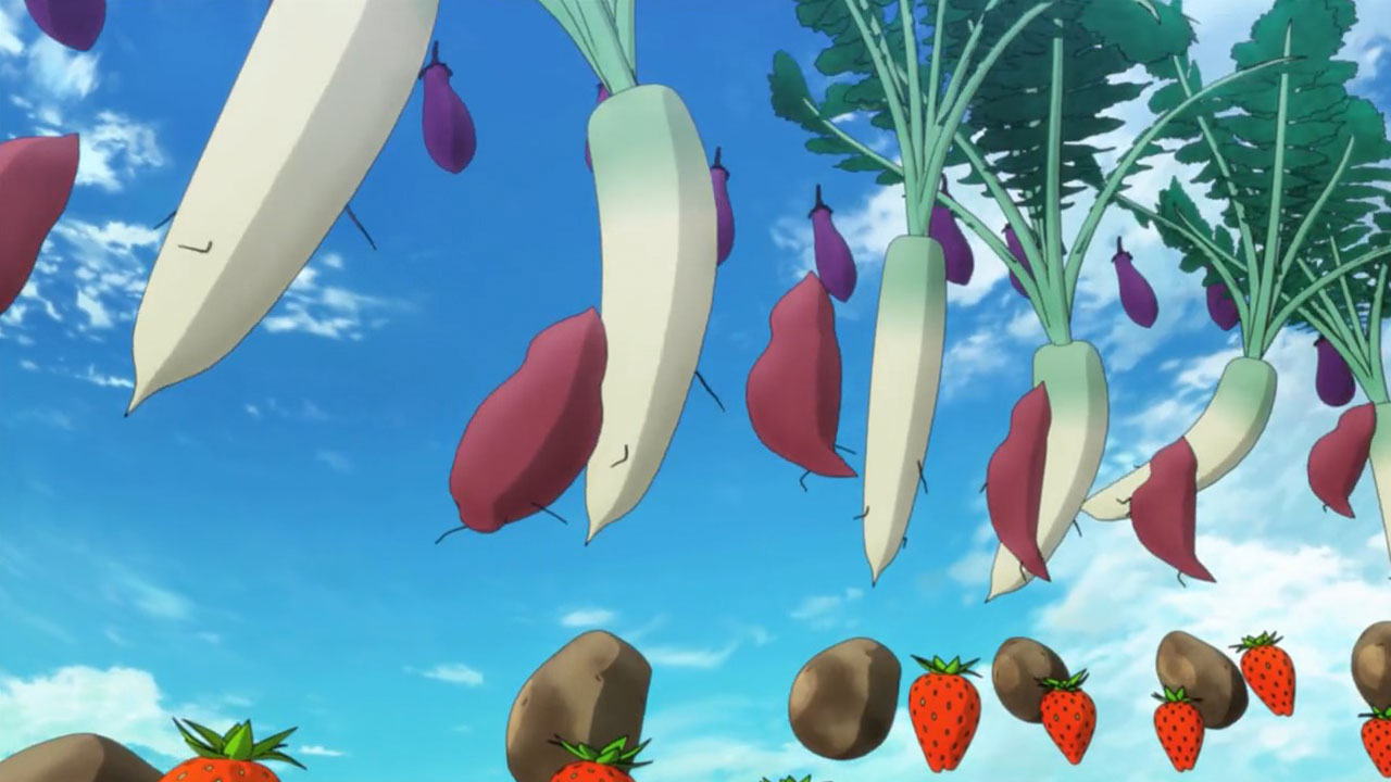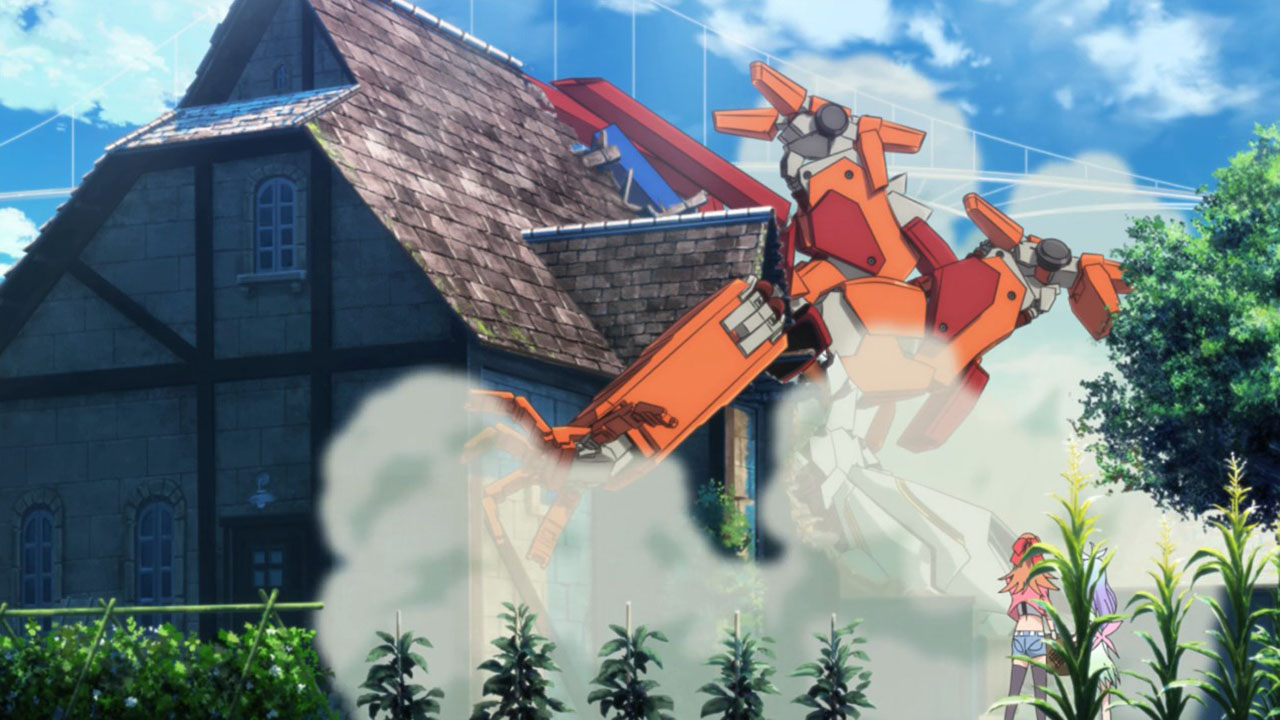 Felia keeps using TK for mundane things. The dancing vegetables were surreal. Her powers are also ill-defined, since she can apparently turn a grill into fireworks. The mood was strangely light for a typhoon being on the way. The mood was strangely light throughout, and the tension was nonexistent when Felia was captured. The typhoon served no plot purpose other than to make them fix the roof, but who cares about that? And Roman’s mech was extra pointless, since they fixed the mishap off-screen during the commercial break. The antagonists say they need time to track down the Lima’s location even after they can see her on surveillance footage, but still arrive during this episode, so they didn’t need to make excuses. Roman is comically unlikable (he’s both arrogant and chauvinistic … yahtzee!), the wine is too purple, the sages mumbo jumbo was still incomprehensible and, more importantly, boring, and Sougo’s motivation (to find a red crystal) still leaves him with less personality than, literally, a rock. They also suddenly went to school for the first time in four episodes, and they all left Felia alone, though in Do Mon’s defense, he doesn’t know that Sougo & co have gotten mixed up in something dangerous—something he only remembers to ask Sougo this episode. Also, Felia’s limiter crystal came out of nowhere, and Roman brought a cow.