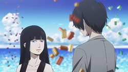 Literature majors going into apoplexy aside, this week’s episode was supposed to be the confession episode, in which the culprit spills the beans in front of the detective and we get an understanding of the former’s true depravity and/or desperation. The facts of the case we have here I found straightforward. The Miki = Shiki reveal was no great suprise once it was established that Shiki had a daughter. I was also already used to thinking in hexadecimals, because of RPGs with stat caps of 255. I was up to speed with the ‘how’ of the case, and didn’t need the recap like Moe. But, as I noted last week, I don’t consider the mechanics of the murder to be the main point of Subete ga F ni Naru, but rather the motives. That’s where I’m still a bit perplexed, because I haven’t really been able to process why Shiki killed her parents, killed her daughter, and then killed her lover. Or rather, some reasons are given, but I do not find them satisfactory. This is even before we note that most of the ‘reasoning’ is pure conjecture. As Hyouka taught us, making assumptions about the values of others and treating it as fact is hubris. Shiki’s daughter is no longer around to tell her side of the story. That’s one of the disadvantages to being dead.