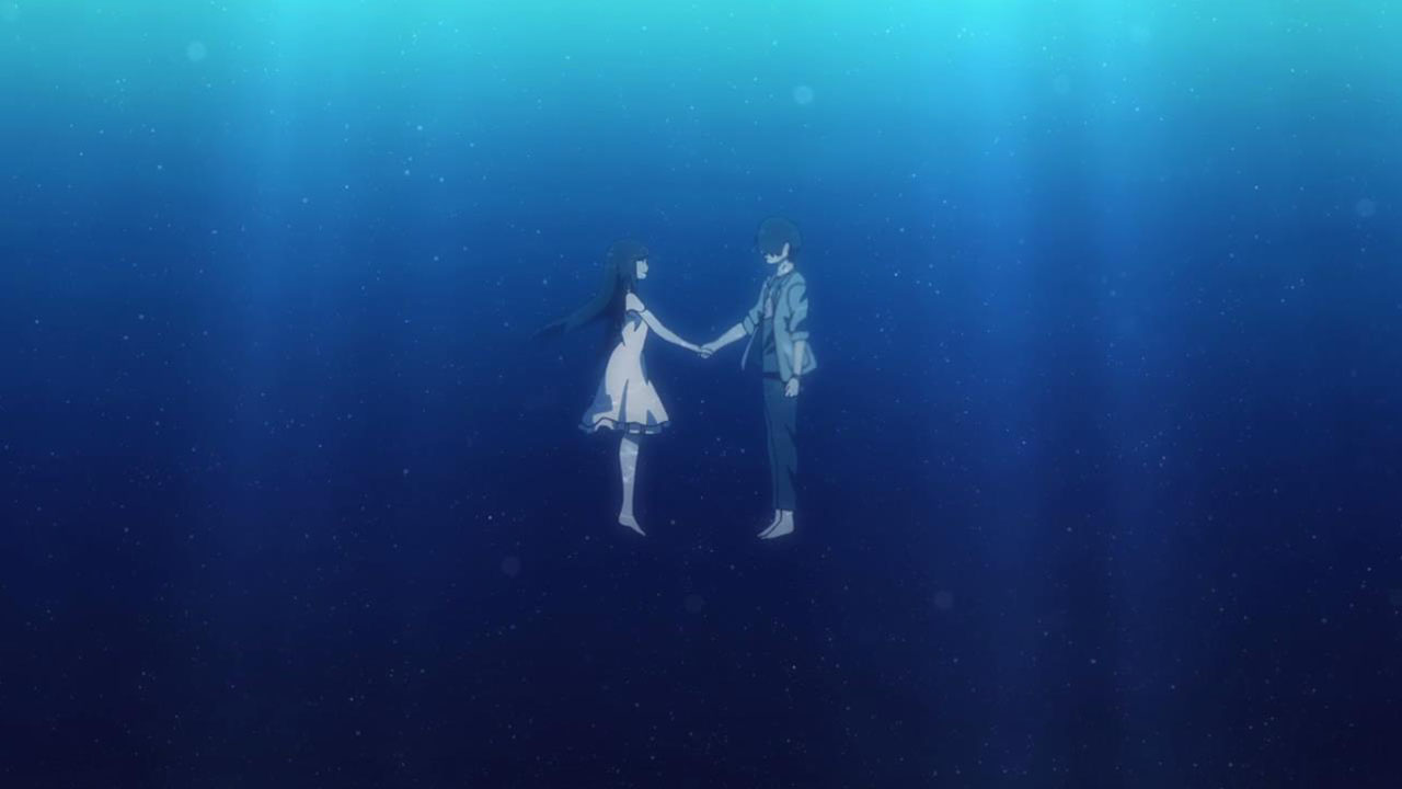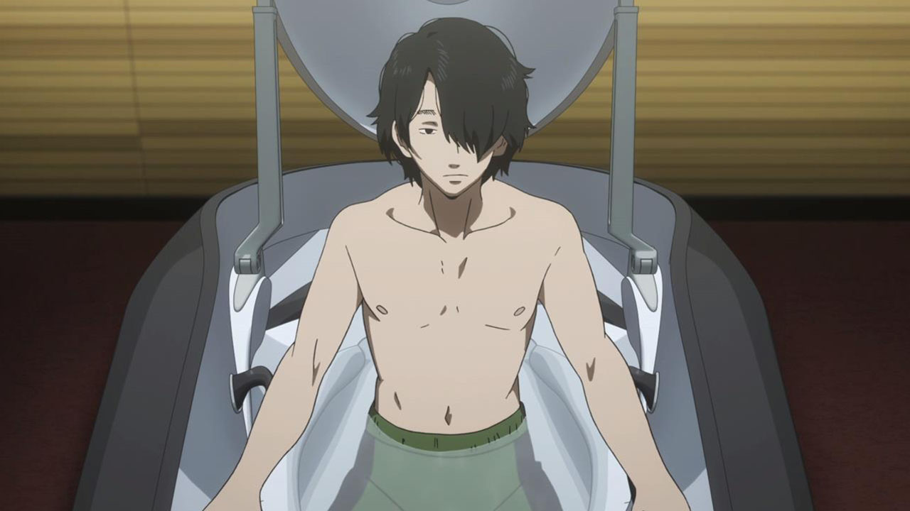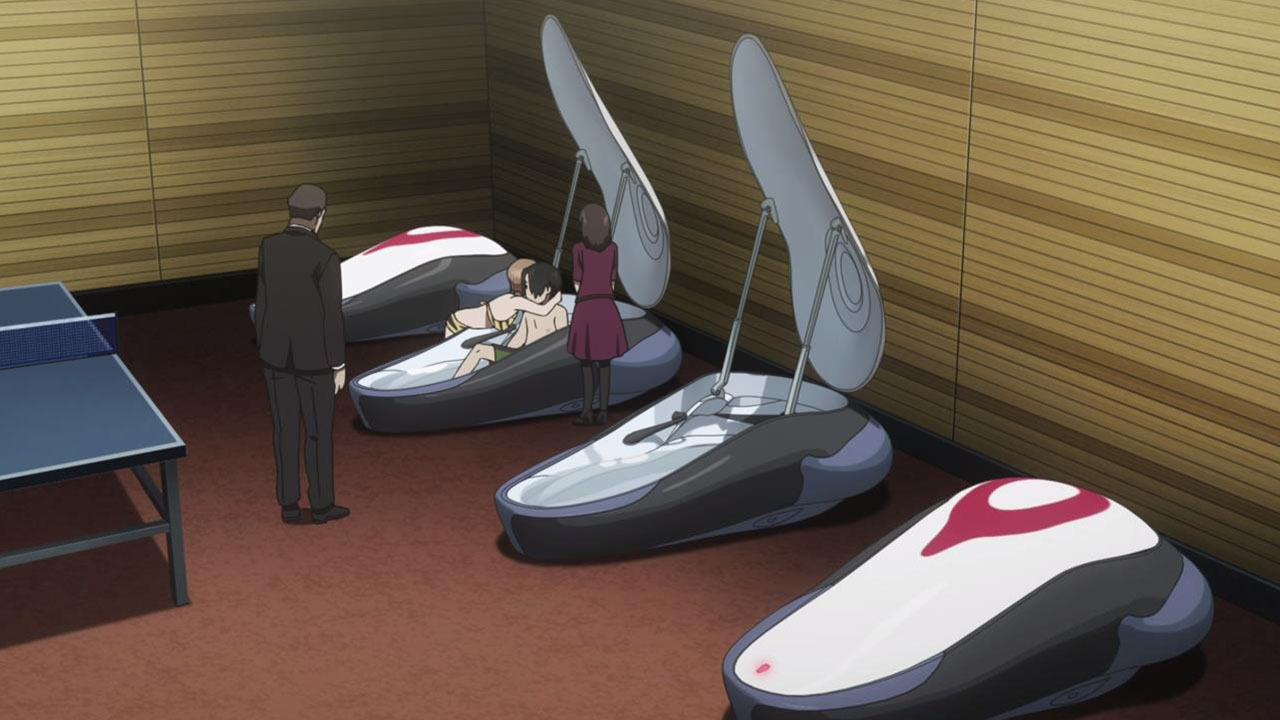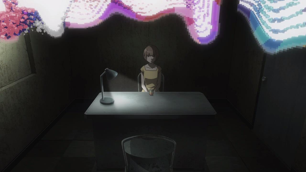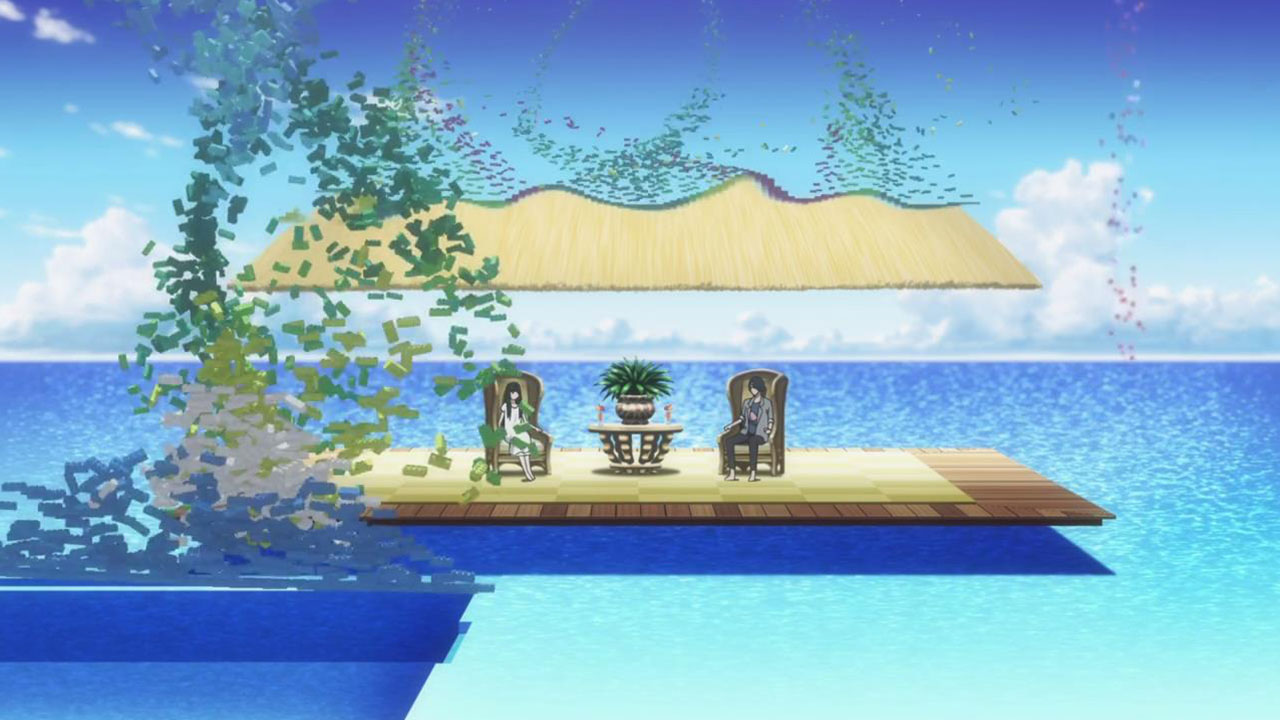 Symbolism this week! Er, I think. Look, tropical resort vs interrogation room. That probably means something? Moe’s feeling insecure and has lots of questions, while Souhei’s relaxed and—why am I pretending you folks can’t works this stuff out yourselves? Since most of the episode was spent inside the holodeck coffins, everything is suitably abstract. Interpret as you will! Do you think that Magata Shiki just really wanted a jellyfish aquarium when she was a kid but didn’t get one so is now subconsciously lashing out? Sure, why not? No bad ideas here.
