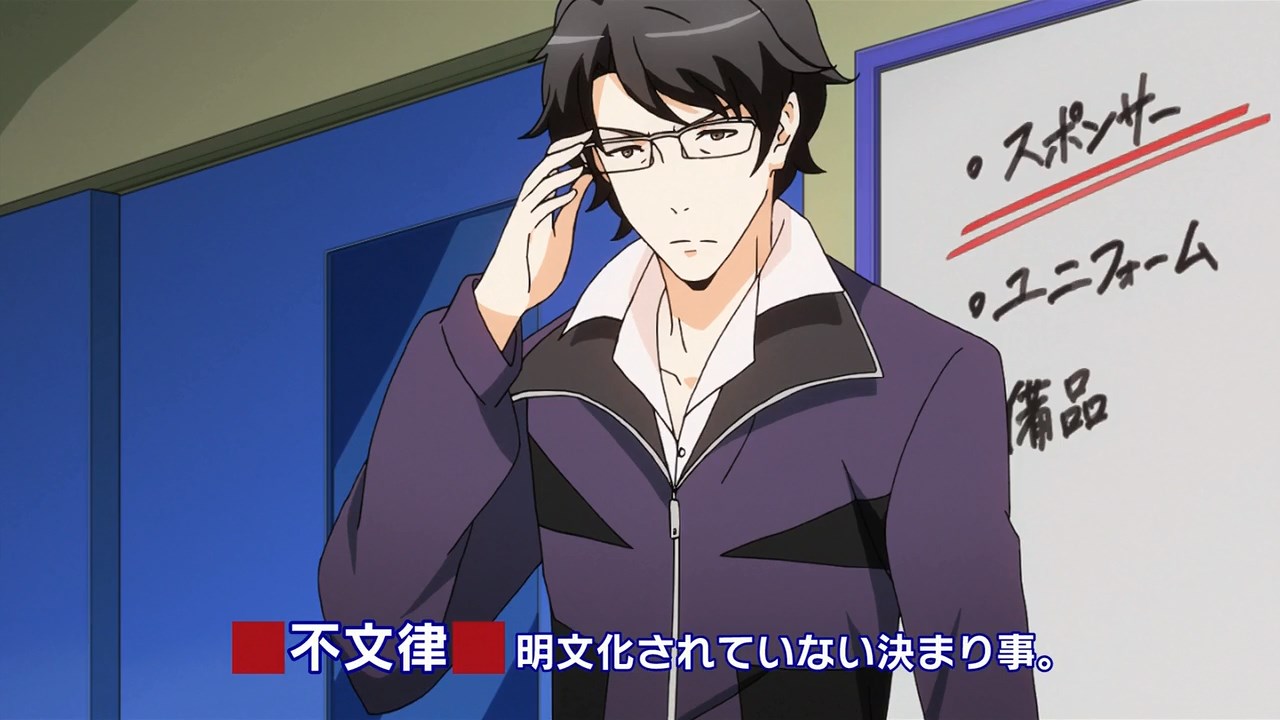 Instead of Haruka stripping and swimming away, Takeru dons a jersey and dashes away. Plus Mr. Dan’s a more serious, cunning version of Amakata-sensei.