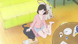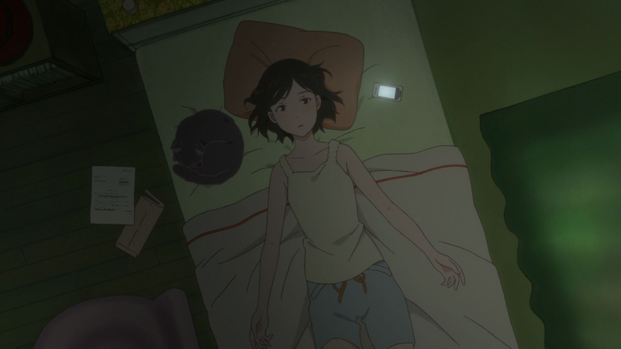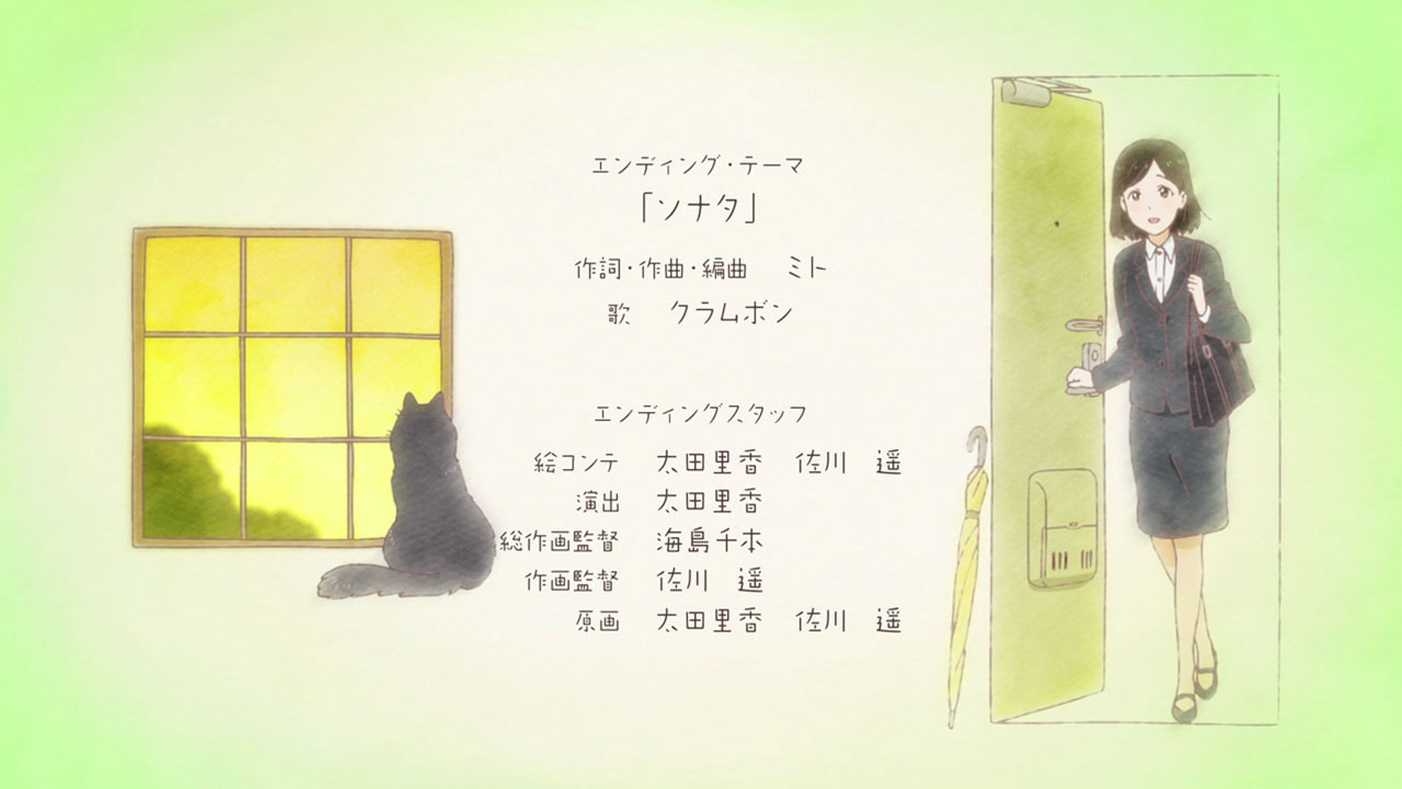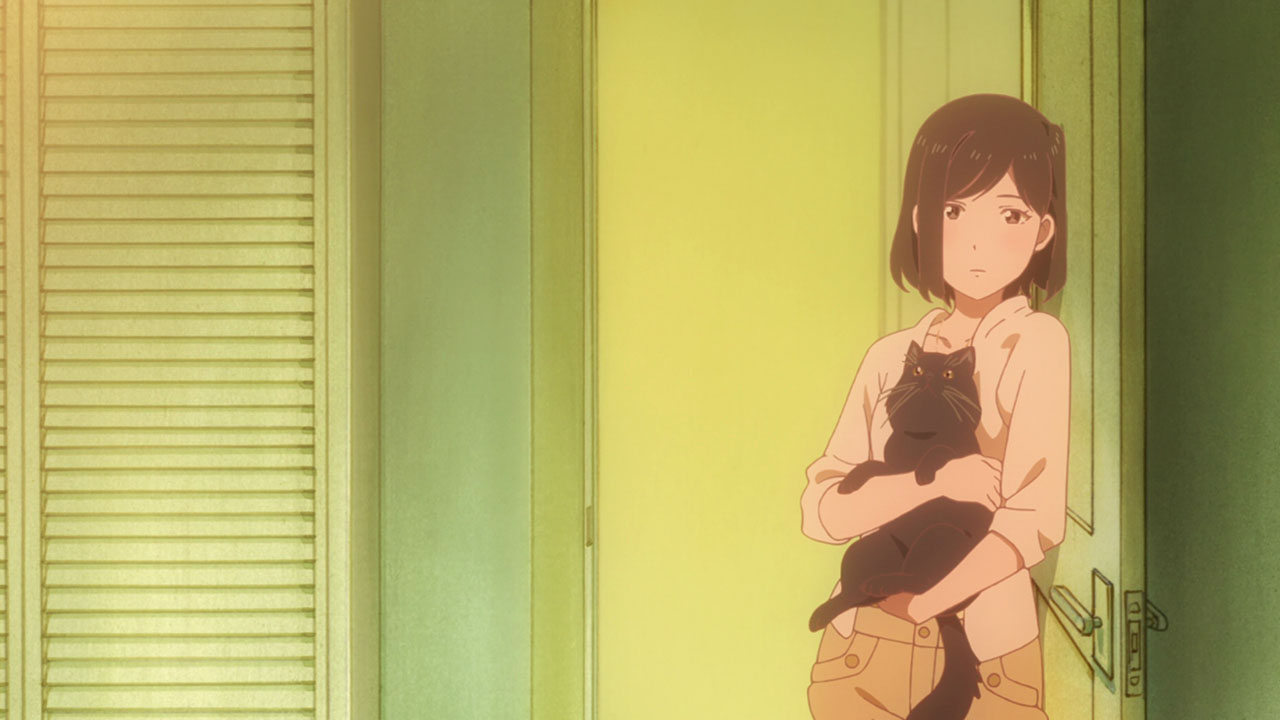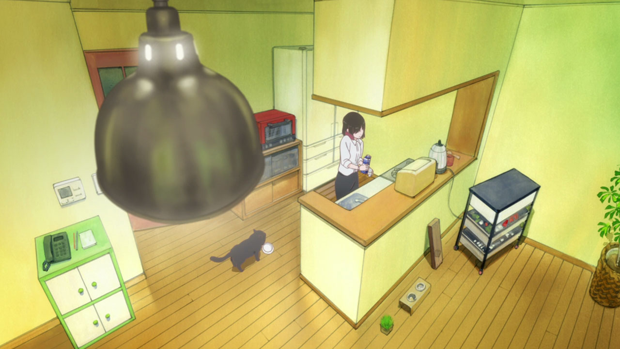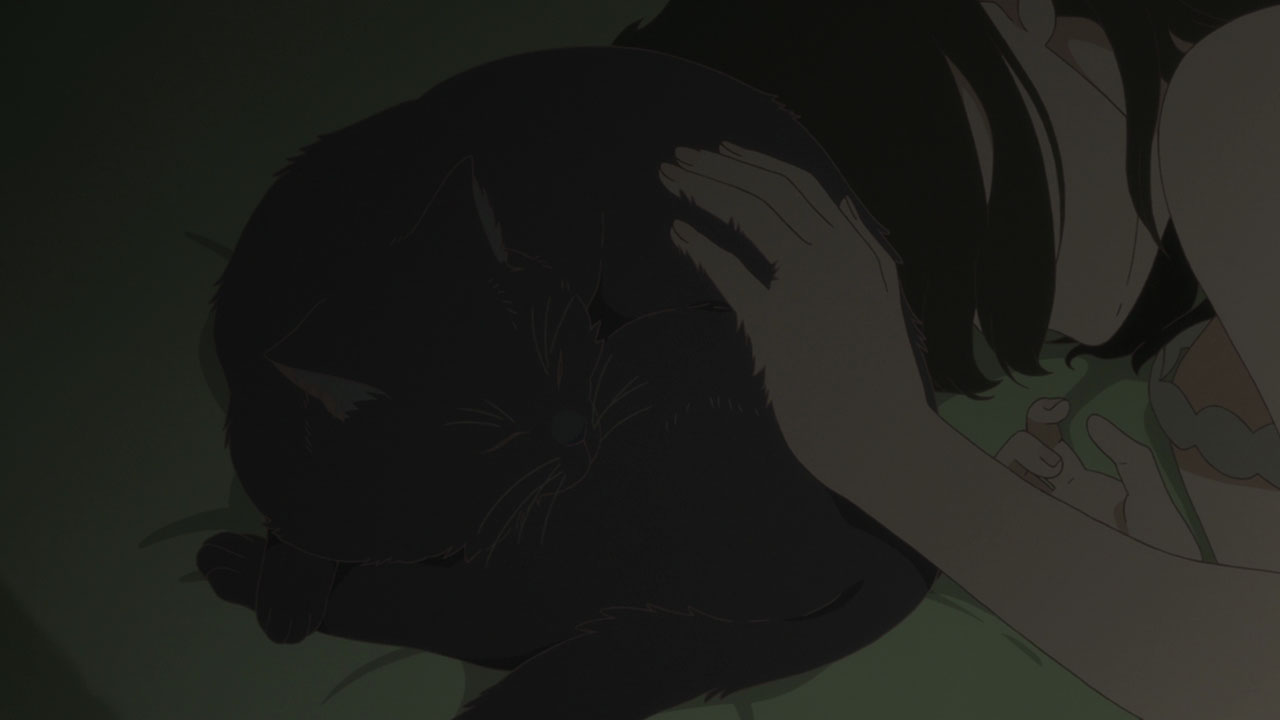 “She and Her Apartment”An Interesting History: Shinkai Makoto’s famed short about a job hunting girl and her loving black cat gets a picturesque remake, and it’s just as depressing as I remember. This little gem has an interesting history that had a lot of people (myself included) excited about what was on offer here. If you’re an anime fan, you’ve likely heard of the director, Shinkai Makoto (5 Centimeters Per Second, Hoshi o Ou Kodomo, Kotonoha no Niwa). If you haven’t, then I’d highly recommend checking out everything he’s worked on; his name is synonymous with gorgeous visuals and melancholic stories. But 14 years ago, when he wasn’t as famous and beloved as he is now, he put out a five-minute long depressing black and white short about a girl and her cat, and despite it’s simplicity and tiny length, it has accumulated much acclaim over the years. Fast forward to present day, and we’ve got this modern remake, which is clearly the more visually appealing – not only for an anime nowadays, but especially for a short. If you felt you were watching a Kyoto Animation production (despite this being produced by LIDEN FILMS), then you wouldn’t be mistaken, as this is produced by an ex-KyoAni member, Sakamoto Kazuya, who worked on titles such as Kanon, K-ON!, and Chuunibyou demo Koi ga Shitai!. That particular flair can be felt throughout this episode, from the detailed closeups to the smart use of blurs and composition. It’s an identifiable style, and a good example of what KyoAni could produce if they dealt with more adult material more often. The Failings and Hardships of a Job Hunting Graduate: I was but a youngster who did not know the bitterness of the world when I first watched the original short. Now, several years on, this hit home harder than I could have anticipated. The story is simple, but excruciatingly relevant to me (and likely many others). It’s about a nameless girl referred to as ‘She‘ (Hanazawa Kana), who lives alone with her black cat, Daru (Asanuma Shintaro) after her flatmate has to move away. With her almost graduating, she’s beginning her job hunting to try to find something to pay her bills and keep things steady. It sounds monotonous and potentially boring, but as it’s told through the point of view of the cat, it provides an outsider’s perspective on what our main character is struggling through. There were plenty of moments that stuck a cord with me, like seeing her practicing in front of the mirror, repeating lines for her job interview that sound totally unnatural. She then receives a phone call from her mother who gives her grief and insists she return home. But the moment that affected me most was when she returned after a long day of failed interviews only to kick off her shoes and collapse onto the side her bed. From the point of view of her cat, he’d been waiting all day and is thrilled to see her, providing what little comfort he can in her time of helplessness. It was a short scene, but seeing her slumping over in defeat, reading messages of encouragement that only made her feel worse… it hit me hard. I can totally relate to everything this girl is thinking – right down to the ‘I’m already doing my best” – and so I’m hoping that this short will provide more closure than the original, and perhaps more hope for people who find themselves in a similar situation. Overview – What’s Next?: I expected this to be good after I read over the staff list, but this packed an emotional punch that I wasn’t quite expecting. I put that down to me watching the original when I was too young to understand what the main character was going through, and now that I can relate… it hurts more than I’d like to admit. But there seems to be light at the end of the tunnel, and even when things aren’t going well it’s hard not to love that little cat. With three episodes left, I can’t wait to see what’s to come. Hopefully it won’t get more depressing than this, but part of me suspects it will. ED Sequence