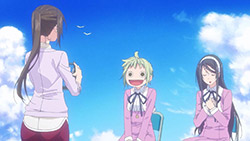 Of course, the sports is also a metaphor (isn’t it always?). One of the fundamental rules of diving offered by Amanchu! (the one that doesn’t involve dislocating your jaw) is ‘don’t stop breathing’, and it applies as much on dry land is it does underwater (breaking news: Passerby supports consumption of oxygen). Teko is nothing but a ball of nervous panic, so it’s the kind of advice she really needs. Just remember to breathe. Contrast Teko with Pikari, who has been a mass of unquenchable energy up until now but is revealed to have more nuance. As noisy as she is, she’s actually has no confidence with expression. But panic is useless—just keep breathing. Hurrah, life lesson! Amanchu! is bound to have more of those. I wouldn’t call it a philosophical show per se, but it does have a philosophy—one that it will continue to share, I’m sure.