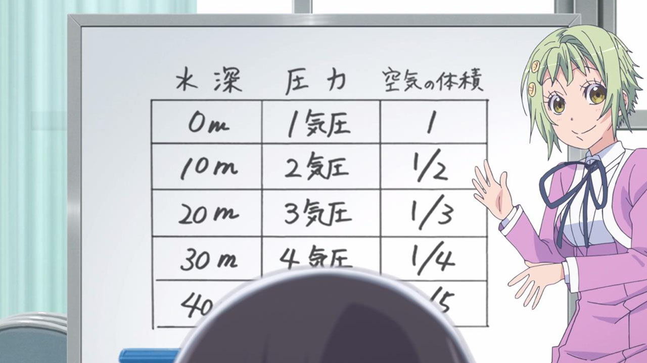 The technical diving lecture that Katori-sensei went over is actually the basics of diving. While I’m not a scuba diver myself (it is on my bucket list of things to do in life), I can attest to the physics and basic rules in this episode. In fact, look up any basic rules on scuba diving and it doesn’t stray too far from this episode.