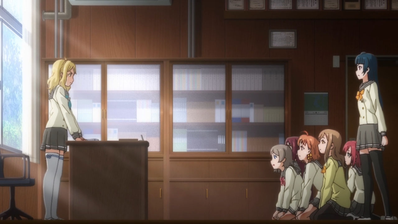 After not bringing it up for five episodes I was really hoping it was a sign the “save the school” plot wasn’t going to show up. Though I suppose Chika’s glee at the news made up for it. I had to pay attention to Mari’s speech this episode. Wonder if her one scene with her heavily accented Japanese is her “helping Aqours” mode or if she’s just seeing how long she can get the group to believe it?