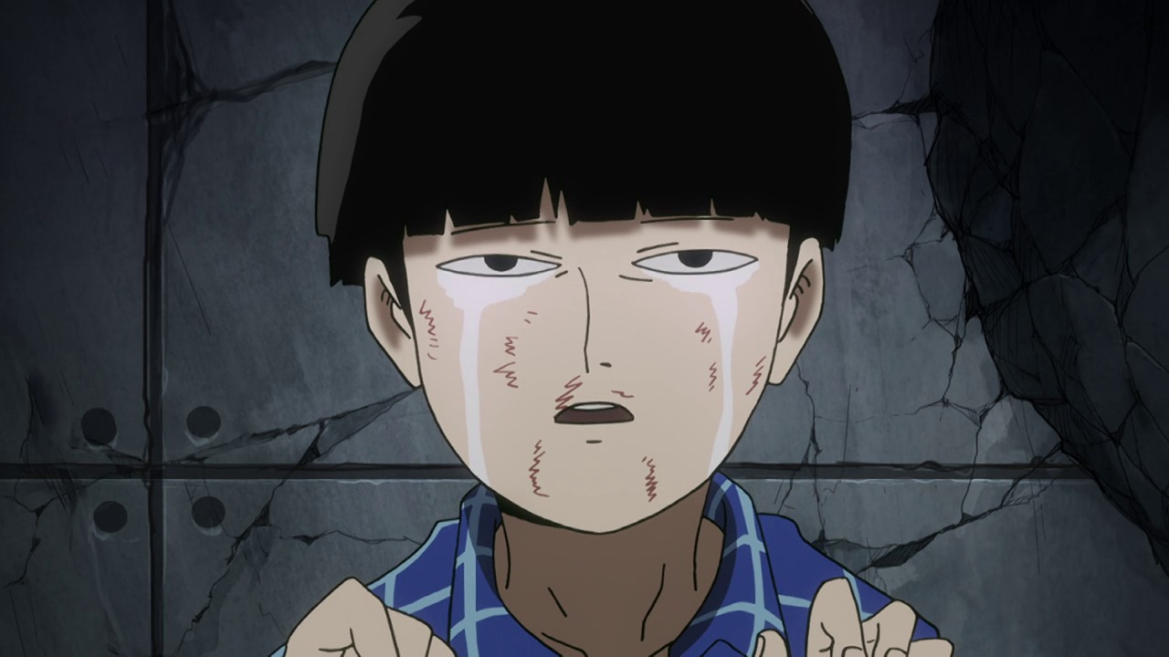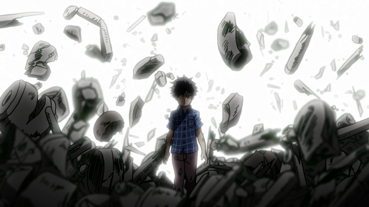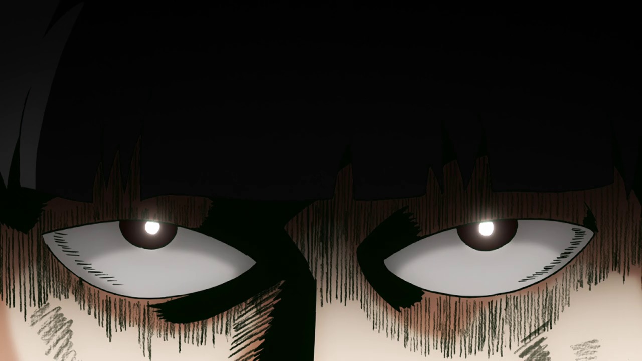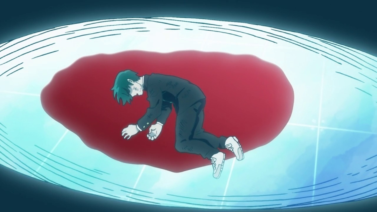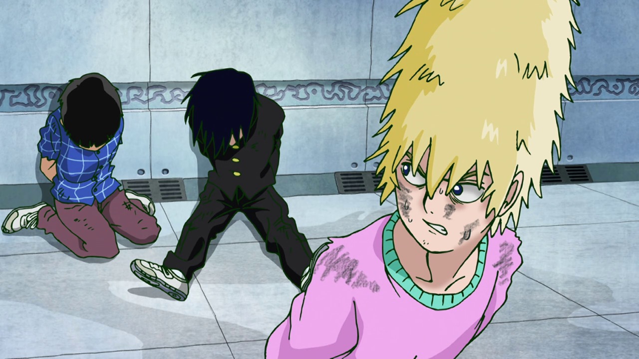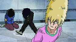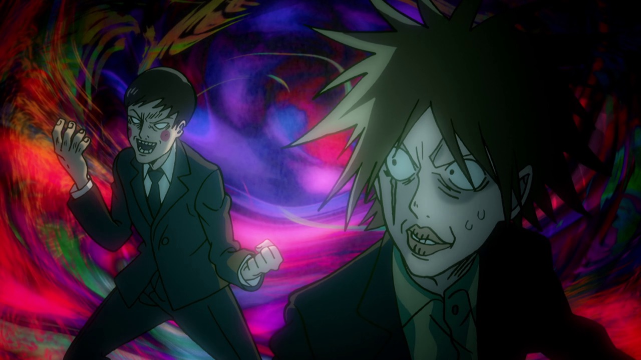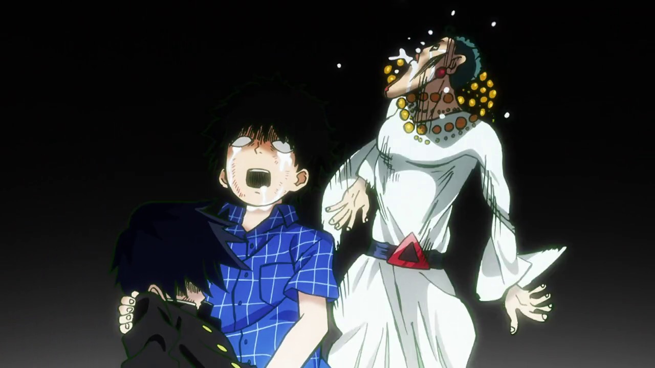 As for Mob, he’s clearly a world above any scar we’ve seen (“I know you were about to do something” he tells a scar he’s just flattened, “but I’m in a hurry.”) – his darkest moment comes when he breaks down in tears at the notion that he must beat up a woman (the scar Tsuchiya) because Reigen has told him boys who hit girls are the lowest of the low. It’s a classic Mob moment – his innate decency and pacifist spirit shining through even as he’s being forced to become a beast. It’s the illusionist Mutou who finally pushes Mob to 100 by showing him an illusion of a badly wounded Ritsu – biting off way more than he can chew in doing so. We see something new from Mob here – a “rejection” once he goes on the boil (taking Mutou out in the process), followed by fainting on the spot.