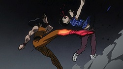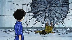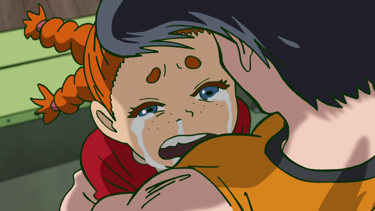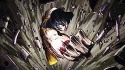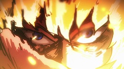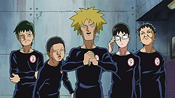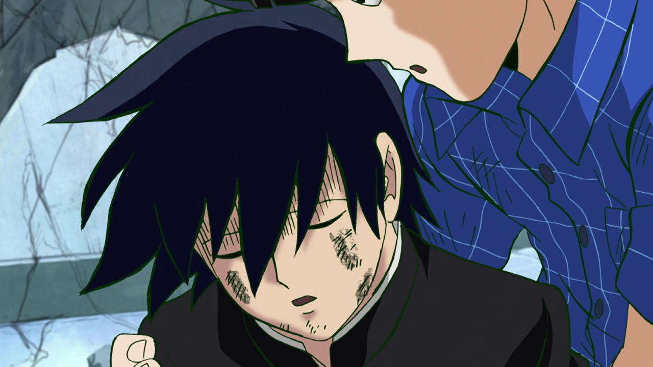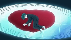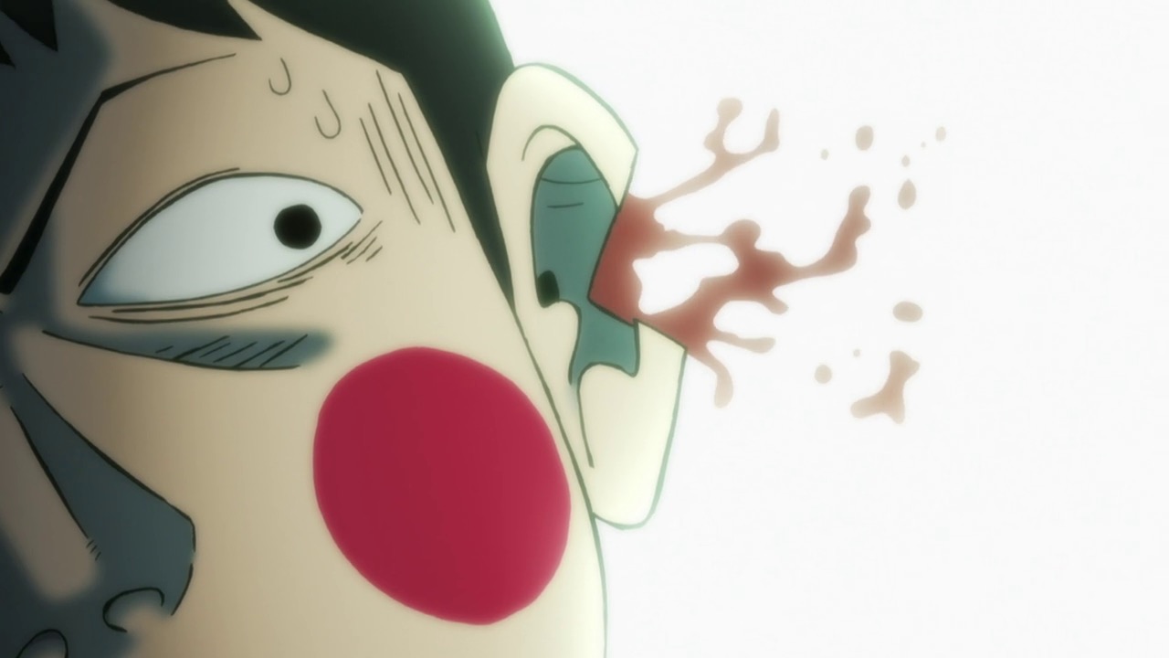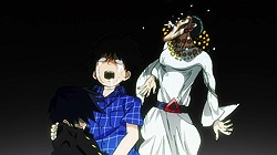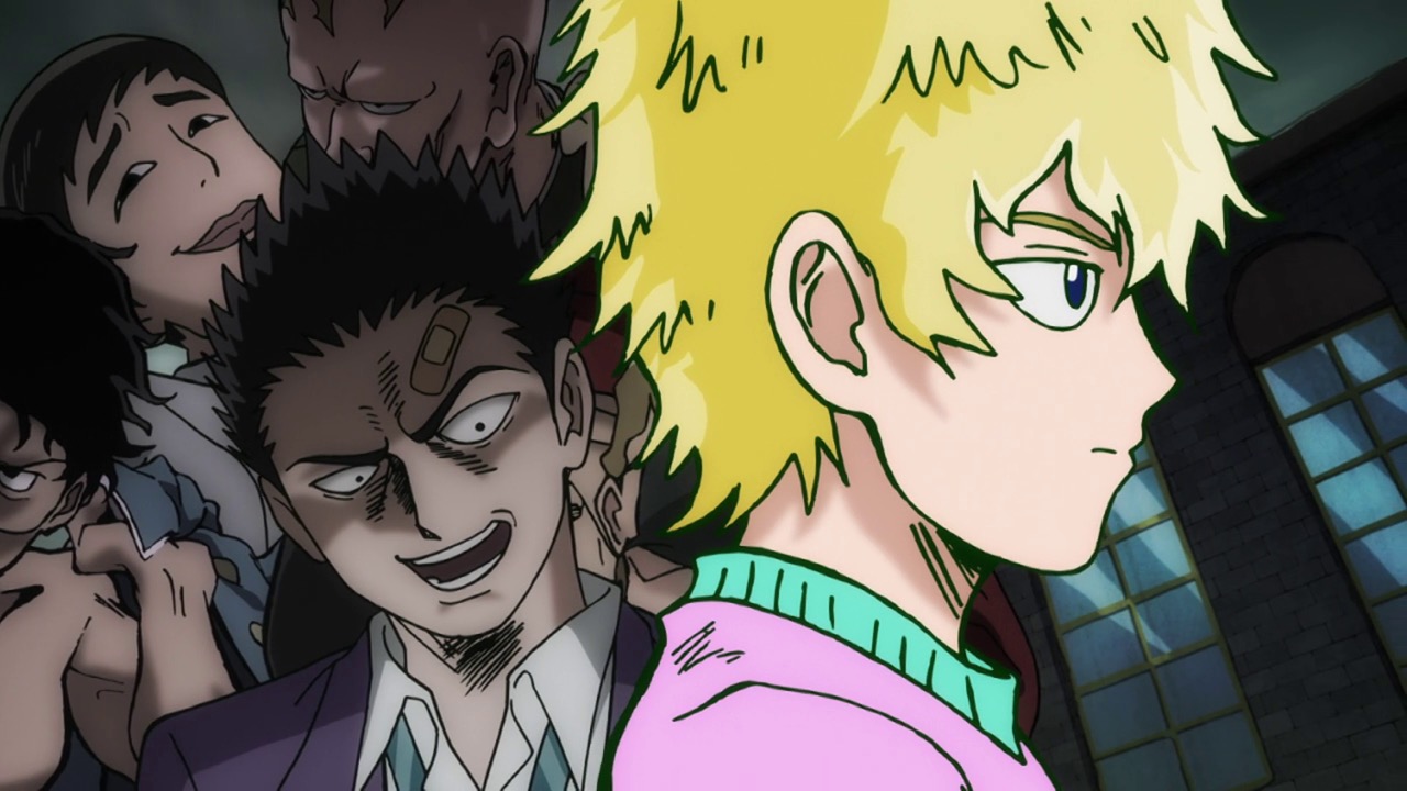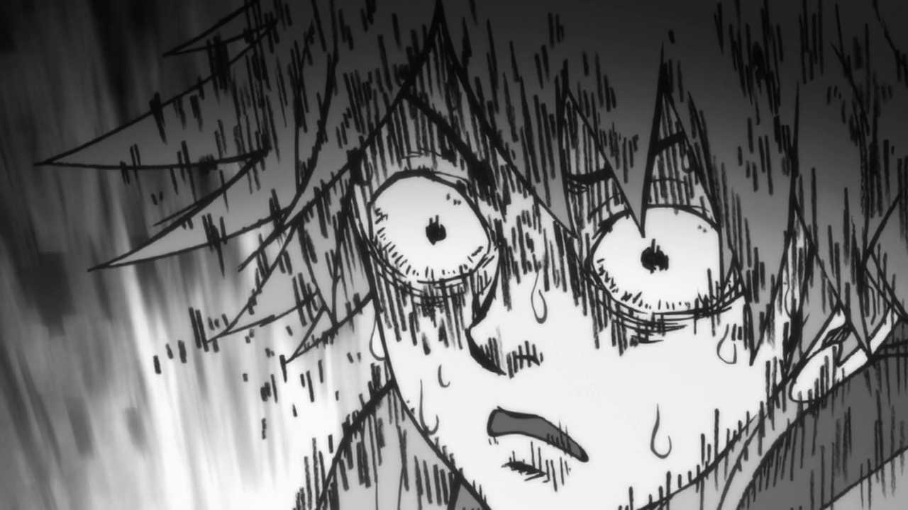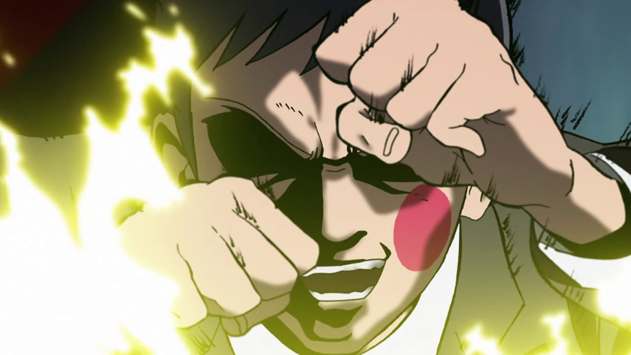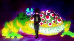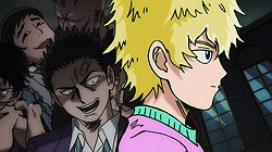 As for Mob, he’s clearly a world above any scar we’ve seen (“I know you were about to do something” he tells a scar he’s just flattened, “but I’m in a hurry.”) – his darkest moment comes when he breaks down in tears at the notion that he must beat up a woman (the scar Tsuchiya) because Reigen has told him boys who hit girls are the lowest of the low. It’s a classic Mob moment – his innate decency and pacifist spirit shining through even as he’s being forced to become a beast. It’s the illusionist Mutou who finally pushes Mob to 100 by showing him an illusion of a badly wounded Ritsu – biting off way more than he can chew in doing so. We see something new from Mob here – a “rejection” once he goes on the boil (taking Mutou out in the process), followed by fainting on the spot.
