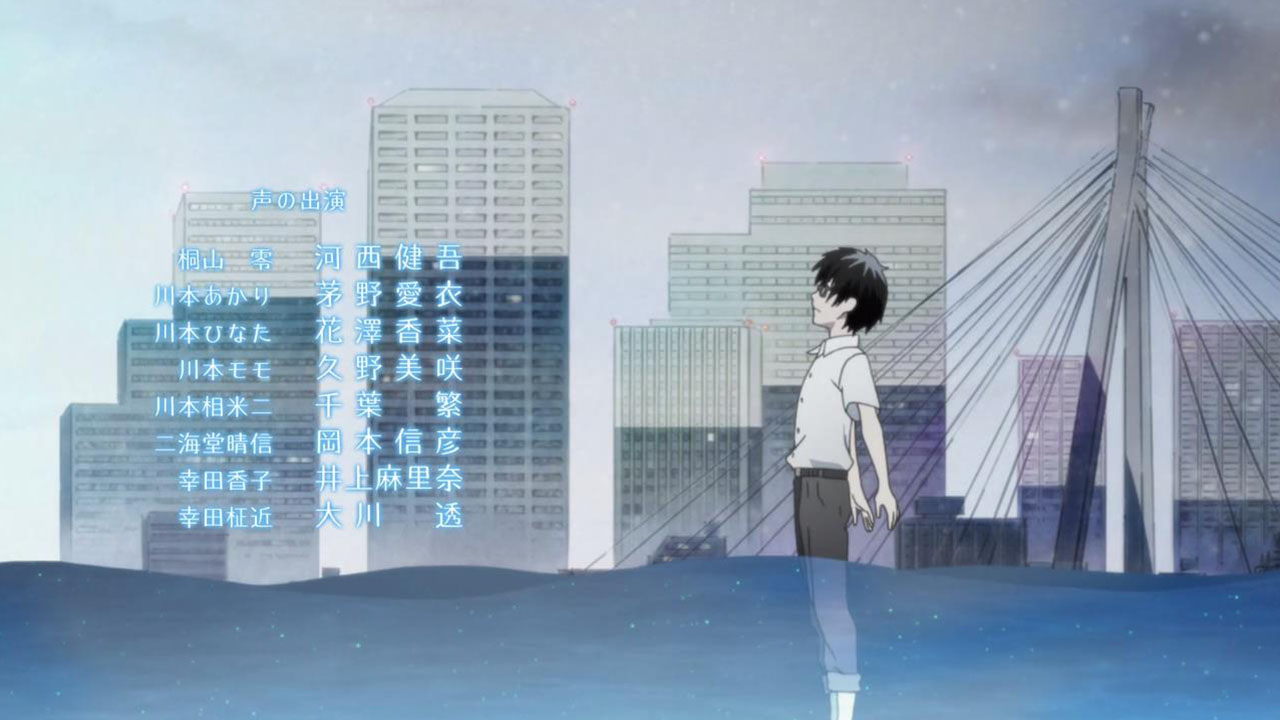 There is an interesting genre of anime that has surprising persistence every season, yet I think we simply don’t talk about enough: the esteemed ‘Anime Where the OP Tells You Nothing About What It Is About’. 3-gatsu no Lion is a natural fit for this category, as you could no doubt tell when you were wondering what manner of Apocalypse it was trying to show in its opening minutes. As I mentioned in the preview, 3-gatsu is the adaptation of the manga of the same name by Umino Chika, who also notably did Honey and Clover. And so 3-gatsu is at once subtle and complicated, and hard to represent with just a minute or so of imagery and a theme song. It might, however, surprisingly be right up the alley of director Shinbou Akiyuki and the studio he is attached to, Shaft. It seems that when faced with complication Shinbou instead goes for abstraction, hoping that along the way a sensible metaphor will appear from somewhere (this time, his favourite motif: water). It’s not quite as pretentious as I make it sound though, for a lot of the things that make good drama like inner turmoil are abstract, so what are we to do?