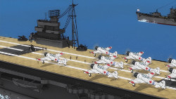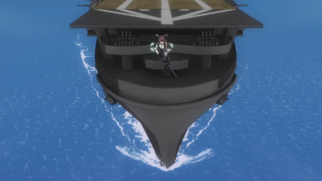I have a feeling that the carrier returning to port was Zuikaku‘s sister ship Shoukaku. Historically though, were they built to similar specifications or were there some minute differences between the two ships? Because if they were built similarly, I’m assuming the CG animators just recycled/cloned Zuikaku‘s model (and added a few differences to the CG ship model as necessary) just for that scene…and then move on to the next scene.