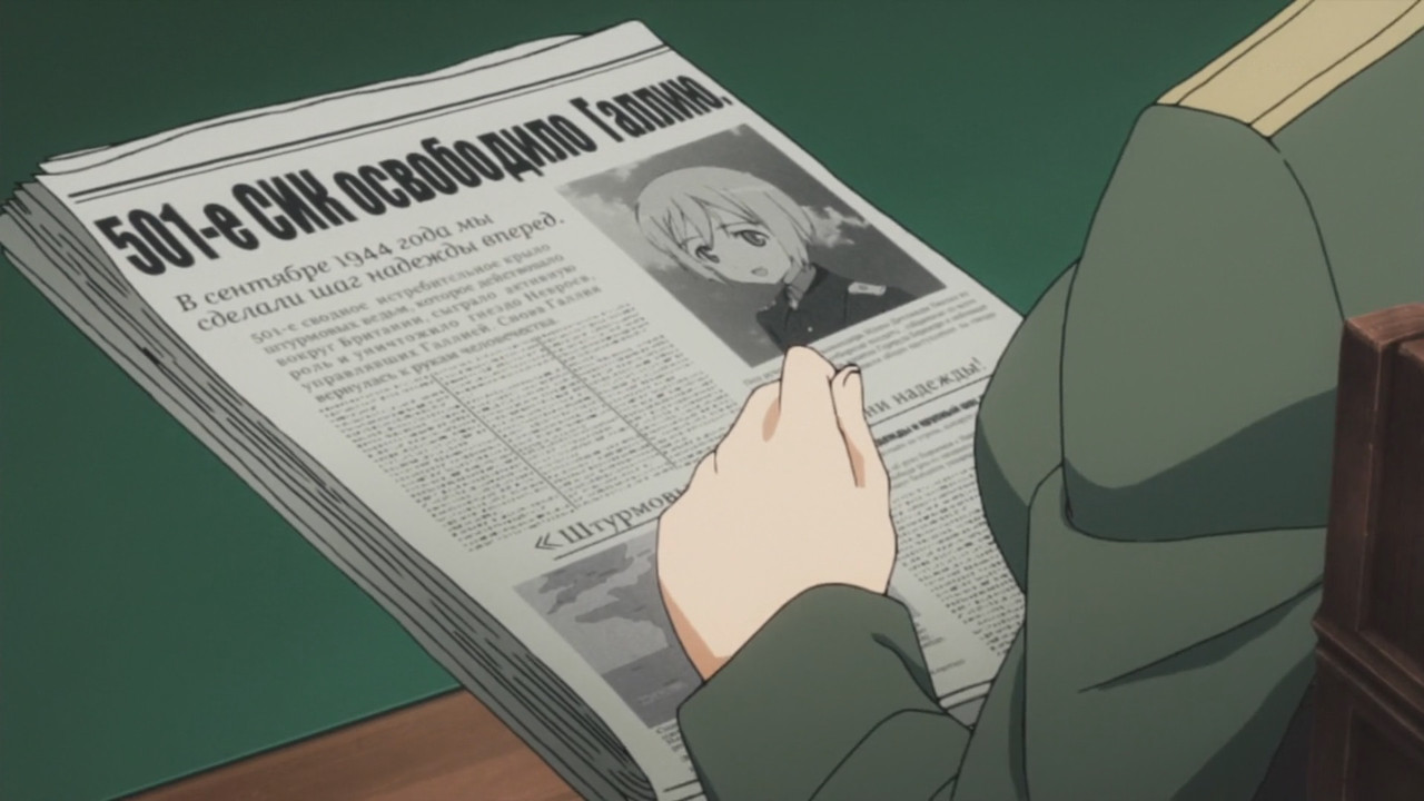 We’re also now officially in-between Strike Witches seasons one and two due to the mention of the Neuroi Nest around Galia being destroyed and with a couple more Strike Witches newspaper references, even one of Erica in Orussia.