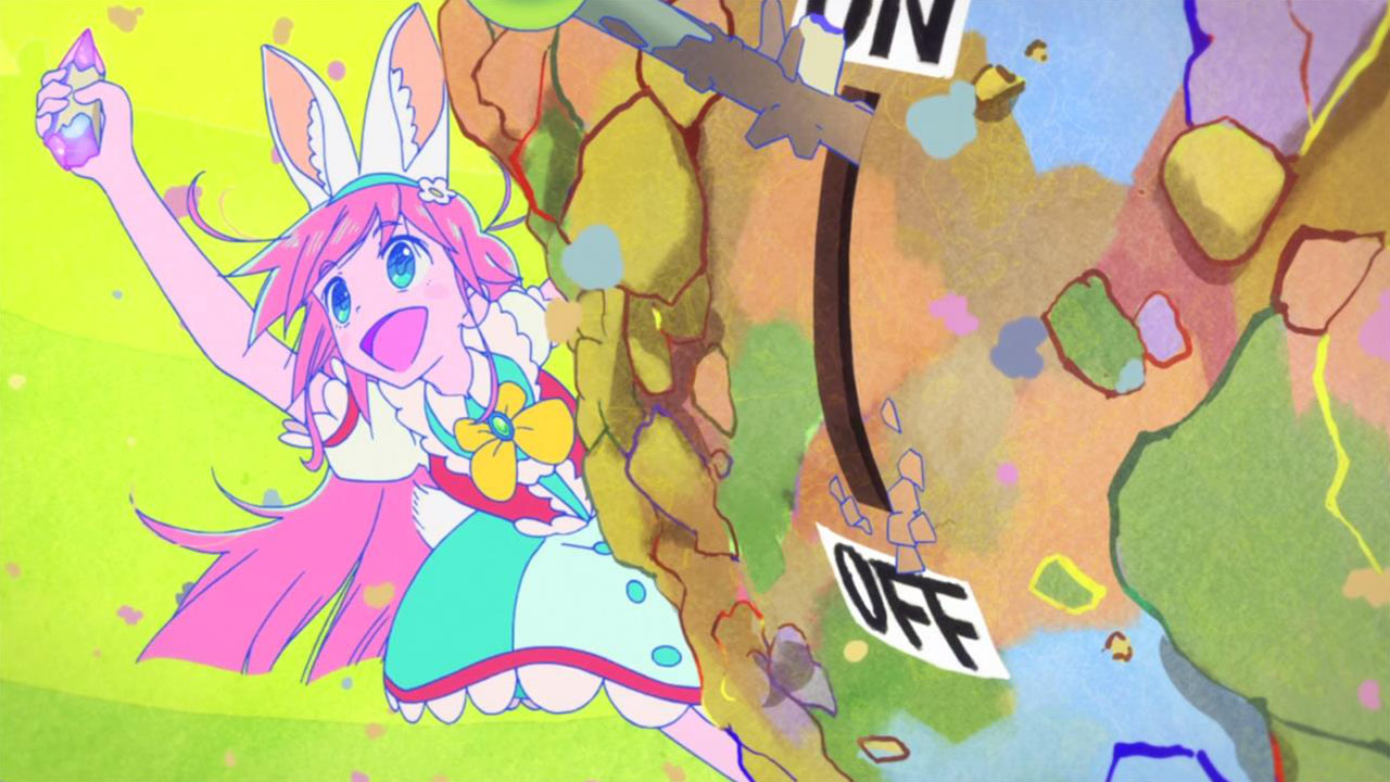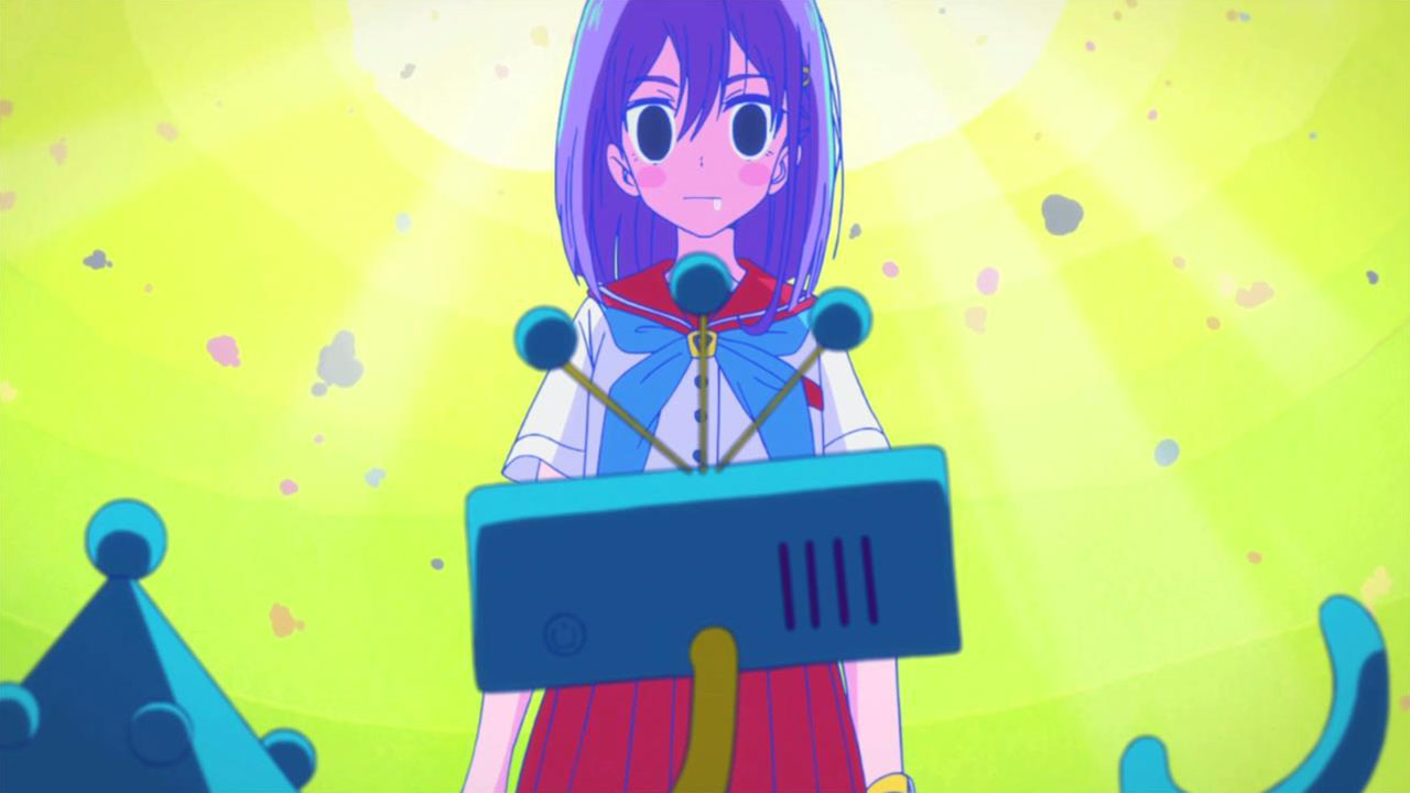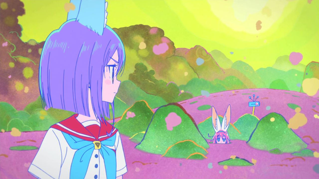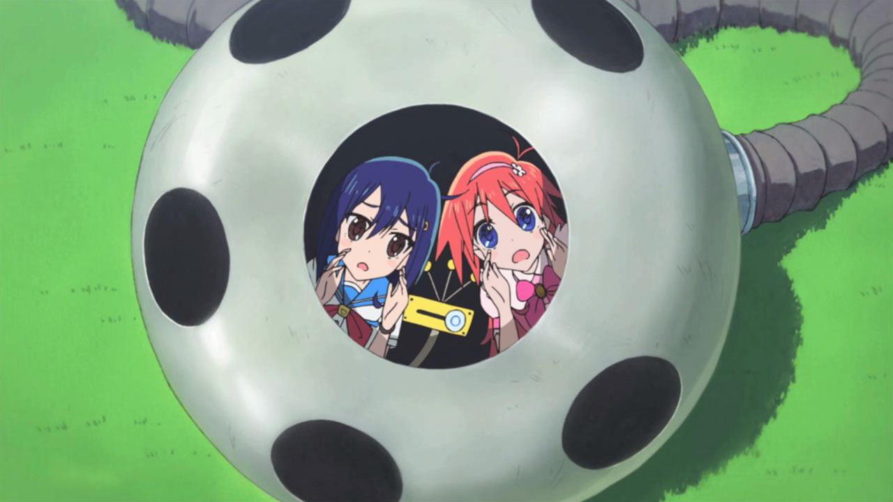 Despite Flip Flappers‘ being, visually, an acid trip all around, this second episode actually played a lot of things by the book. Not the ‘sucked into the surreal world of the sci-fi vacuum cleaner‘ part, of course, but the general strokes of the story may actually be familiar, especially to those of who have watched a fair deal of anime, of the magical girl genre in particular. ‘Familiar’ in more ways than one, for here’s the strange-animal-mascot-thing that is a staple accessory for any aspiring magical girl. Now there’s one for each of our protagonists—a brain in a jar for Papika, and sentient moss for Cocona. Unconventional mascots, to be sure, but there they are all the same, like a proper magical girl anime. They’re even used in familiar ways, in a plotline about chasing down a lost pet that would normally be completely uninspiring. Meanwhile, Papika literally sounds the Call to Adventure, and Cocona literally rejects it. This is every story ever, right? In that, at least, Flip Flappers is very straightforward.