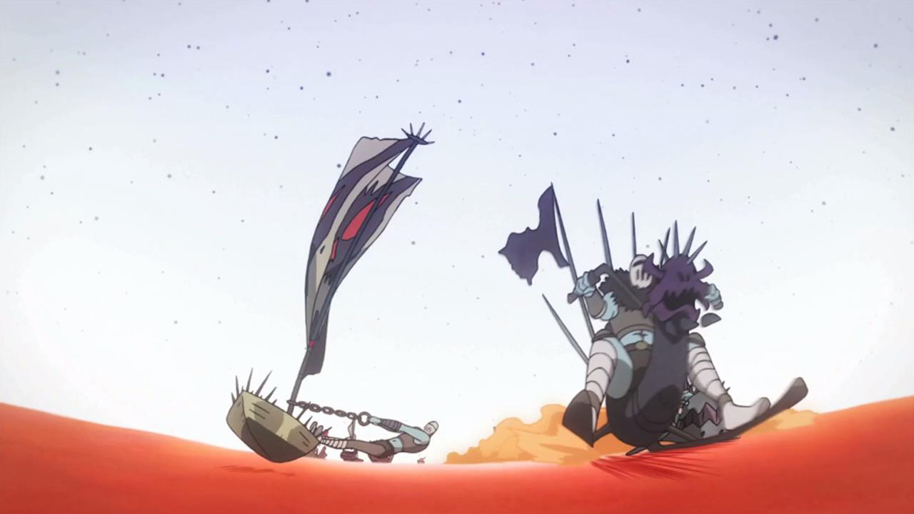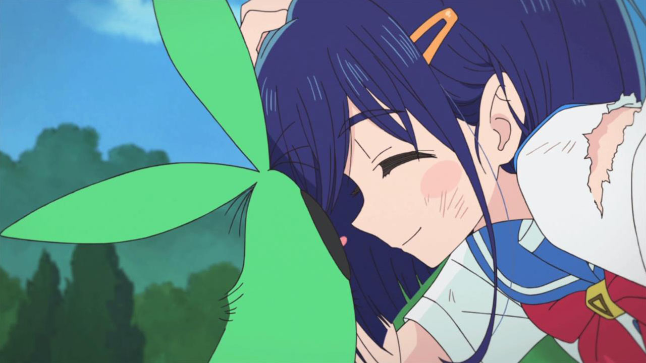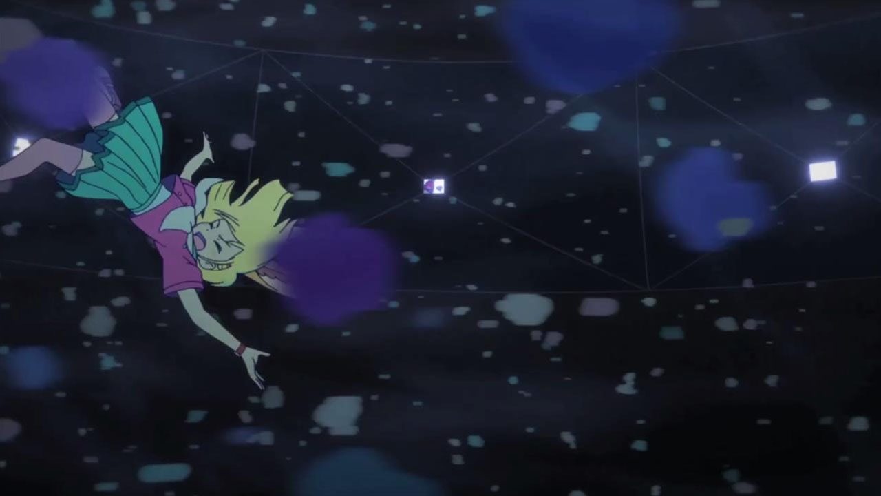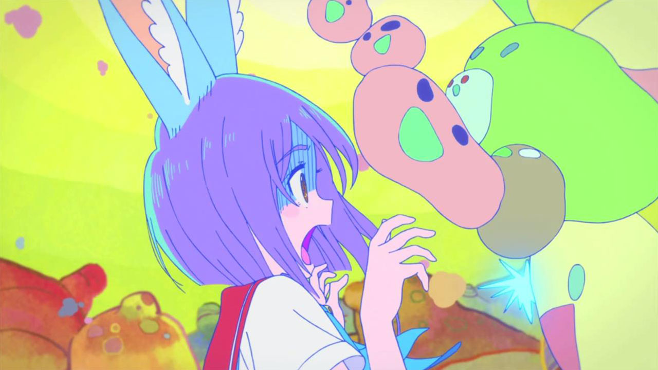 Despite Flip Flappers‘ being, visually, an acid trip all around, this second episode actually played a lot of things by the book. Not the ‘sucked into the surreal world of the sci-fi vacuum cleaner‘ part, of course, but the general strokes of the story may actually be familiar, especially to those of who have watched a fair deal of anime, of the magical girl genre in particular. ‘Familiar’ in more ways than one, for here’s the strange-animal-mascot-thing that is a staple accessory for any aspiring magical girl. Now there’s one for each of our protagonists—a brain in a jar for Papika, and sentient moss for Cocona. Unconventional mascots, to be sure, but there they are all the same, like a proper magical girl anime. They’re even used in familiar ways, in a plotline about chasing down a lost pet that would normally be completely uninspiring. Meanwhile, Papika literally sounds the Call to Adventure, and Cocona literally rejects it. This is every story ever, right? In that, at least, Flip Flappers is very straightforward.