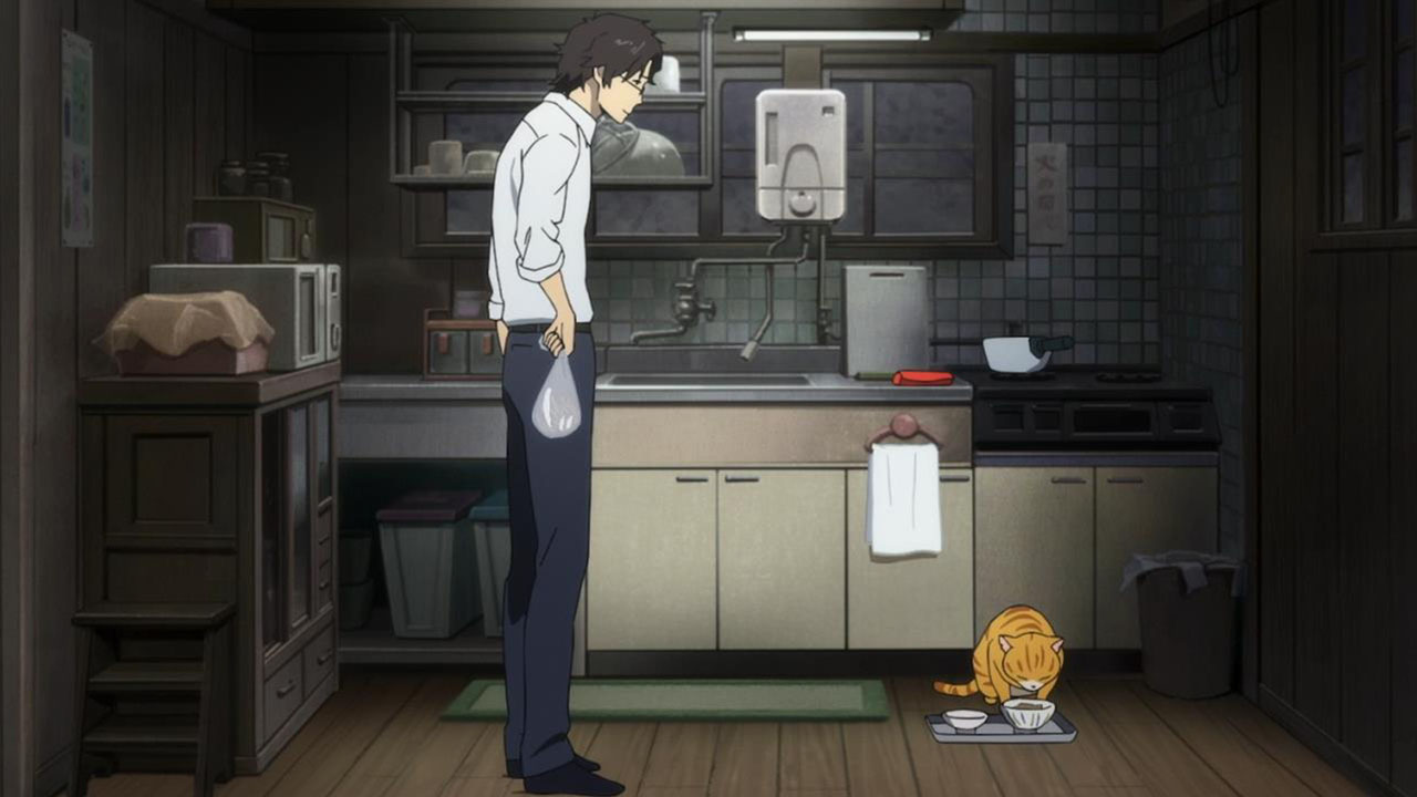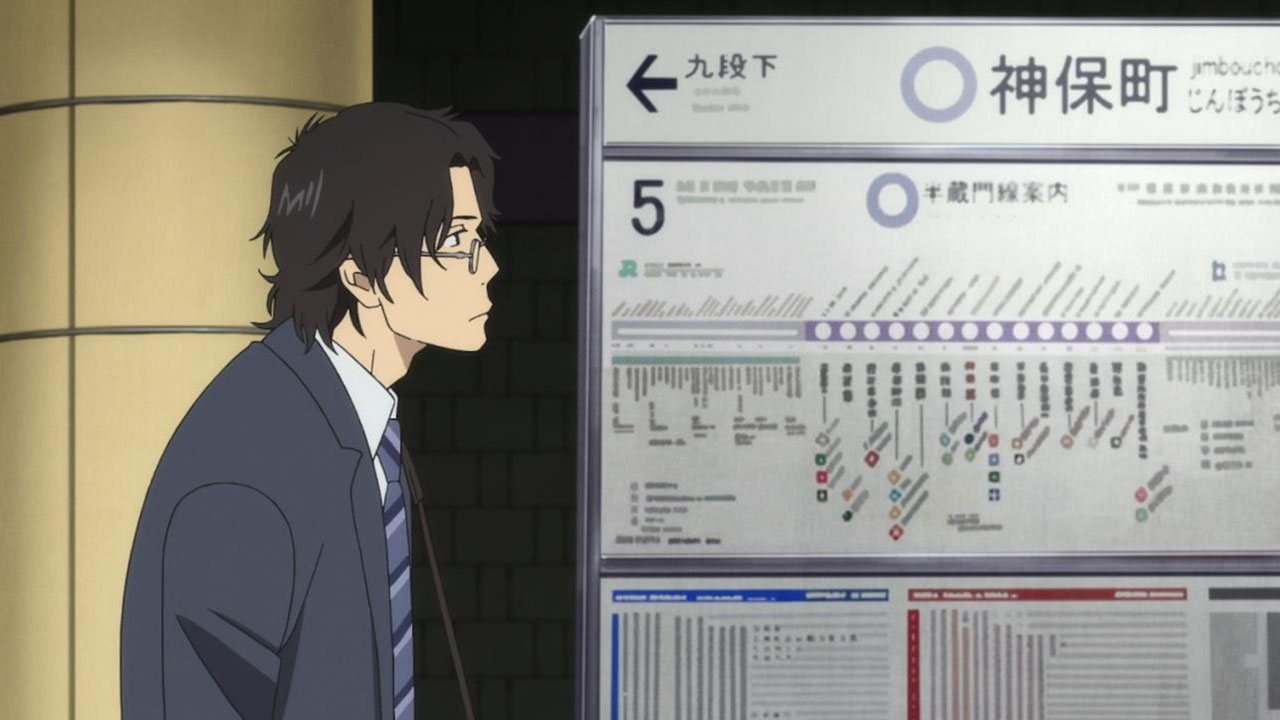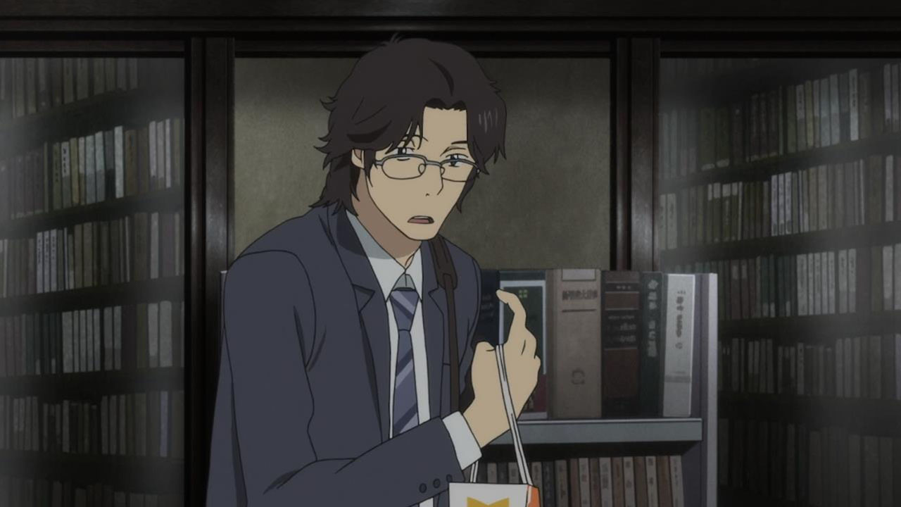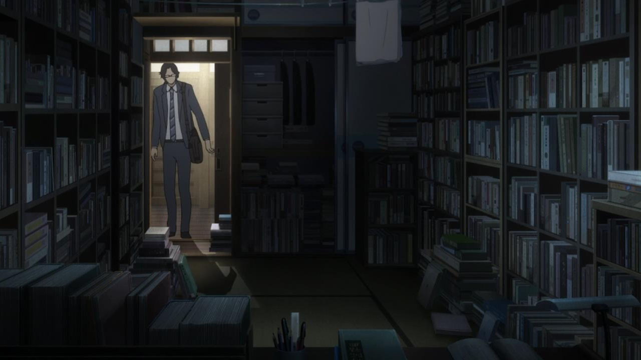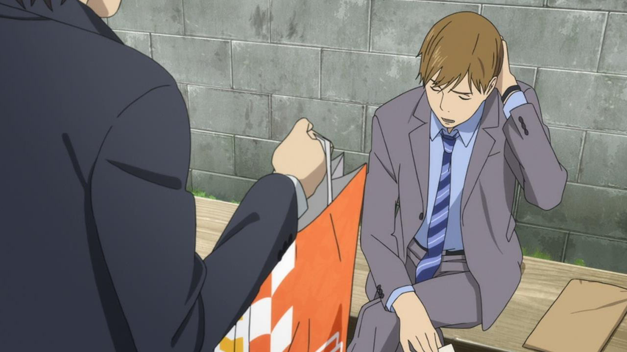 Majime Mitsuya (Sakurai Takahiro) is a funny one – a not very good salesmen who has a borderline obsession with words, to the point where he even dreams about Kanji characters in his nightmares. He may be a word otaku (if that’s really a thing), but he’s instantly likeable in how genuine his mannerisms come across; he’s unassuming and gentle but clearly has a lot on his mind that he doesn’t have the opportunity to express. We get a valuable slice of his life in the way his room is cluttered with books, the way he interacts with his cat, and eats dinner with the lonely old woman upstairs. Those little moments are charming and help establish how he’s just living each day as it comes without any true purpose.