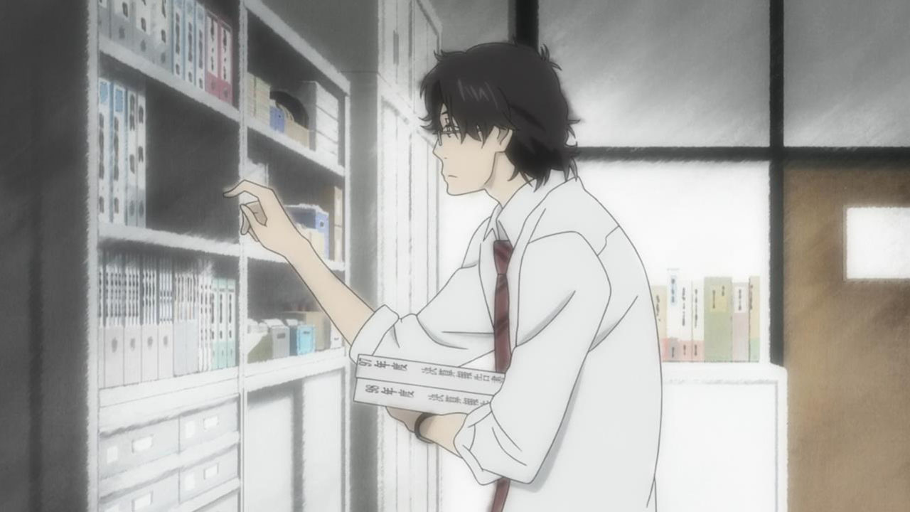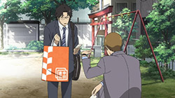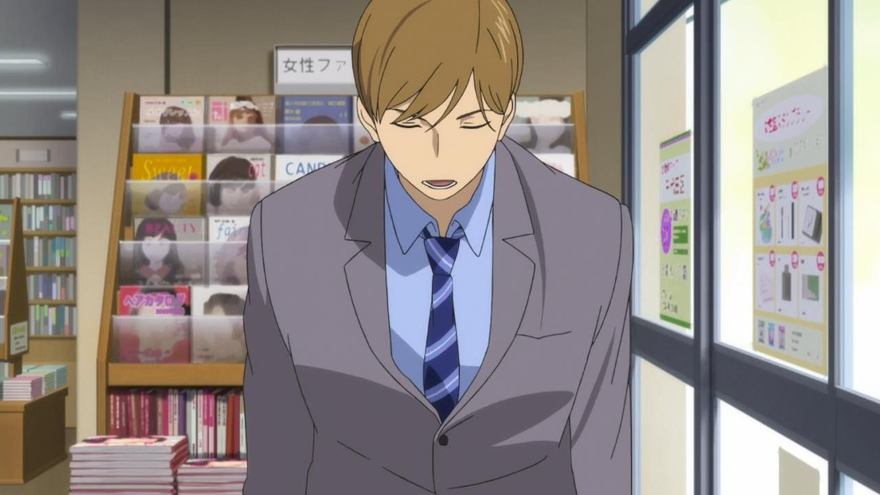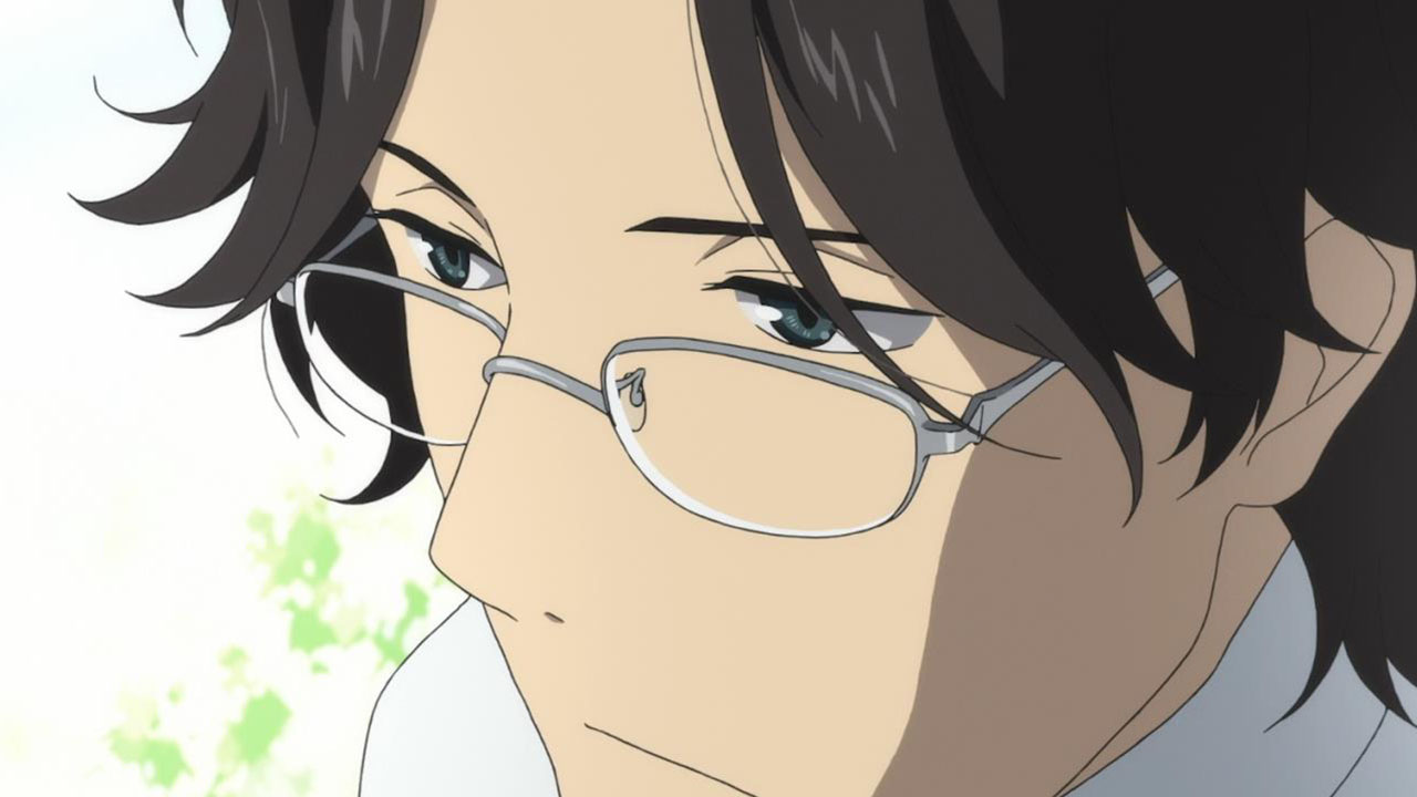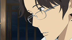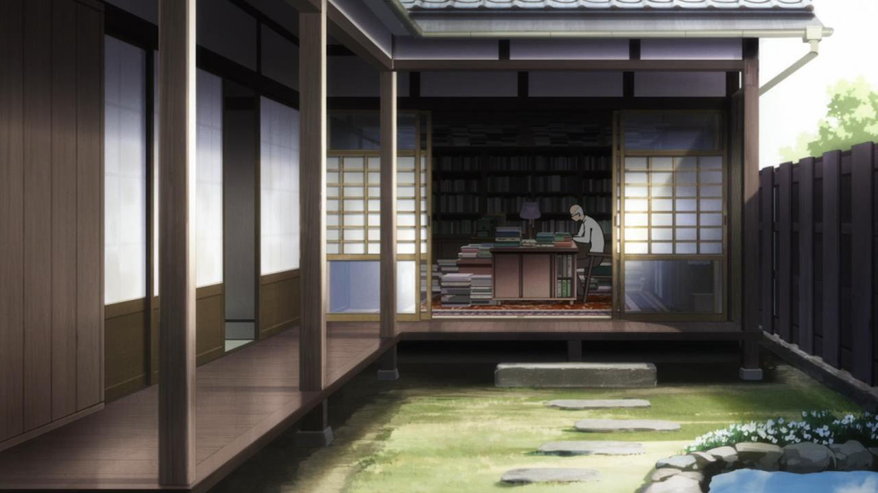 Majime Mitsuya (Sakurai Takahiro) is a funny one – a not very good salesmen who has a borderline obsession with words, to the point where he even dreams about Kanji characters in his nightmares. He may be a word otaku (if that’s really a thing), but he’s instantly likeable in how genuine his mannerisms come across; he’s unassuming and gentle but clearly has a lot on his mind that he doesn’t have the opportunity to express. We get a valuable slice of his life in the way his room is cluttered with books, the way he interacts with his cat, and eats dinner with the lonely old woman upstairs. Those little moments are charming and help establish how he’s just living each day as it comes without any true purpose.