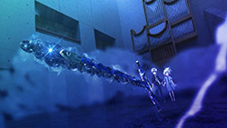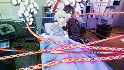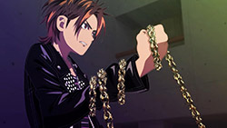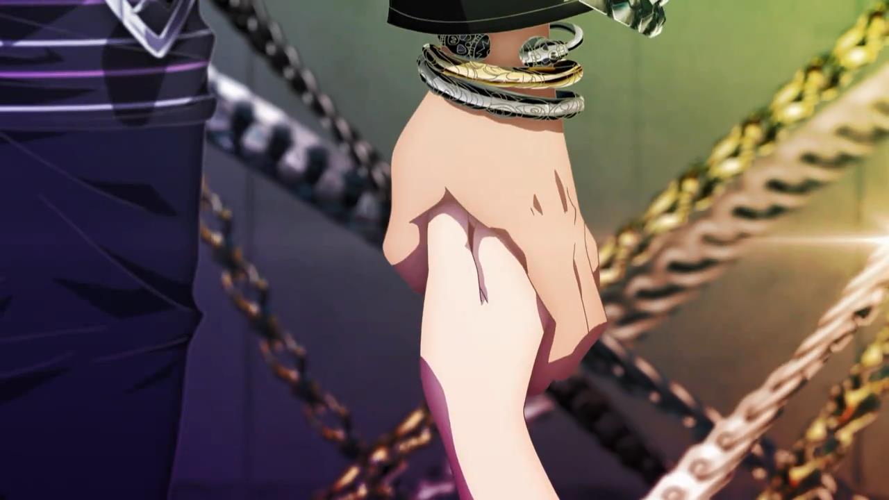 Hand Shakers’ problems are immediate from the get go, with the largest culprit being the animation. Although one should know what one is getting into with GoHands (the producers of K), it seems like the studio decided to go more experimental and less quality control this time around. Panoramic shots greet nearly every major environment, with heavy emphasis on crowd scenes in particular. Normally this would be intriguingly novel, but the idea loses its charm after experiencing it several times in a row. Combine that with some seriously distorted perspective shots, shaky camera movements, and claustrophobic colour schemes, and the whole thing risks turning into a vertigo-inducing mess. That doesn’t even touch on the 3D either, which at times works seamlessly with the 2D artwork—particularly in character-centered scenes like those crowds—but often runs at a different frame rate to the 2D, simply enhancing all the aforementioned cinematic issues and aggravating the viewer’s focus. The chain CGI and those hilarious breast physics just add the cherry on top to this dilapidated mix.