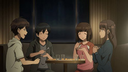 Think last episode: Shouichi is aimless and decides to apply himself to studying. What happens? He does well- he gets surrounded by people, praised, and held up despite not actually being all that bright himself. He’s normal, middle-of-the-pack when it comes to the study camp, but constantly seen with friends and has a good relationship with family who supports him.