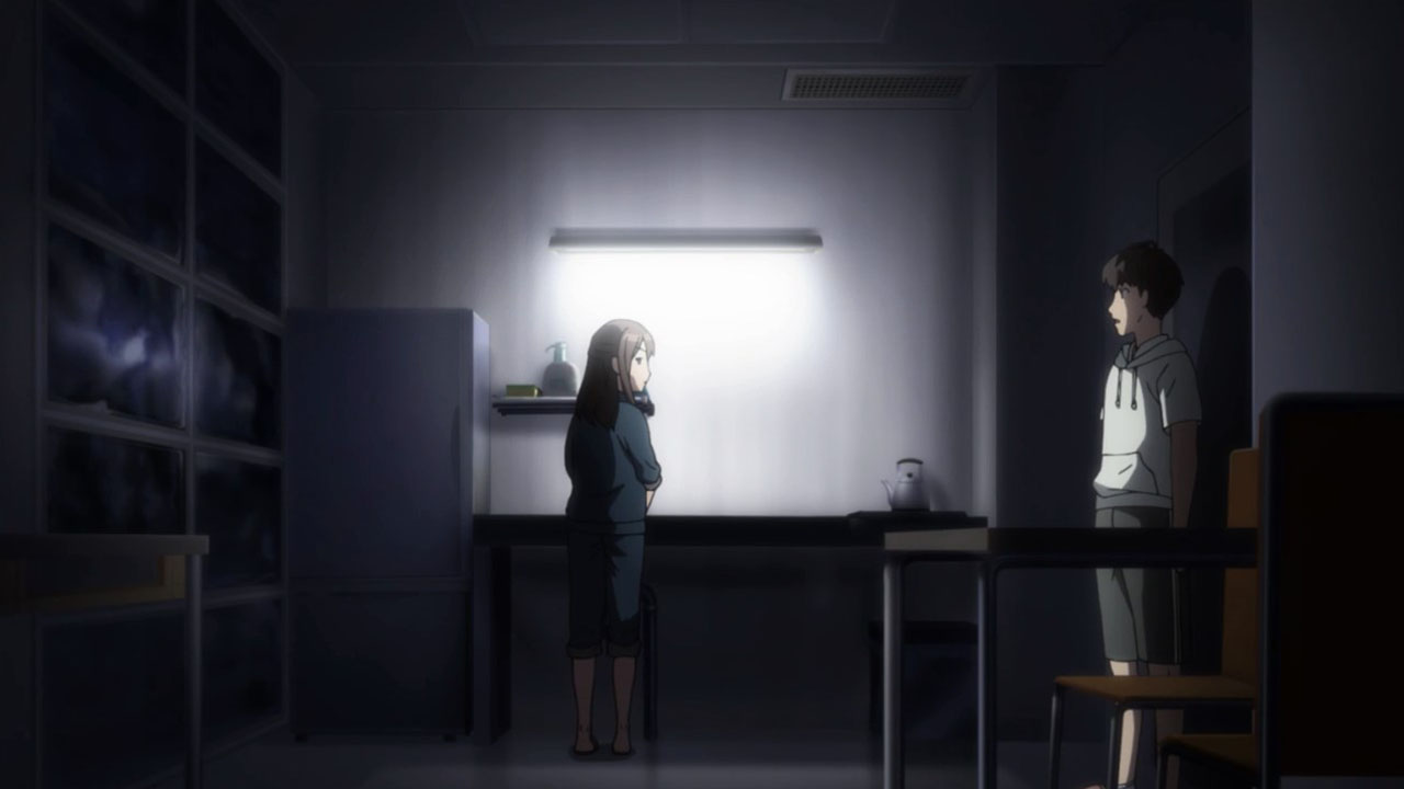 I think it’s clear that Hikari is supposed to be a pretty but pretty isolated person who expects the worse from others, and has learned to cope with social isolation by compensating. She’s not always happy- look at how she lacks her sunny and cheerful public demeanor when she’s with Shouichi in his room, or the lighting effect at the end when she’s preparing to leave- but she’s consistently so in public. Shoichi reflects in the washerroom that she seems to be able to be upbeat and cheerful any time and any place, but I suspect the Hikari we see at the start and end of the episode- gloomy, not smiling, not cheerful- is the ‘real’ her.