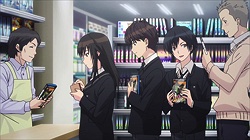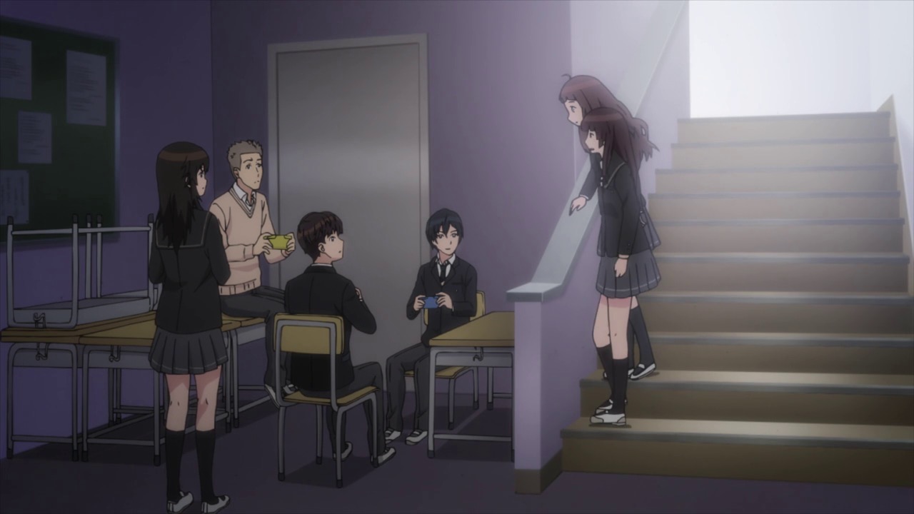 While Ikuo may have started earlier, we also know that he can unwind–he readily agreed to Shouichi’s suggestion to visit the next town’s arcade after the mid-terms. We also saw him unusually happy at the start of episode 4, apparently having something to do with having found a girl he likes (or maybe he was just happy for Araki, but that is very oddly happy for his friend). We therefore know he is not adverse to non-studious pursuits.