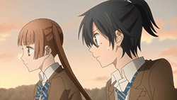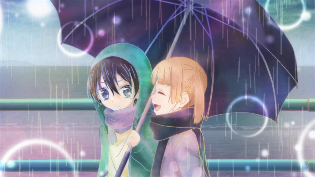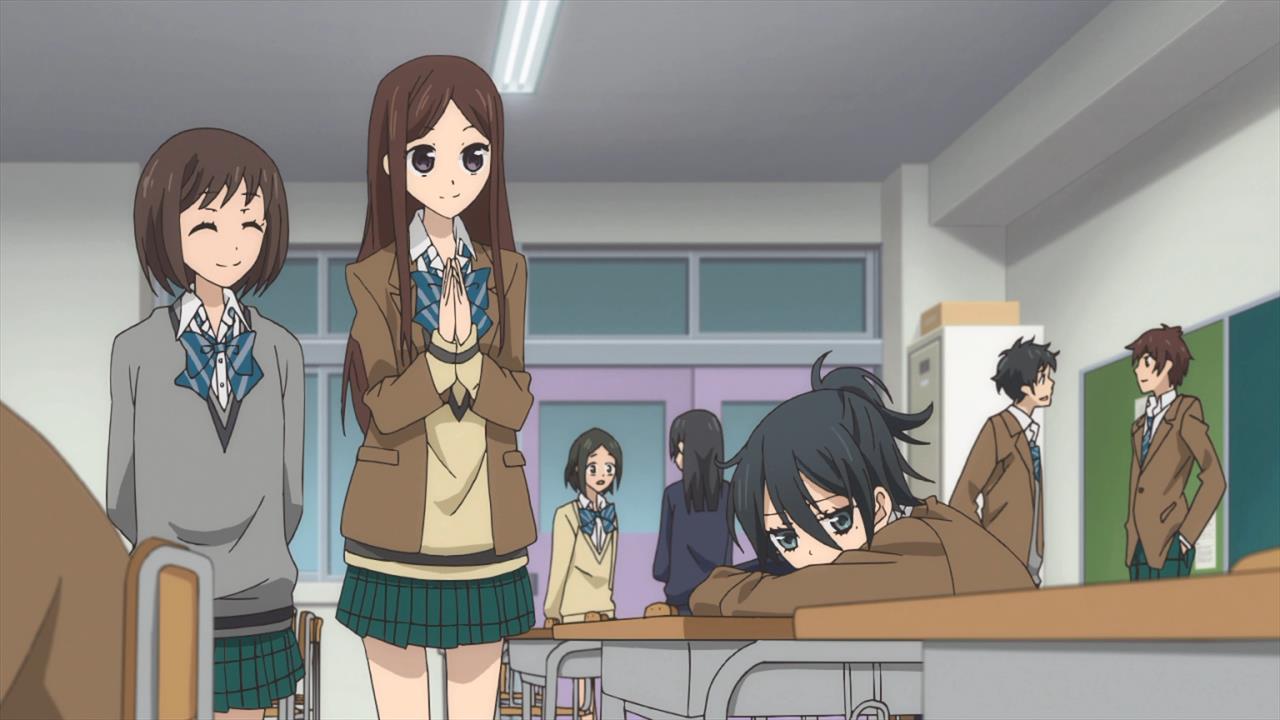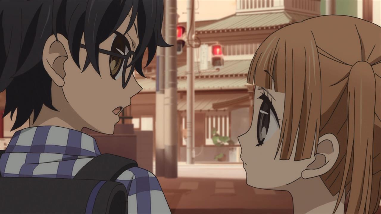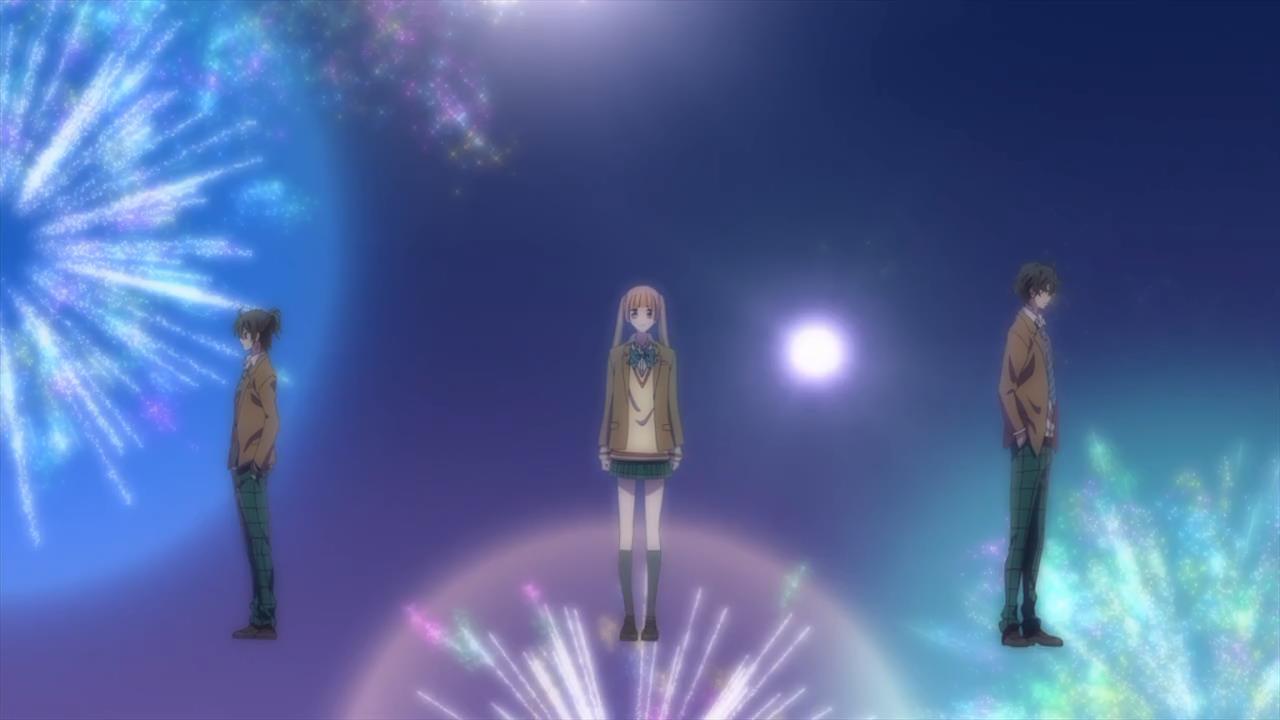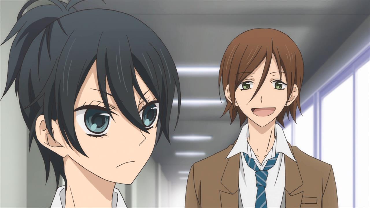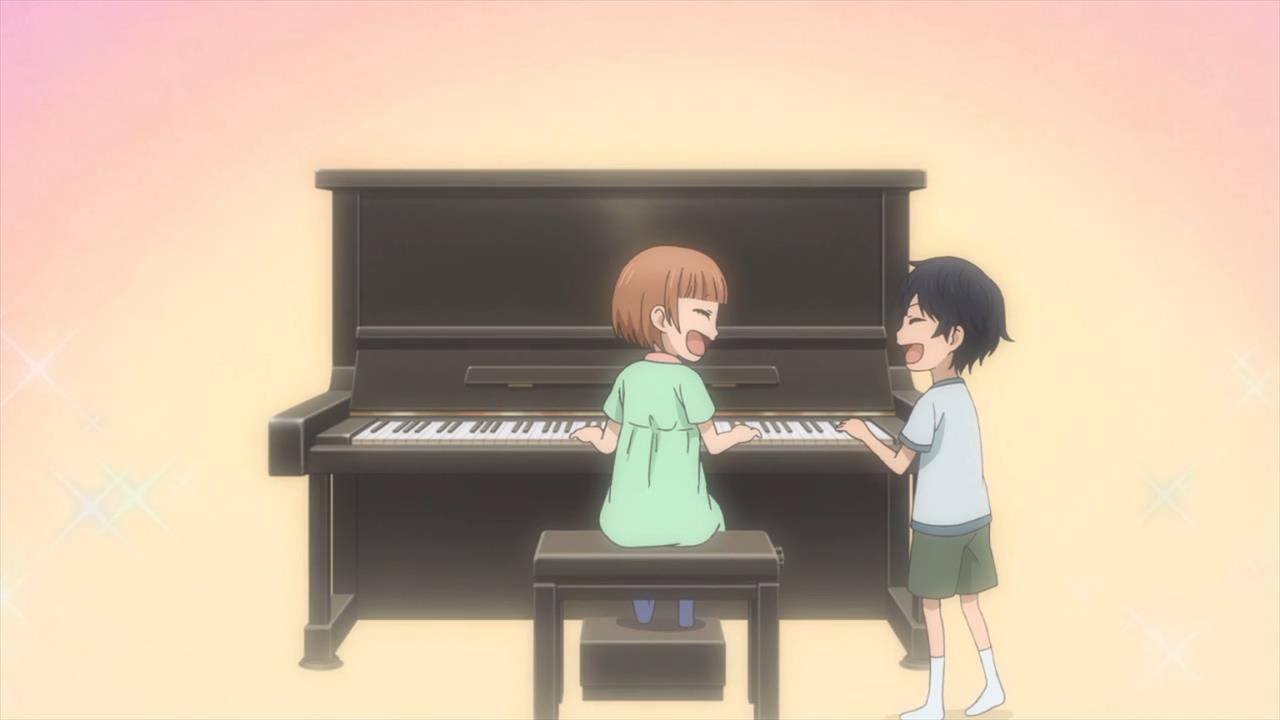 Anyway! Complaints aside, I think the story is fine. I havent read the manga, but Ive read numerous complaints that the story is told out of order. I dont think it deters from the basis of the story and at least, its not confusing. You have a young Nino who is good friends with Momo growing up and they both encourage each other to sing. They have a relationship thats seemingly closer than just neighbors and friends but as kids, Ill say that its deep infatuation (rather than love). When Momo skips town one day, Nino doesnt really know why but decides to sing a melody which she sees in the sand, in hopes that it reconnects her with Momo. We quickly find out that the melody is written by a young Yuzu (who is coincidentally drinking milk? Why so short then?) and they form a friendship where Nino sings Yuzus songs, helping her bring her friend back. Yuzu is a lot easier to read and he clearly likes Nino but he also says goodbye after some time together, leaving her with nothing but a song written in sand. Flash forward to the present… and they finally meet again in high school.