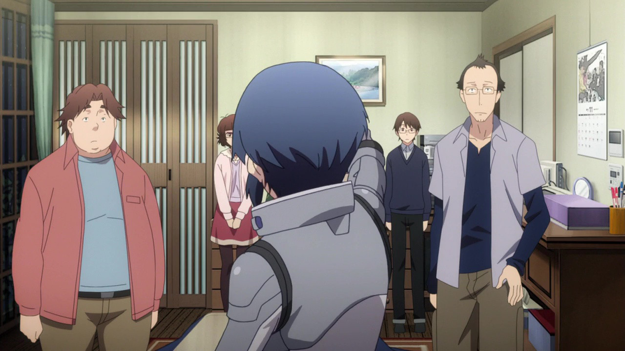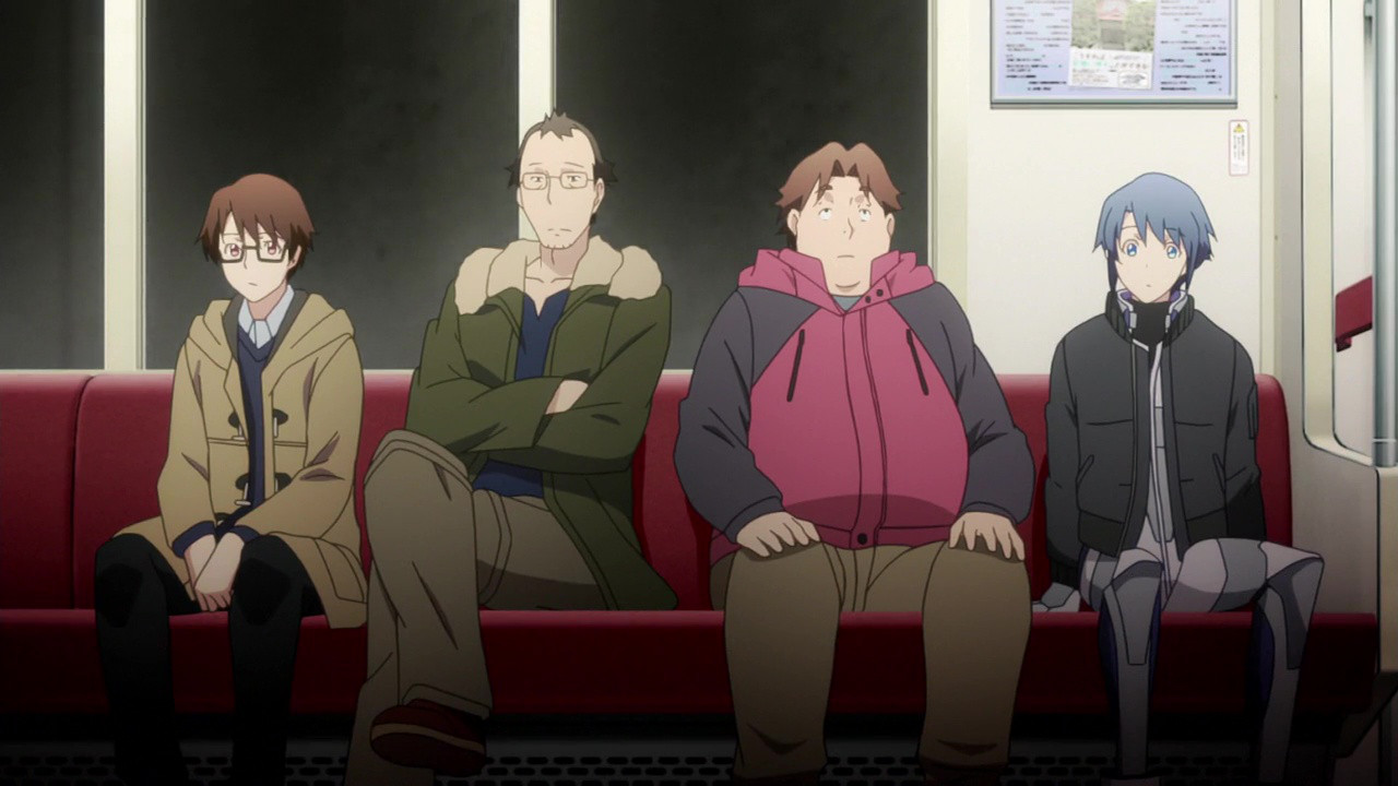 Definitely my favorite episode out of what has turned out to be a surprisingly good show.Gotta say, though, the “twist” with Souta strikes me as really weird. He’s what, 16 years old? Not really old enough to forget anything he spend a significant amount of time working on, especially something that–presumably–happened relatively recently.At one point mid-way through the episode I theorized that maybe Gunpuku was just some random character he designed for 2chan and forgot about, which was then adopted/co-opted by bigots and assholes (thus creating the “popular conception” that seems to be necessary for these characters to exist). Maybe it’s a good thing they didn’t do anything so topical–can’t piss off that otaku demographic!Still, though… this plot twist just doesn’t sit right with me. Either he was directly involved with or knew someone who was directly involved with a person who created a character who became sufficiently popular to be “realized” in the real world… and forgot about it? Gimme a break.
