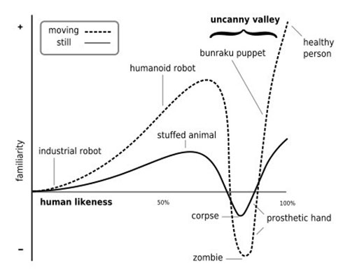 Some of you may have heard of the ‘uncanny valley’, but I’ll summarise it in the most basic way. Humans tend to look for human qualities to things: consider the way Pixar can anthropomorphise anything and a colon and parenthesis makes a smiley face :). However, when an object gets too close to looking human our brains switch over to emphasising the qualities that detract from that object’s humanity. Zombies are the classic example.