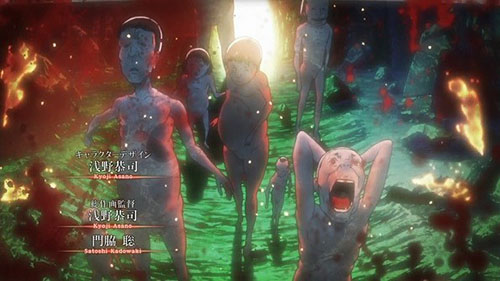 Shingeki no Kyojin, however, is not an horror anime. It is about mankind’s struggle against an oppressive foe. Still, the first episode peddles heavily in fear, though less in the audience and more as part of the general atmosphere of its world. Remember how we were talking about monster design just now? The titular ‘kyojin’ (giants, titans, whatever) are the resident monsters. Let’s have a closer look at them.