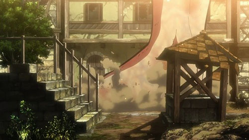 Mankind will eventually follow the premise of the story and learn more about the kyojin and tentatively start a counterattack. For episode 01, however, the kyojin are a force of nature with lots of teeth. Humans are insignificant. All developments from this point are tinted by that lens. Shingeki no Kyojin wants you to know: this is not a happy story.