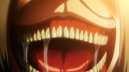 Shingeki no Kyojin slow-rolls the devouring, both evoking images of cannibalism and also triggering a very deep fear which mankind has forgotten. In the modern world, humans are the apex predators, no contest. In Shingeki no Kyojin, they sit under the kyojin. Notice the focus on teeth:
