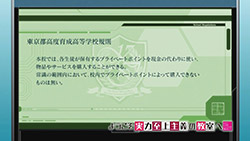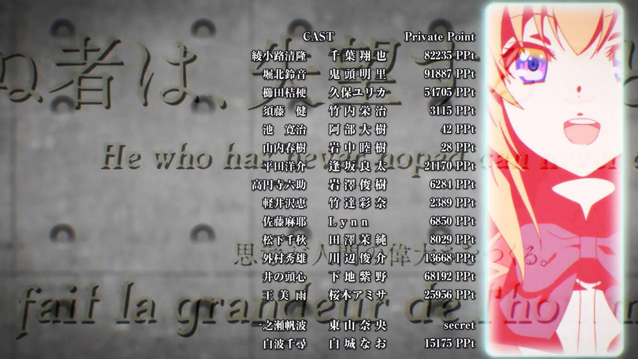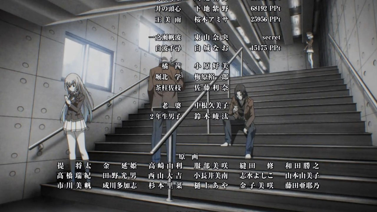 And yet, compared to what the students in AssClass or BakaTest had to endure, being short on cash—if you were unwise enough to spend it all, because not all were, as the credits show—doesn’t seem so bad. It’s certainly going to be rough for the next month for those who spent too freely, but if that’s all it is, that’s not so bad. In fact, there’s an argument to be made for using cash to incentivize students to learn, something that’s being tried in various settings in the real world right now. The social sciences run experiments too, after all.
