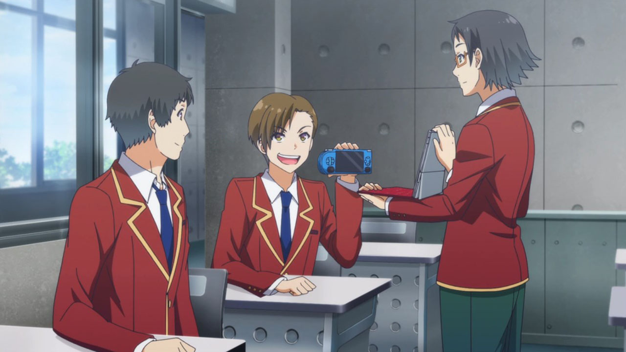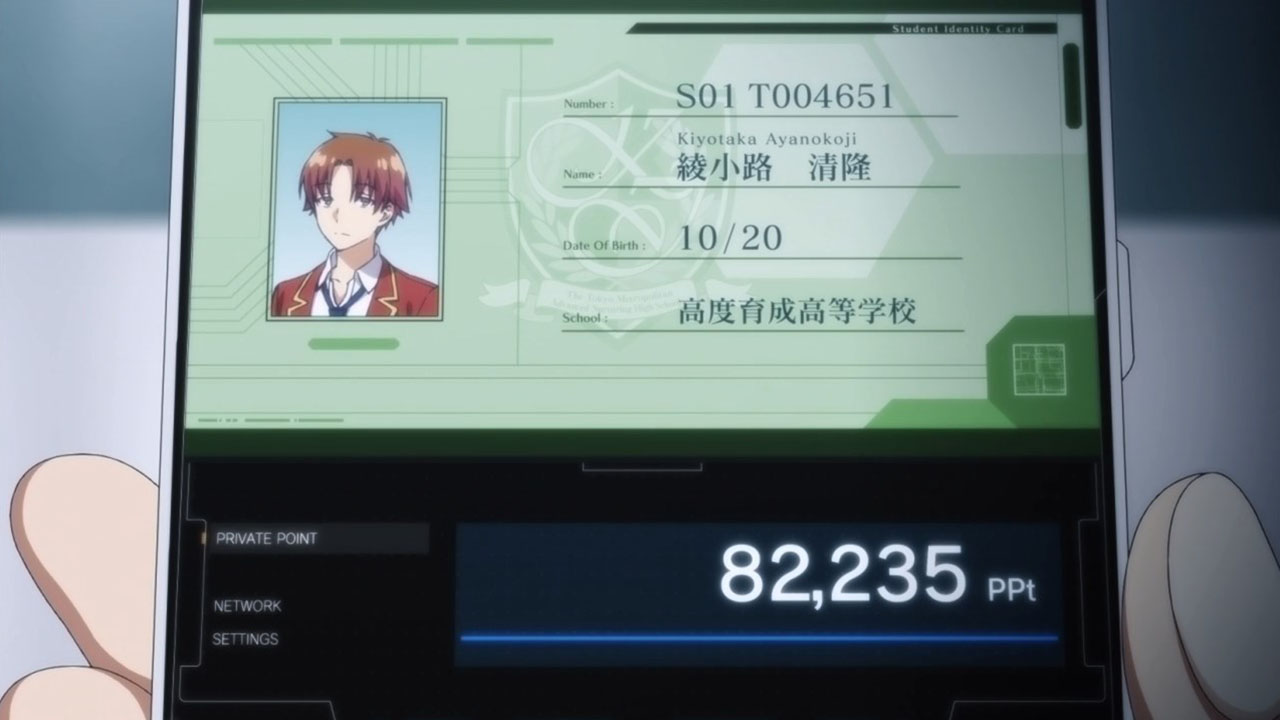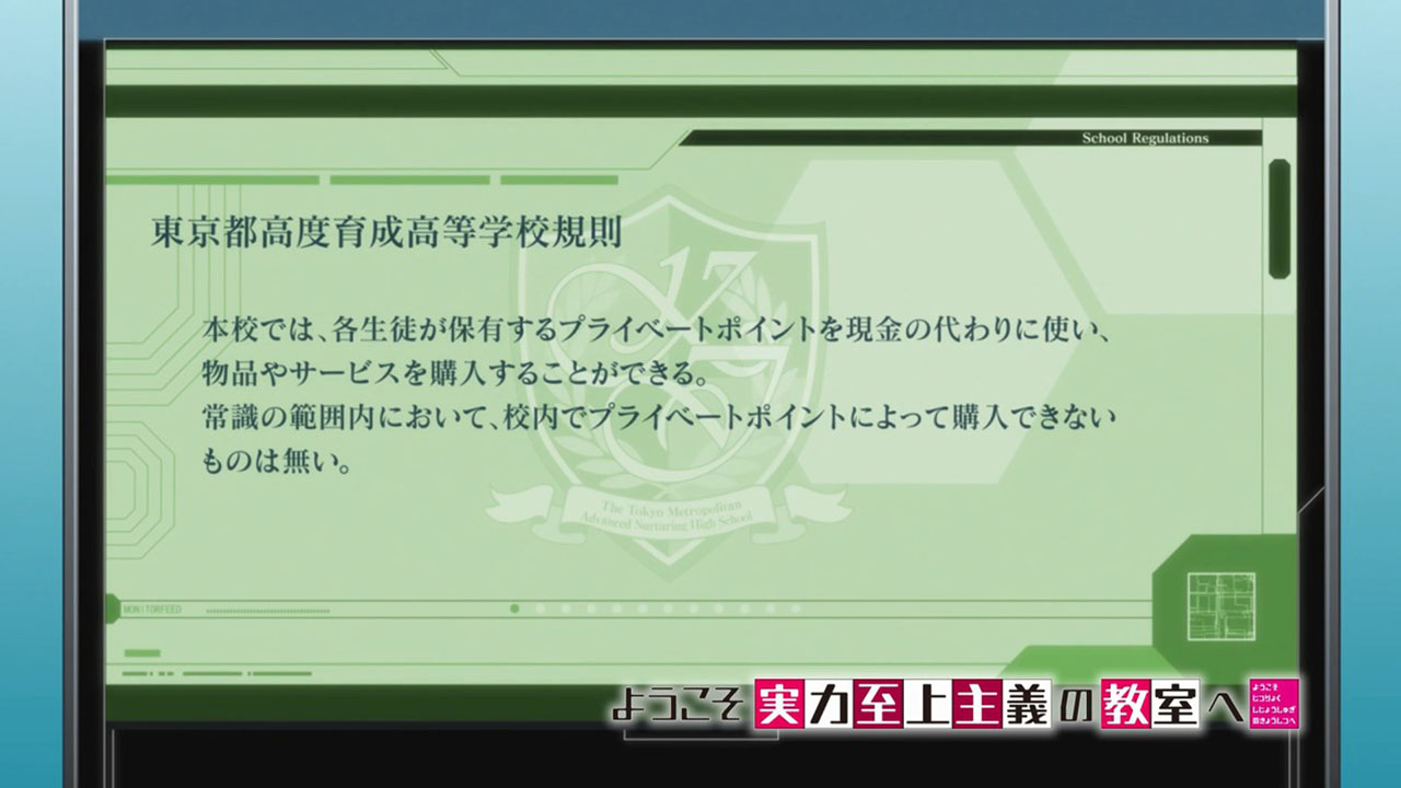 For some reason I keep getting serious Oregairu vibes from this show. The MC is basically Hikki on mellow drugs, there is a Hayama (also a soccer player to boot), is a Yui, a Yukino and a Hiratsuka-sensei. I can see how the system is supposed to work however. Allow the students to do whatever they want without reprimand and then punish them when they allow their discipline to slacken. This teaches you personal responsibility. Why did the teacher not say anything until the next month? It is an object lesson. We let you discipline yourself for a month and look how it’s turned out. Time to remember that you are students in an elite institution, not brats at a daycare. How much do you want to bet that some of the other classes have much better records simply because the student body is more self-disciplined? I think that was main objective of this scenario.Suspicious generosity also should be examined critically. Goods cost roughly the same in Yen as they do in points. How in blue blazes is the school supposed to be solvent if it gives out 100,000 Yen monthly? Also the MC noted that there should not be “free” items if everyone is basically drawing an allowance comparable to a part time wage. This teaches impulse control, critical thinking and personal responsibility. This is what happens when you spend with abandon and then lose your job. Surprise kiddos, you are now in a situation many adults dread being in.Collective punishment is a very common method, especially in the military, to build cohesiveness. You work as a team, get rewarded as a team and are punished as a team. Recidivists will quickly find themselves confronted by everyone else who is suffering for your screw ups. Hands up any working adult who has never been on either side of the equation? How many people can relate personal anecdotes on how you got shafted because someone else was not doing his job?