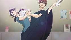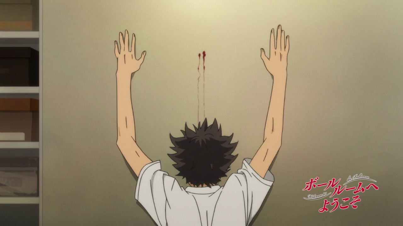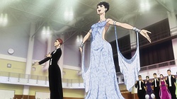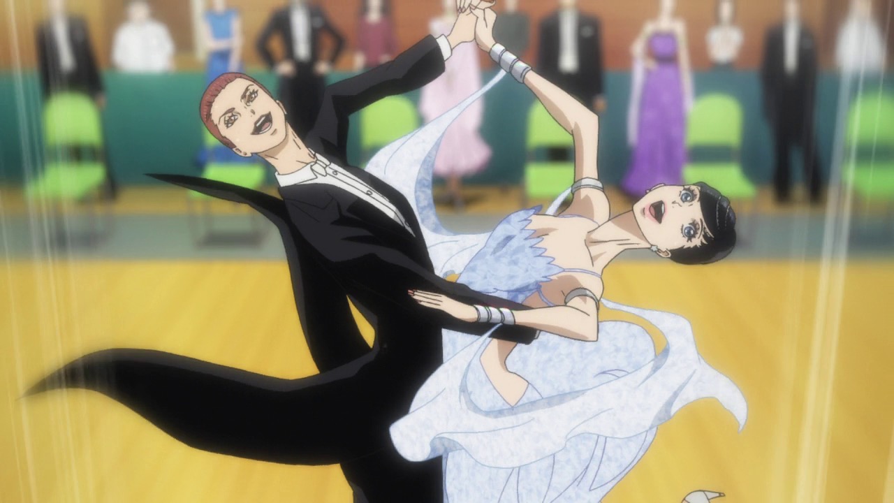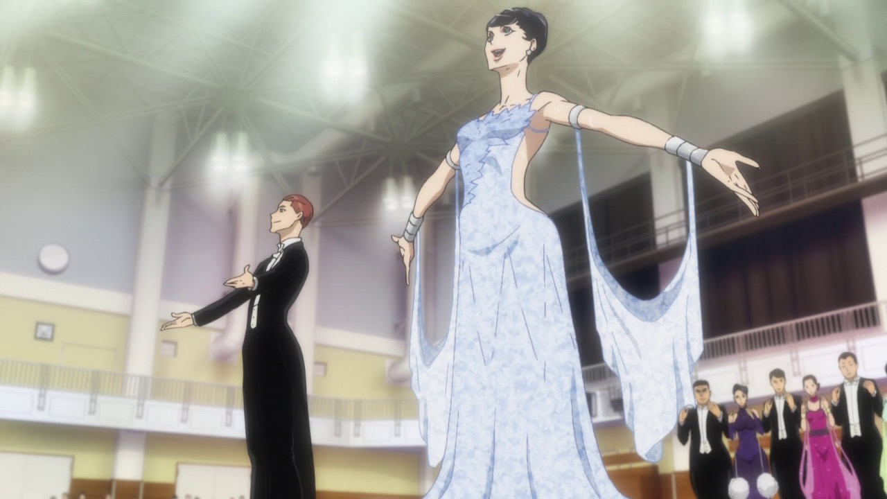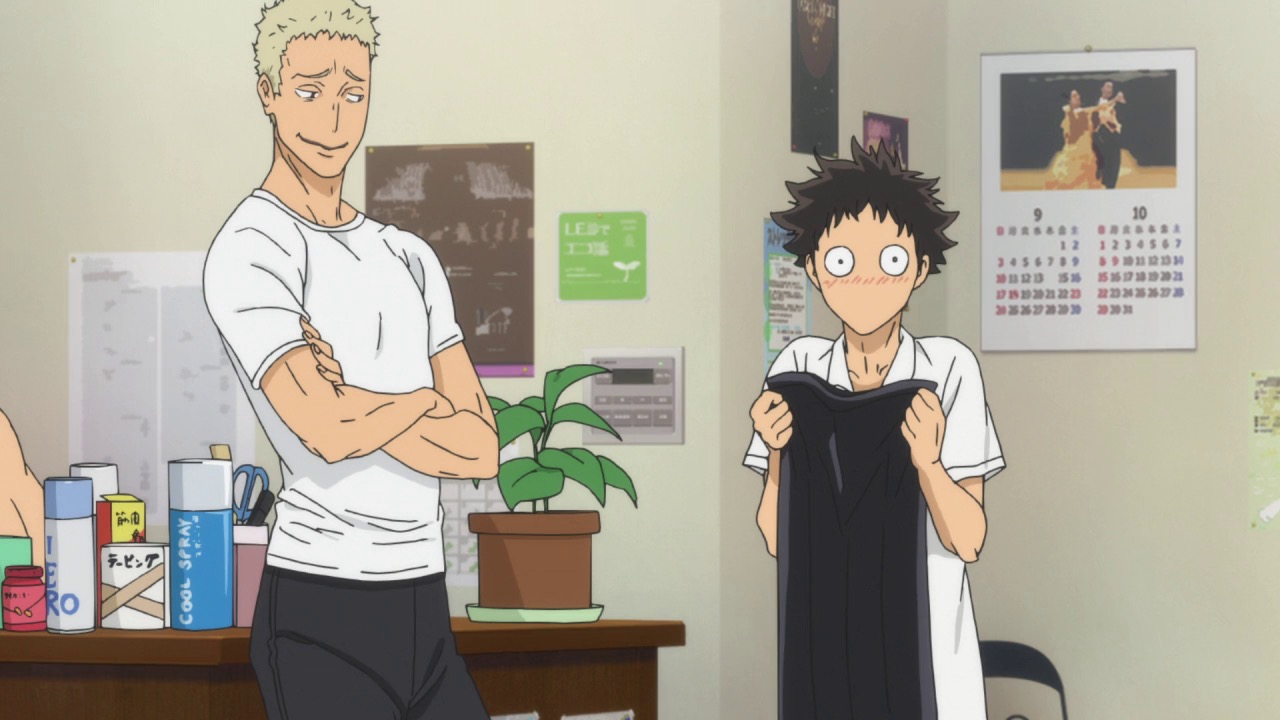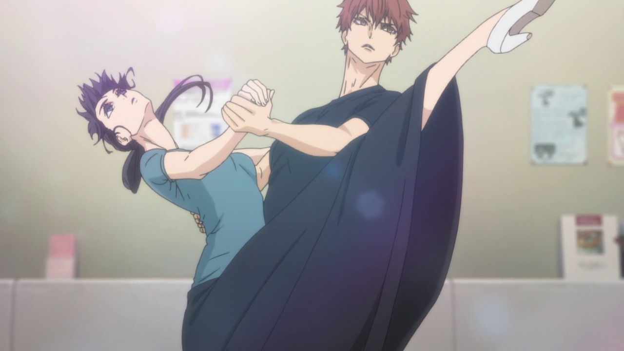 I’m going to be interested to see how this episode of Welcome to the Ballroom plays with the viewing public. Having seen the first two eps of the series at Anime Expo I already had a pretty firm opinion, namely that this ep was substantially better than the premiere (which was quite good in its own right). Stage-setting is hard, and sports shounen often seem to take a bit of time to find their stride.In the final analysis, I think expectations will have a lot to do with how this series is perceived. The notion of a series about ballroom dancing carries a whiff of something exotic and unusual (though dance manga have had a minor boomlet in recent years). But in point of fact, I think it becomes apparent quite quickly that Ballroom e Youkoso is quite a conventional story – Haikyuu!! is the obvious comparison but by no means the only one. Thing is, though, calling a show conventional is not a criticism. Chihayafuru is likewise a series that quickly reveals itself as fairly conventional despite its unusual premise, and even Boku no Hero Academia – while obviously not sports-themed – is a very traditional shounen in terms of structure.In the end it all comes down to execution. Are the production values strong? Check – Team Haikyuu!! is on the job. Is the main character relatable? Roger – Tatara has enough quirkiness and grit to lift him above what’s superficially a stock personality type. Is there a distinctive supporting cast? Is the core subject matter treated realistically, and does the work display a thorough knowledge of it? Do the original author and director have a sense of snappy dialogue and good pacing? Every bit of evidence suggests that the answer to all this questions is affirmative, and that makes Ballroom e Youkoso a good bet to succeed – probably winning itself multiple seasons of anime to adapt the manga in the process.More members of that supporting cast emerge as the story proper rolls into motion this week. First, Banba Karen (Kodaira Yuki) and Jinbo Tomochika (Horii Chado), the unlucky pair drafted by Sengoku-san to teach Tatara (they’re still students themselves, so his lessons are free). Inexperienced teachers and a student with poor concentration and no experience yield predictably disastrous results, but Tatara-kun’s spirit remains unbowed – especially when he sees Hyodo Kiyoharu (Okamoto Nobuhiko, admirably off-type) and Shizuku dancing together at an amateur competition (which they win).Kiyoharu is obviously an important character, the frival every good sports shounen needs. But he also represents something real and tangible in a way Sengoku doesn’t – Hyodo-kun is a boy Tatara’s own age, and he’s dancing with the girl Tatara is smitten with. Yet he’s also a stretch goal for sure – he already dances at a professional level (Shizuku claims even she’s not in his league, though there’s a degree of modesty in that I suspect), and even last year’s practice pants are too long for Fujita-kun. Kiyoharu is a fierce competitor but seemingly a flatliner when he’s not practicing or performing – you can see Tatara trying to psyche himself into believing the two of them are rivals, but the truth is that Tatara isn’t even a blip on Kiyoharu’s radar screen (yet).It’s going to be interesting to see how this triangle evolves over the course of Ballroom – will Kiyoharu wind up being effectively a co-male lead, as we have in Chihayafuru, or is he here mainly as a foil for Tatara? Again, Tatara tries to convince himself that Kiyoharu is spoiled, entitled – his family owns a dance studio and he’s been Shizuku’s partner since they were five years old – but the truth is, Kiyoharu busts his ass to be as good as he is. As for Tatara, his genius seems to be of the instinctive kind – explanations don’t do it for him but if he can watch, he can learn (and quickly). So much so, in fact, that he can already “shadow-dance” with Shizuku just from watching Kiyoharu do so a few times. There are already a lot of flags being hoisted in Ballroom e Youkoso, and they don’t all agree with each other – and to me, that makes the series that much more of an interesting prospect. Remember, conventional doesn’t have to mean predictable…